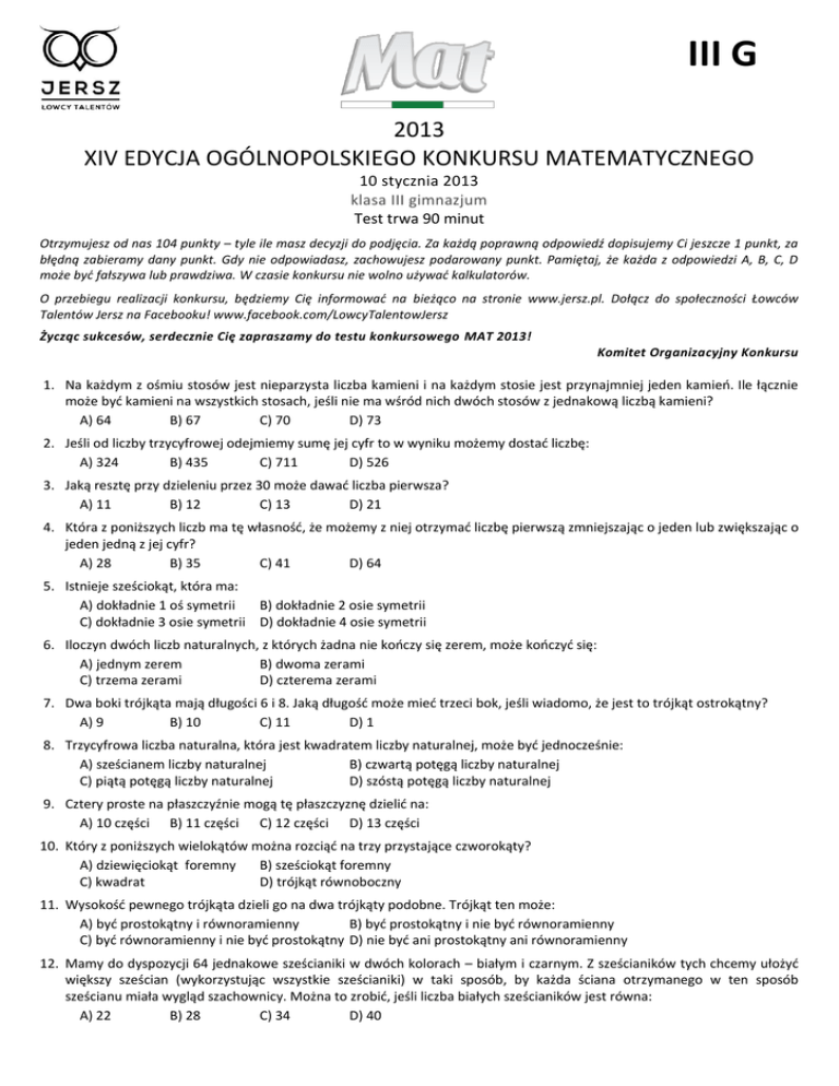 III G 2013 XIV EDYCJA OGÓLNOPOLSKIEGO KONKURSU MATEMATYCZNEGO 10 stycznia 2013 klasa III gimnazjum Test trwa 90 minut Otrzymujesz od nas 104 punkty – tyle ile masz decyzji do podjęcia. Za każdą poprawną odpowiedź dopisujemy Ci jeszcze 1 punkt, za błędną zabieramy dany punkt. Gdy nie odpowiadasz, zachowujesz podarowany punkt. Pamiętaj, że każda z odpowiedzi A, B, C, D może być fałszywa lub prawdziwa. W czasie konkursu nie wolno używać kalkulatorów. O przebiegu realizacji konkursu, będziemy Cię informować na bieżąco na stronie www.jersz.pl. Dołącz do społeczności Łowców Talentów Jersz na Facebooku! www.facebook.com/LowcyTalentowJersz Życząc sukcesów, serdecznie Cię zapraszamy do testu konkursowego MAT 2013! Komitet Organizacyjny Konkursu 1. Na każdym z ośmiu stosów jest nieparzysta liczba kamieni i na każdym stosie jest przynajmniej jeden kamień. Ile łącznie może być kamieni na wszystkich stosach, jeśli nie ma wśród nich dwóch stosów z jednakową liczbą kamieni? A) 64 B) 67 C) 70 D) 73 2. Jeśli od liczby trzycyfrowej odejmiemy sumę jej cyfr to w wyniku możemy dostać liczbę: A) 324 B) 435 C) 711 D) 526 3. Jaką resztę przy dzieleniu przez 30 może dawać liczba pierwsza? A) 11 B) 12 C) 13 D) 21 4. Która z poniższych liczb ma tę własność, że możemy z niej otrzymać liczbę pierwszą zmniejszając o jeden lub zwiększając o jeden jedną z jej cyfr? A) 28 B) 35 C) 41 D) 64 5. Istnieje sześciokąt, która ma: A) dokładnie 1 oś symetrii B) dokładnie 2 osie symetrii C) dokładnie 3 osie symetrii D) dokładnie 4 osie symetrii 6. Iloczyn dwóch liczb naturalnych, z których żadna nie kończy się zerem, może kończyć się: A) jednym zerem B) dwoma zerami C) trzema zerami D) czterema zerami 7. Dwa boki trójkąta mają długości 6 i 8. Jaką długość może mieć trzeci bok, jeśli wiadomo, że jest to trójkąt ostrokątny? A) 9 B) 10 C) 11 D) 1 8. Trzycyfrowa liczba naturalna, która jest kwadratem liczby naturalnej, może być jednocześnie: A) sześcianem liczby naturalnej B) czwartą potęgą liczby naturalnej C) piątą potęgą liczby naturalnej D) szóstą potęgą liczby naturalnej 9. Cztery proste na płaszczyźnie mogą tę płaszczyznę dzielić na: A) 10 części B) 11 części C) 12 części D) 13 części 10. Który z poniższych wielokątów można rozciąć na trzy przystające czworokąty? A) dziewięciokąt foremny B) sześciokąt foremny C) kwadrat D) trójkąt równoboczny 11. Wysokość pewnego trójkąta dzieli go na dwa trójkąty podobne. Trójkąt ten może: A) być prostokątny i równoramienny B) być prostokątny i nie być równoramienny C) być równoramienny i nie być prostokątny D) nie być ani prostokątny ani równoramienny 12. Mamy do dyspozycji 64 jednakowe sześcianiki w dwóch kolorach – białym i czarnym. Z sześcianików tych chcemy ułożyć większy sześcian (wykorzystując wszystkie sześcianiki) w taki sposób, by każda ściana otrzymanego w ten sposób sześcianu miała wygląd szachownicy. Można to zrobić, jeśli liczba białych sześcianików jest równa: A) 22 B) 28 C) 34 D) 40 13. Jaki może być największy wspólny dzielnik dwóch liczb naturalnych, których różnica wynosi 14? A) 3 B) 5 C) 7 D) 9 14. W pewnej klasie ponad 60% uczniów stanowią dziewczynki, zaś chłopcy stanowią więcej niż 35%. Ilu uczniów może być w tej klasie? A) 20 B) 25 C) 30 D) 35 15. Na płaszczyźnie dane są dwie proste oraz jeden punkt. Czy zawsze istnieje okrąg styczny do obu tych prostych i przechodzący przez dany punkt, jeśli: A) proste się przecinają, a punkt leży we wnętrzu kąta ostrego utworzonego przez te proste B) proste się przecinają, a punkt leży we wnętrzu kąta rozwartego utworzonego przez te proste C) proste są równoległe, a punkt leży pomiędzy tymi prostymi D) proste są równoległe, a punkt leży na jednej z tych prostych 16. Jaka może być długość obwodu trójkąta prostokątnego, którego wszystkie boki mają długości wyrażające się liczbami całkowitymi? A) 12 B) 18 C) 24 D) 30 17. Czy istnieje figura na płaszczyźnie, która ma: A) więcej niż jeden środek symetrii C) dwie nieprzecinające się osie symetrii B) więcej niż 2 środki symetrii D) środek symetrii i oś symetrii nie przechodzącą przez ten środek symetrii 18. Na ile sześcianów można rozciąć sześcian? A) 8 B) 27 C) 34 D) 100 19. Ile spośród kątów wewnętrznych sześciokąta może być kątami prostymi? A) 3 B) 4 C) 5 D) 6 20. Wiersze szachownicy 8×8 numerujemy liczbami od 1 do 8, podobnie numerujemy jej kolumny. Następnie na każdym polu kładziemy tyle ziaren pszenicy ile wynosi suma numeru wiersza i numeru kolumny tego pola. Liczba ziaren pszenicy, które w ten sposób ułożyliśmy na szachownicy jest: A) podzielna przez 32 B) podzielna przez 64 C) podzielna przez 128 D) podzielna przez 216 21. Jaką cyfrę dziesiątek może mieć liczba dwucyfrowa, która ma dokładnie siedem (dodatnich) dzielników? A) 6 B) 7 C) 8 D) 9 22. Jaka może być długość obwodu wielokąta, którego każde dwa sąsiednie boki są prostopadłe i którego każdy bok ma długość 1? A) 12 B) 16 C) 18 D) 20 23. Który z wymienionych poniżej czworokątów ma tę własność, że jeśli połączymy odcinkami środki jego kolejnych boków, to otrzymamy czworokąt o polu dwukrotnie mniejszym od pola wyjściowego czworokąta? A) kwadrat B) prostokąt nie będący kwadratem C) romb nie będący kwadratem D) równoległobok nie będący prostokątem ani rombem 24. Jaka może być miara kąta między dwusiecznymi dwóch kątów ostrych trójkąta rozwartokątnego? A) 30° B) 45° C) 60° D) 75° 25. Przekątne czworokąta dzielą go na cztery trójkąty. Pola trzech spośród tych trójkątów są równe 1, 3 i 6. Jakie może być pole czwartego trójkąta? A) 0,5 B) 1 C) 1,5 D) 2 26. Ile może być miesięcy w roku, w których wypadnie pięć piątków? A) 3 B) 4 C) 5 D) 6 PARTNERZY