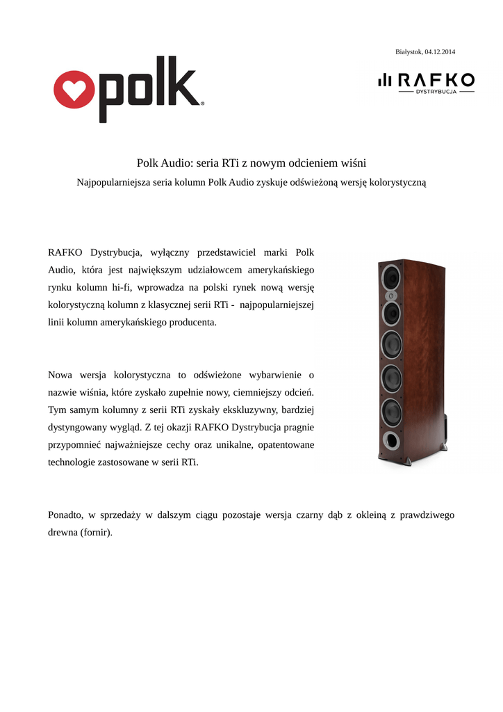 Białystok, 04.12.2014 Polk Audio: seria RTi z nowym odcieniem wiśni Najpopularniejsza seria kolumn Polk Audio zyskuje odświeżoną wersję kolorystyczną RAFKO Dystrybucja, wyłączny przedstawiciel marki Polk Audio, która jest największym udziałowcem amerykańskiego rynku kolumn hi-fi, wprowadza na polski rynek nową wersję kolorystyczną kolumn z klasycznej serii RTi - najpopularniejszej linii kolumn amerykańskiego producenta. Nowa wersja kolorystyczna to odświeżone wybarwienie o nazwie wiśnia, które zyskało zupełnie nowy, ciemniejszy odcień. Tym samym kolumny z serii RTi zyskały ekskluzywny, bardziej dystyngowany wygląd. Z tej okazji RAFKO Dystrybucja pragnie przypomnieć najważniejsze cechy oraz unikalne, opatentowane technologie zastosowane w serii RTi. Ponadto, w sprzedaży w dalszym ciągu pozostaje wersja czarny dąb z okleiną z prawdziwego drewna (fornir). Polk Audio RTi – najważniejsze cechy Obudowa: konstrukcja w technologii OSD (Optimal Shear Damping) zbudowana z 6 warstwowego laminatu w technologii DAHLI (Damped Asymmetric Hex Laminate Isolation) dla minimalnych zniekształceń dźwięku pochodzących od rezonansu ścian kolumny. Technologia łączenia 6 warstwowego laminatu została stworzona specjalnie na potrzeby Polk Audio, wygięta w kształcie liry dla ograniczenia zjawiska fal stojących, w kolumnach podłogowych wyposażona w opatentowaną technologię PowerPort PLUS opartą o dwa wyjścia bas-refleksu (frontowe i tylne) wewnętrzne użebrowanie w formie płyt dla redukcji turbulencji przepływajacego powietrza i zwiększenia efektywności basu, a także z zewnętrznym rozpraszaczem tylnego bas refleksu w celu zachowania stosunkowo stałego natężenia niskich tonów, bez względu na odległość kolumny od tylnej ściany, technologia PowerPort pozwala na podniesienie skuteczności basu do 3 decybeli oraz uniknięcie szmerów bas refleksu przy zbyt dużym ciśnieniu wewnątrz obudowy. Głośnik wysokotonowy 1 calowa (2.54cm) kopułka z kompozytu jedwabiu i polimerów. Głośnik w technologii Dynamic Balance oparty o magnes neodymowy z chłodzeniem ferrofluidowym z radiatorem; zamknięty w obudowie w formie stożka, obudowany rozpraszaczem w celu zmniejszenia zjawiska dyfrakcji dla bardziej otwartej, przestrzennej sceny dźwiękowej. Głośniki średniotonowe: przetworniki w opatentowanej technologii Dynamic Balance z membranami wykonanymi z kompozytu polimerów i minerałów mika z kauczukowym zawieszeniem (produkowanym metodą wtryskową) zamknięte w oddzielnej obudowie wentylowanej w opatentowanej technologii ARC (Acoustic Resonance Control) w celu usunięcia basowego podbicia średnich tonów oraz fal stojących dla czystych, naturalnych, prawidłowo przenoszonych wokali i dźwięków instrumentów Głośniki niskotonowe: przetworniki w technologii Dynamic Balance wyposażone w głęboko wychyłowe membrany z polimerów zaprojektowane do współpracy z system PowerPort Plus Zwrotnica: oparta o mylarowe kondensatory w celu lepszej ekspozycji wysokich tonów oraz zwiększenia transparentności dźwięku aby pokazać większą liczbę detali skonstruowana w technologii "Cascade Tapered Array", które zadaniem jest odfiltrowywanie głośników grających w tej samej częstotliwości, tak aby nie zachodziło zjawisko interferencji dźwięku, szczególnie dokuczliwe dla osób słuchających poza "sweet spotem". W skład serii RTi wchodzą kolumny: • podłogowe RTi A9 - 7595zł • podłogowe RTi A7 - 4995zł • podłogowe RTi A5 – 4095zł • centralna CSi A6 - 2095zł • centralna CSi A4 - 1365zł • surround F/Xi A6 - 2595zł • surround F/Xi A4 - 2095zł • podstawkowe/ścienne RTi A3 - 1995zł • podstawkowe/ścienne RTi A1 – 1575zł • podstawkowe/ścienne OWM5 – 995zł / podstawkowe/ścienne OWM3 – 1050zł Producent zaleca łączenie kolumn z serii RTi z głośnikami instalacyjnymi z serii RT. O marce Polk Audio. Od wielu lat Polk Audio jest liderem rynku hi-fi w Stanach Zjednoczonych - wraz ze swoją siostrzaną marką premium Definitive Technology kontroluje ponad 1/3 sprzedaży na rodzimym rynku. Firma od początku istnienia jest zlokalizowana w Baltimore. Jej dorobek to nie tylko sprzedaż liczona w kwocie ponad 100 milionów dolarów rocznie ale także ponad 65 patentów w branży audio oraz pozycja najważniejszego partnera Microsoftu w dziedzinie produktów audio oraz gamingowych. Aktualnie Polk Audio zatrudnia na stałe ponad 200 pracowników a wśród nich wielu zaciętych hobbystów: aktywnych muzyków, miłośników kina domowego, audiofilów, zwycięzców konkursów na najlepsze car audio, fanatyków wzmacniaczy lampowych i winyli. W Polk Audio spotykają się ludzie, którzy z jednej strony władają wiedzą na temat teorii muzyki, a z drugiej bezbłędnie rozumieją fizykę przetworników audio. "Polk is an American original, crafting audio experiences that deliver our iconic, engaging, authentic sound since 1972". Aktualnym ambasadorem marki Polk Audio jest kanadyjski zespół indie rock Walk Off The Earth (WOTE). Ponadto Polk Audio z racji produkcji słuchawek sportowych współpracuje z wieloma amerykańskimi sportowcami: futbolistą Torrey'em Smithem, piłkarką Heather Mitts, graczami NBA Rudym Gay'em, Thadem Youngiem. Polk Audio jest dorocznym wystawcą na największych światowych targach: gamingowych E3, instalatorskich CEDIA, elektroniki użytkowej CES Las Vegas oraz IFA w Berlinie. Więcej informacji: www.rafko.com www.polkaudio.rafko.pl Dodatkowych informacji udziela: Andrzej Lemański e-mail: [email protected] tel. (85) 747 97 58 W kwestiach technicznych produktów Polk Audio: Rafał Koc e-mail: [email protected] tel. (85) 747 97 51