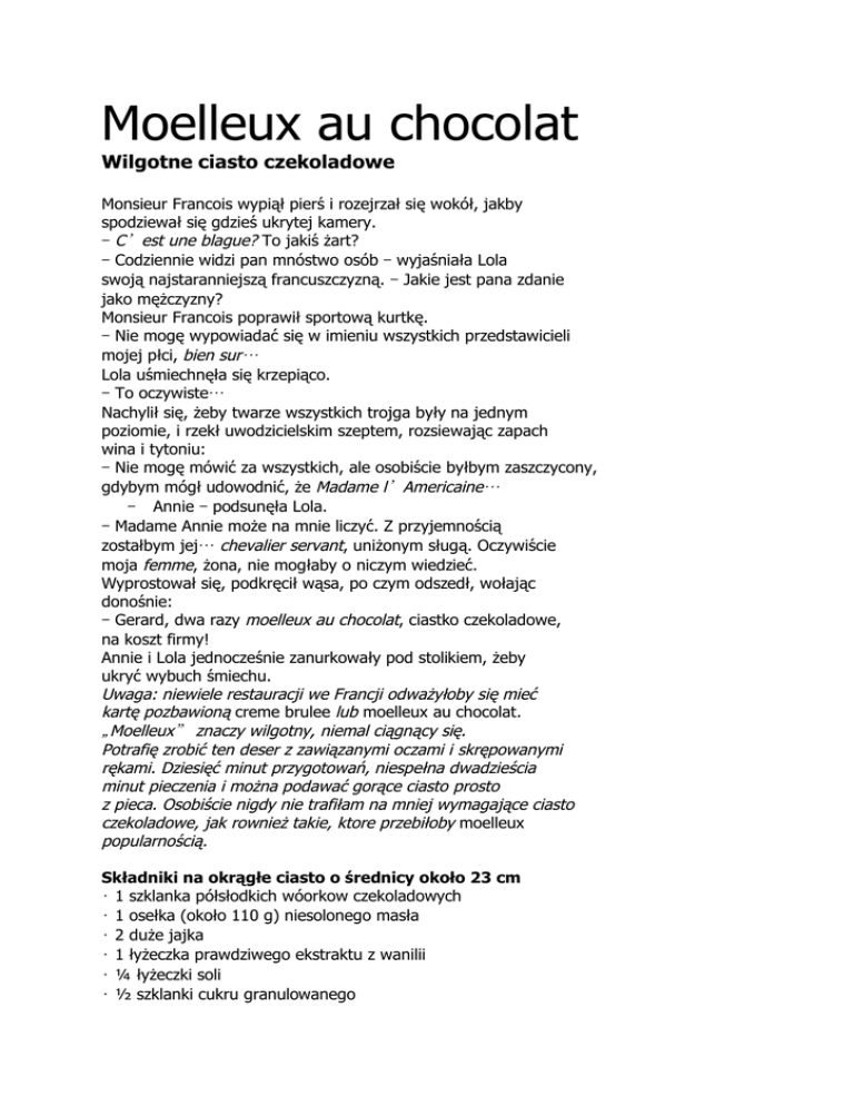 Moelleux au chocolat Wilgotne ciasto czekoladowe Monsieur Francois wypiął pierś i rozejrzał się wokół, jakby spodziewał się gdzieś ukrytej kamery. – C’est une blague? To jakiś żart? – Codziennie widzi pan mnóstwo osób – wyjaśniała Lola swoją najstaranniejszą francuszczyzną. – Jakie jest pana zdanie jako mężczyzny? Monsieur Francois poprawił sportową kurtkę. – Nie mogę wypowiadać się w imieniu wszystkich przedstawicieli mojej płci, bien sur… Lola uśmiechnęła się krzepiąco. – To oczywiste… Nachylił się, żeby twarze wszystkich trojga były na jednym poziomie, i rzekł uwodzicielskim szeptem, rozsiewając zapach wina i tytoniu: – Nie mogę mówić za wszystkich, ale osobiście byłbym zaszczycony, gdybym mógł udowodnić, że Madame l’Americaine… – Annie – podsunęła Lola. – Madame Annie może na mnie liczyć. Z przyjemnością zostałbym jej… chevalier servant, uniżonym sługą. Oczywiście moja femme, żona, nie mogłaby o niczym wiedzieć. Wyprostował się, podkręcił wąsa, po czym odszedł, wołając donośnie: – Gerard, dwa razy moelleux au chocolat, ciastko czekoladowe, na koszt firmy! Annie i Lola jednocześnie zanurkowały pod stolikiem, żeby ukryć wybuch śmiechu. Uwaga: niewiele restauracji we Francji odważyłoby się mieć kartę pozbawioną creme brulee lub moelleux au chocolat. „Moelleux” znaczy wilgotny, niemal ciągnący się. Potrafię zrobić ten deser z zawiązanymi oczami i skrępowanymi rękami. Dziesięć minut przygotowań, niespełna dwadzieścia minut pieczenia i można podawać gorące ciasto prosto z pieca. Osobiście nigdy nie trafiłam na mniej wymagające ciasto czekoladowe, jak rownież takie, ktore przebiłoby moelleux popularnością. Składniki na okrągłe ciasto o średnicy około 23 cm • 1 szklanka półsłodkich wóorkow czekoladowych • 1 osełka (około 110 g) niesolonego masła • 2 duże jajka • 1 łyżeczka prawdziwego ekstraktu z wanilii • ¼ łyżeczki soli • ½ szklanki cukru granulowanego • ½ szklanki jasnego cukru trzcinowego • ½ szklanki mielonych migdałów (Prażone migdały całkowicie zmieniłyby smak. Migdałowa nuta jest ledwo wyczuwalna w cieście, choć mielone migdały zastępują mąkę, nadając ciastu niezwykłej konsystencji). ½ szklanki skrobi kukurydzianej albo – najlepiej – mąki ziemniaczanej. Sposób przyrządzania 1. Włóż osełkę masła i wiórki czekoladowe do nadającego się do użycia w mikrofalówce naczynia i włącz kuchenkę dokładnie na 1 minutę. Potem mieszaj, aż masa stanie się gładka. Jeśli nie chce się zrobić gładka, podgrzej jeszcze przez kilka sekund i znowu zamieszaj. 2. Rozgrzej piekarnik do 180°C. 3. W średniej wielkości misce ubij jajka, potem dodaj cukier granulowany i trzcinowy. Wymieszaj porządnie. Dodaj sól i wanilię. 4. Dodaj masę maślano-czekoladową do masy jajeczno-cukrowej. Ubijaj, aż nowa masa będzie jednolita. Dodaj mielone migdały i mąkę ziemniaczaną. Wymieszaj porządnie. 5. Natłuść tortownicę o średnicy około 23 centymetrów. Wyłóż spod papierem do pieczenia i rozsmaruj odrobinę masła na papierze. 6. Wlej masę do przygotowanej tortownicy. 7. Włóż tortownicę do piekarnika. Po 25 minutach wsuń ostrze noża lub patyczek w środek ciasta. Nie powinien po wyjęciu być ani kompletnie usmarowany mazią (ciasto niedopieczone i absolutnie pyszne, ale mój strach przed salmonellą nieco studzi uwielbienie dla płynnego środka), ani czysty (ciasto wyschnięte na proch), ale tak jakoś pomiędzy. Podawaj ciasto w temperaturze pokojowej lub lekko ciepłe, najlepiej z gałką lodów waniliowych, bo wtedy efekt jest oszałamiający. Pâtes ŕ la carbonara Pasta carbonara – Wydaje mi się, że Althea nie unika Lucasa, tylko mojego jedzenia. – Jak to? – Wczoraj powiedziała, że będzie siadała z nami do stołu pod warunkiem, że będzie mogła jeść swoje jedzenie. Twierdzi, że moje posiłki jej nie służą. Dziwne, ale trudno. Wolę to, ronu z wędzonym boczkiem i jajkami, a potem spuszczała ją w kiblu jak dwa dni temu. – Tak zrobiła? – Lola zdawała się zszokowana. – Kawałki boczku nie utonęły. Pewnie tłuszcz sprawił, że wypłynęły z powrotem. Taka mała ciekawostka. Powiedziałam Althei, że zauważyłam, że wyrzuca jedzenie, że nie jestem taka tępa. Lola zamyśliła się na chwilę. – Wyrzuca przed spożyciem czy po nim? – Zamiast dodawać ser do i tak już wysokokalorycznej potrawy, wolę osobno podać starty parmezan. To danie łatwe do przyrządzenia i stanowi najczystszą formę prostego, domowego posiłku. Natomiast zdecydowanie nie jest koszerne, wegańskie, bezmleczne czy bezglutenowe. Przyczyni się do zwężenia naczyń krwionośnych. Niektórzy nie powinni go jeść ze względu na obecność surowych jaj. Hmm, jak go nie kochać? Składniki na 4 porcje • 1 szklanka pokrojonego w kostkę boczku pancetta (tradycyjny francuski przepis zawiera lardons, smalczyk, ale ja używam zamiast niego pancetty). • 1 duża szalotka, obrana, drobno siekana • 2 jajka absolutnej świeżości (same żółtka) • ½ szklanki gęstej śmietany • ½ szklanki parmezanu (najlepiej tartego) • 1/3 szklanki drobno posiekanego szczypiorku lub pietruszki (do wyboru) • czarny pieprz i sól • świeżo zrobiony lub kupny makaron: linguini albo spaghetti Sposób przyrządzania 1. Wrzuć pokrojoną w kostkę pancettę na patelnię i smaż, aż zrobi się złocista. 2. Zmniejsz grzanie i dodaj posiekaną szalotkę. Mieszaj i smaż, aż szalotka się zeszkli; nie może się zezłocić! 3. Dodaj śmietanę i czarny pieprz, porządnie wymieszaj i spróbuj. Pancetta zawiera zazwyczaj wystarczającą ilość soli dla tej potrawy, ale możesz dosolić do smaku. Ponieważ makaron gotuje się w osolonej wodzie i będziesz też dodawać parmezan, sos łatwo przesolić, więc uważaj. 4. Trzymaj sos na najmniejszym grzaniu, żeby śmietana się