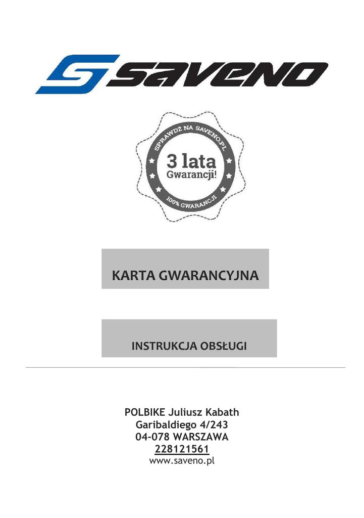 KARTA GWARANCYJNA INSTRUKCJA OBSŁUGI POLBIKE Juliusz Kabath Garibaldiego 4/243 04-078 WARSZAWA 228121561 www.saveno.pl INSTRUKCJA OBSŁUGI WRAZ Z WARUNKAMI GWARANCJI Uwaga do rodziców/opiekunów: Jako rodzic/opiekun jesteś odpowiedzialny za bezpieczeństwo Twojego dziecka, dlatego zanim Twoje dziecko po raz pierwszy wsiądzie na rower upewnij się, że: • zakupiony rower jest odpowiednio dobrany dla Twojego dziecka; to znaczy, że jest dopasowany do jego wzrostu i używany zgodnie z jego przeznaczeniem oraz, że jest sprawny technicznie; • Ty i Twoje dziecko znacie i rozumiecie zasady funkcjonowania roweru oraz potraficie go bezpiecznie obsługiwać; • Ty i Twoje dziecko nie tylko znacie, rozumiecie i przestrzegacie obowiązujących przepisów prawa drogowego, lecz także, zgodnie ze „zdrowym rozsądkiem”, zamierzacie bezpiecznie i odpowiedzialnie korzystać z roweru. Jako rodzic/opiekun powinieneś przeczytać tę instrukcję razem z Twoim dzieckiem i zwrócić szczególną uwagę na wszystkie ostrzeżenia i wskazówki zanim pozwolisz dziecku korzystać z roweru. Niektóre reguły są oczywiste dla osób dorosłych, mimo wszystko jednak wymaga się, aby rodzice/opiekunowie zapoznali z nimi swoje dzieci. Ostrzeżenie! Upewnij się, że Twoje dziecko zawsze nosi odpowiednio dopasowany i atestowany kask rowerowy podczas jazdy na rowerze, wkłada go zanim wsiądzie na rower i zdejmuje, kiedy z niego nie korzysta. Niedostosowanie się do tego ostrzeżenia może spowodować ciężkie uszkodzenie ciała dziecka lub w skrajnych przypadkach nawet jego śmierć. ROZDZIAŁ I – UWAGI OGÓLNE Ostrzeżenie! Niewłaściwe użytkowanie roweru lub użytkowanie niezgodne z jego przeznaczeniem może wiązać się z niebezpieczeństwem i narazić Cię na utratę zdrowia lub życia. Jeżeli masz wątpliwości, czy przeznaczenie roweru odpowiada Twojemu stylowi jazdy – zapytaj sprzedawcę. Wskazówka! Zalecamy, abyś przeczytał tę instrukcję w całości przed Twoją pierwszą jazdą na zakupionym rowerze i upewnił się, że rozumiesz każdy zawarty w niej punkt. W przypadku jakiejkolwiek niejasności, odnieś się ponownie do poszczególnych rozdziałów albo skontaktuj się ze sprzedawcą lub producentem. A. Dopasowanie roweru Sprawdź do jakiej kategorii należy Twój rower i jakie jest jego przeznaczenie –patrz poniższa tabela: MODEL Rower z kołami 12’’ i 16” Rower z kołami 20’’ Rower z kołami 24’’ Rower z kołami 26” Rower z kołami 28’’ ZASTOSOWANIE Rower przeznaczony do użytku przez dzieci do jazdy po drogach asfaltowych oraz po powierzchniach nieutwardzonych Rower przeznaczony do jazdy po drogach asfaltowych, po nawierzchniach nieutwardzonych z umiarkowanymi podjazdami i zjazdami Uwaga! Żaden z wymienionych powyżej modeli rowerów nie jest przeznaczony do jazdy ekstremalnej lub wyczynowej. Sprawdź, czy Twój rower jest odpowiedniej wielkości. Aby się upewnić – patrz rozdz. III A. Jeśli Twój rower będzie dla Ciebie zbyt duży, albo zbyt mały, możesz stracić nad nim kontrolę i przewrócić się. Upewnij się, czy Twój ciężar ciała nie przekracza maksymalnego dopuszczalnego obciążenia roweru zalecanego przez producenta. Aby to sprawdzić - patrz rozdz. III B. Sprawdź, czy siodło jest na prawidłowej wysokości. Jeśli regulujesz wysokość siodła samodzielnie upewnij się, że działasz zgodnie z instrukcja dotyczącą maksymalnego wysunięcia wspornika – patrz rozdz. III C. Sprawdź, czy siodło i wspornik siodła są dokładnie i stabilnie złączone. Prawidłowo zamontowane siodełko nie pozwoli na jego przesunięcie w żadnym kierunku. Żeby się upewnić - zobacz rozdz. III C. Sprawdź, czy wspornik kierownicy, kierownica i chwyty roweru są na odpowiedniej wysokości. Jeżeli masz wątpliwość sprawdź, jak możesz je dopasować – rozdz. III D. Upewnij się, czy pozycja klamek hamulcowych jest wygodna i czy możesz swobodnie operować hamulcami. Jeżeli nie, sprawdź czy możesz dostosować ich kąt nachylenia i odległość od kierownicy - szczegóły w sekcji III E i III F. Sprawdź, czy w pełni rozumiesz jak operować rowerem. Jeżeli nie masz pewności, poproś sprzedawcę, aby przed pierwszą jazdą wyjaśnił Ci wszystkie niezrozumiałe funkcje roweru. B. Przede wszystkim bezpieczeństwo Przed rozpoczęciem jazdy na rowerze zawsze zakładaj atestowany kask rowerowy przestrzegając wytycznych producenta dotyczących jego dopasowania, użytkowania i konserwacji. Bezwzględnie zapoznaj się z przepisami ruchu drogowego obowiązującymi na obszarze jazdy rowerem. Ich przestrzeganie należy do Twoich obowiązków. Sprawdź, czy koła w Twoim rowerze są prawidłowo zamocowane – patrz rozdz. III G. Jeżeli Twój rower posiada koła mocowane za pomocą szybkozamykaczy upewnij się, że wiesz, jak poprawnie nimi operować. Jazda z nieprawidłowo wyregulowanym zaciskiem i zamocowanym kołem może spowodować odpadnięcie koła od roweru, a w konsekwencji doprowadzić do wypadku. Upewnij się, czy Twój rower wyposażony jest w przerzutki. Jeżeli tak, zapoznaj się z ich rodzajem i zasadami prawidłowego użytkowania biegów w rowerze – rozdz. IV B. Sprawdź, w jakie pedały wyposażony jest Twój rower – patrz rozdz. IV C. Jeżeli Twój rower posiada pedały zatrzaskowe lub pedały z noskami, upewnij się, że wiesz, jak bezpiecznie z nich korzystać - sekcja IV C 2 i 3. Wymagają one szczególnych technik i umiejętności jazdy. Koniecznie zapoznaj się i przestrzegaj instrukcji producenta dotyczącej ich użytkowania, regulacji i konserwacji. Sprawdź, czy Twój rower posiada zawieszenie. Jeżeli tak, upewnij się, jaki typ. Amortyzatory mogą zmienić sposób działania roweru i wpłynąć na charakter jazdy, dlatego zapoznaj się z rozdz. IV D. Zawsze przestrzegaj instrukcji producenta amortyzatorów dotyczącej ich użytkowania, regulacji i konserwacji. C. Kontrola stanu technicznego roweru Przed każdą jazdą d