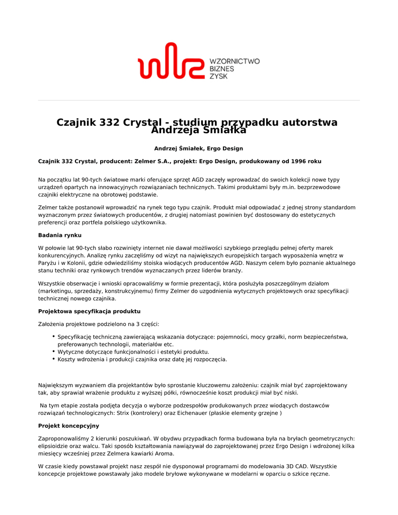 Czajnik 332 Crystal - studium przypadku autorstwa Andrzeja Śmiałka Andrzej Śmiałek, Ergo Design Czajnik 332 Crystal, producent: Zelmer S.A., projekt: Ergo Design, produkowany od 1996 roku Na początku lat 90-tych światowe marki oferujące sprzęt AGD zaczęły wprowadzać do swoich kolekcji nowe typy urządzeń opartych na innowacyjnych rozwiązaniach technicznych. Takimi produktami były m.in. bezprzewodowe czajniki elektryczne na obrotowej podstawie. Zelmer także postanowił wprowadzić na rynek tego typu czajnik. Produkt miał odpowiadać z jednej strony standardom wyznaczonym przez światowych producentów, z drugiej natomiast powinien być dostosowany do estetycznych preferencji oraz portfela polskiego użytkownika. Badania rynku W połowie lat 90-tych słabo rozwinięty internet nie dawał możliwości szybkiego przeglądu pełnej oferty marek konkurencyjnych. Analizę rynku zaczęliśmy od wizyt na największych europejskich targach wyposażenia wnętrz w Paryżu i w Kolonii, gdzie odwiedziliśmy stoiska wiodących producentów AGD. Naszym celem było poznanie aktualnego stanu techniki oraz rynkowych trendów wyznaczanych przez liderów branży. Wszystkie obserwacje i wnioski opracowaliśmy w formie prezentacji, która posłużyła poszczególnym działom (marketingu, sprzedaży, konstrukcyjnemu) firmy Zelmer do uzgodnienia wytycznych projektowych oraz specyfikacji technicznej nowego czajnika. Projektowa specyfikacja produktu Założenia projektowe podzielono na 3 części: Specyfikację techniczną zawierającą wskazania dotyczące: pojemności, mocy grzałki, norm bezpieczeństwa, preferowanych technologii, materiałów etc. Wytyczne dotyczące funkcjonalności i estetyki produktu. Koszty wdrożenia i produkcji czajnika oraz datę jej rozpoczęcia. Największym wyzwaniem dla projektantów było sprostanie kluczowemu założeniu: czajnik miał być zaprojektowany tak, aby sprawiał wrażenie produktu z wyższej półki, równocześnie koszt produkcji miał być niski. Na tym etapie została podjęta decyzja o wyborze podzespołów produkowanych przez wiodących dostawców rozwiązań technologicznych: Strix (kontrolery) oraz Eichenauer (płaskie elementy grzejne ) Projekt koncepcyjny Zaproponowaliśmy 2 kierunki poszukiwań. W obydwu przypadkach forma budowana była na bryłach geometrycznych: elipsioidzie oraz walcu. Taki sposób kształtowania nawiązywał do zaprojektowanej przez Ergo Design i wdrożonej kilka miesięcy wcześniej przez Zelmera kawiarki Aroma. W czasie kiedy powstawał projekt nasz zespół nie dysponował programami do modelowania 3D CAD. Wszystkie koncepcje projektowe powstawały jako modele bryłowe wykonywane w modelarni w oparciu o szkice ręczne. Zważywszy na krótki czas realizacji, prezentacja koncepcji w formie ręcznie wykonywanych modeli, wymagała ogromnego wysiłku i zaangażowania całego zespołu projektowego. Wybór koncepcji przeznaczonej do dalszych prac Analiza przeprowadzona przez zespół wdrożeniowy Zelmer wykazała, że zdecydowanie bardziej interesująca jest koncepcja opartą na walcu. Podkreślono, iż taki sposób kształtowania jest znacznie bardziej korzystny zarówno ze względu na konstrukcję wyrobu, jak i jego estetykę i funkcjonalność. Szczególnie wysoko oceniony został pomysł zastosowania wykonanej z cienkiej blachy nierdzewnej ozdobnej osłony dolnej części korpusu. W wytycznych do dalszego etapu prac wskazano konieczność zamknięcia uchwytu, w taki sposób, aby możliwe było prowadzenie w jego wnętrzu rurki parowej oraz przewodów. Taka zmiana w istotny sposób wpłynęła na wygląd czajnika. Projekt wzorniczy W ramach tego etapu wykonano korekty oraz zaprojektowano wszystkie zewnętrzne detale urządzenia zgodnie z specyfikacją wybranej koncepcji. Zaproponowaliśmy m.in. wykonanie wskaźnika poziomu wody metodą wtrysku dwukomponentowego, wówczas nowatorską. Kolejną nowością było zaprojektowanie pokrywy w taki sposób, aby możliwe było napełnianie czajnika bez jej otwierania, a jednocześnie wlewana woda przelewała się przez filtr zamontowany poniżej. Projekt zaprezentowano w formie finalnego modelu wzorniczego wraz z opisem kolorystyki, oznaczeń graficznych i fakturowania powierzchni. Konstrukcja wyrobu i wdrożenie W czasie gdy my pracowaliśmy nad korektami wzorniczymi, zespół konstruktorów próbował opracować rozwiązanie sterownika oraz płaskiej grzałki zintegrowanej z dnem czajnika. Okazało się że przeprowadzenie całego procesu badawczo –rozwojowego niezbędnego do spełnienia wszystkich założeń oraz opisanych w normach parametrów wymagało nakładów znacznie wykraczających poza budżet i czas realizacji projektu. Zdecydowano o zastosowaniu gotowych podzespołów oferowanych przez firmy Strix i Eichenauer. Niestety oferowane gotowe podzespoły nie mieściły się zaproponowanym przez Ergo Design w gabarycie podstawy. Konieczna była zatem zmiana wymiarów czajnika. Konieczność kompromisu nie przeszkodziła jednak zachować zadowalające proporcje bryły. Udoskonalenie i zatwierdzenie ostatecznej wersji produktu Kompletna dokumentacja konstrukcyjna wyrobu posłużyła do produkcji serii prototypów. Prototypy wykonano z żywic poliuretanowych w technologii Heck. Prototypowe egzemplarze przeszły następnie serię badań wykonanych w laboratorium Zelmera. Na ich podstawie przekazano zespołowi wdrożeniowemu informacje na temat koniecznych zmian w konstrukcji wyrobu. Skorygowana dokumentacja posłużyła do wykonania ostatecznego prototypu, ponownie przebadanego w laboratorium. Tym razem z wynikiem pozytywnym. Decyzję o zleceniu wykonania narzędzi produkcyjnych podjęto 6 miesięcy od momentu rozpoczęcia projektu. 3. Efekt: 332_Crystal to pierwszy czajnik marki Zelmer, który posiada obrotową podstawkę umożliwiającą dowolne odkładanie urządzenia. Spośród wcześniejszych produktów tej marki 332 Crystal wyróżniał się ponadto dodatkowym wyposażenie