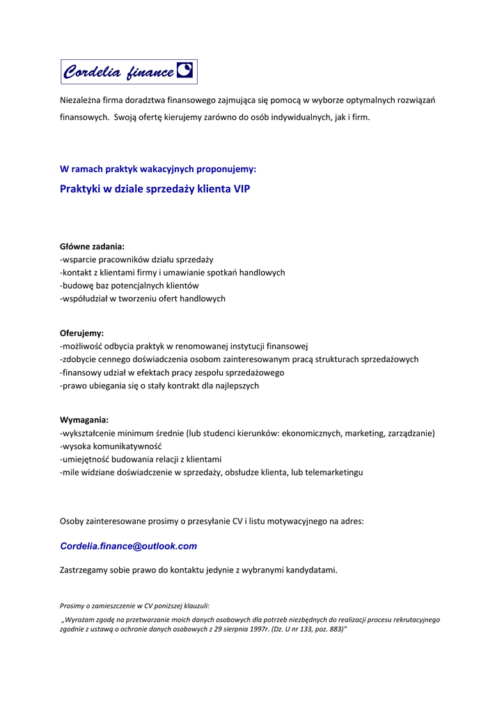 Niezależna firma doradztwa finansowego zajmująca się pomocą w wyborze optymalnych rozwiązań finansowych. Swoją ofertę kierujemy zarówno do osób indywidualnych, jak i firm. W ramach praktyk wakacyjnych proponujemy: Praktyki w dziale sprzedaży klienta VIP Główne zadania: -wsparcie pracowników działu sprzedaży -kontakt z klientami firmy i umawianie spotkań handlowych -budowę baz potencjalnych klientów -współudział w tworzeniu ofert handlowych Oferujemy: -możliwość odbycia praktyk w renomowanej instytucji finansowej -zdobycie cennego doświadczenia osobom zainteresowanym pracą strukturach sprzedażowych -finansowy udział w efektach pracy zespołu sprzedażowego -prawo ubiegania się o stały kontrakt dla najlepszych Wymagania: -wykształcenie minimum średnie (lub studenci kierunków: ekonomicznych, marketing, zarządzanie) -wysoka komunikatywność -umiejętność budowania relacji z klientami -mile widziane doświadczenie w sprzedaży, obsłudze klienta, lub telemarketingu Osoby zainteresowane prosimy o przesyłanie CV i listu motywacyjnego na adres: [email protected] Zastrzegamy sobie prawo do kontaktu jedynie z wybranymi kandydatami. Prosimy o zamieszczenie w CV poniższej klauzuli: „Wyrażam zgodę na przetwarzanie moich danych osobowych dla potrzeb niezbędnych do realizacji procesu rekrutacyjnego zgodnie z ustawą o ochronie danych osobowych z 29 sierpnia 1997r. (Dz. U nr 133, poz. 883)”