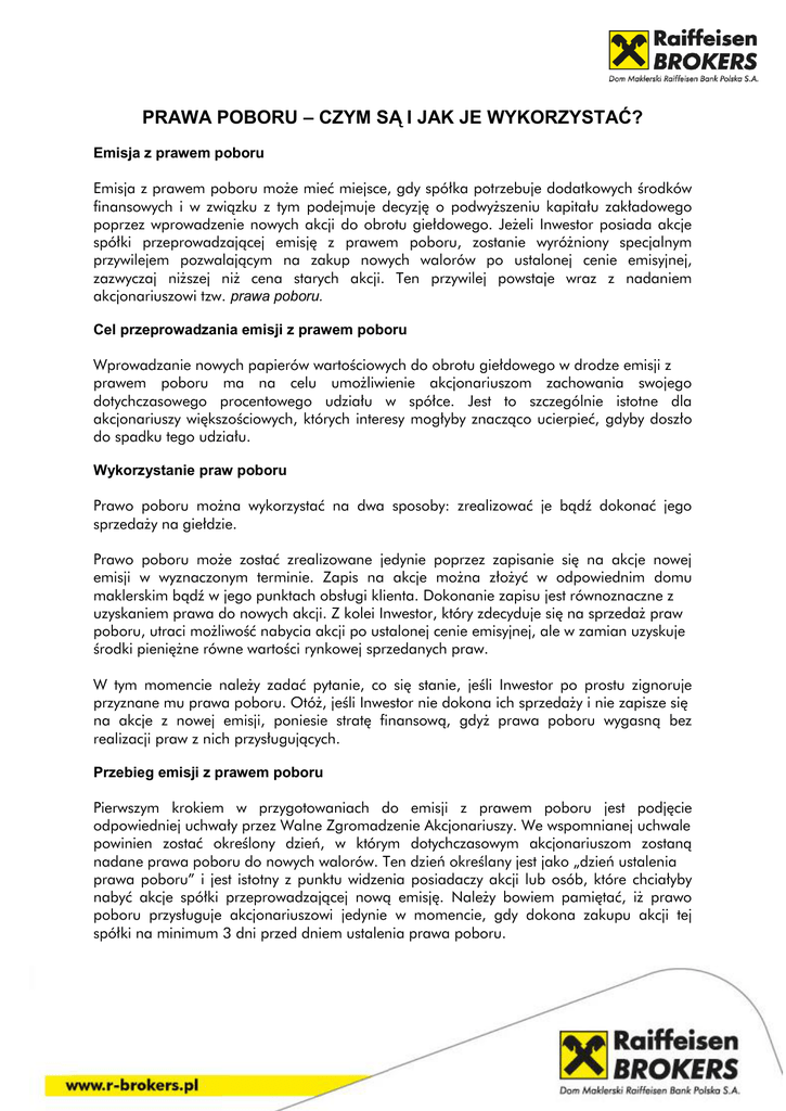 PRAWA POBORU – CZYM SĄ I JAK JE WYKORZYSTAĆ? Emisja z prawem poboru Emisja z prawem poboru może mieć miejsce, gdy spółka potrzebuje dodatkowych środków finansowych i w związku z tym podejmuje decyzję o podwyższeniu kapitału zakładowego poprzez wprowadzenie nowych akcji do obrotu giełdowego. Jeżeli Inwestor posiada akcje spółki przeprowadzającej emisję z prawem poboru, zostanie wyróżniony specjalnym przywilejem pozwalającym na zakup nowych walorów po ustalonej cenie emisyjnej, zazwyczaj niższej niż cena starych akcji. Ten przywilej powstaje wraz z nadaniem akcjonariuszowi tzw. prawa poboru. Cel przeprowadzania emisji z prawem poboru Wprowadzanie nowych papierów wartościowych do obrotu giełdowego w drodze emisji z prawem poboru ma na celu umożliwienie akcjonariuszom zachowania swojego dotychczasowego procentowego udziału w spółce. Jest to szczególnie istotne dla akcjonariuszy większościowych, których interesy mogłyby znacząco ucierpieć, gdyby doszło do spadku tego udziału. Wykorzystanie praw poboru Prawo poboru można wykorzystać na dwa sposoby: zrealizować je bądź dokonać jego sprzedaży na giełdzie. Prawo poboru może zostać zrealizowane jedynie poprzez zapisanie się na akcje nowej emisji w wyznaczonym terminie. Zapis na akcje można złożyć w odpowiednim domu maklerskim bądź w jego punktach obsługi klienta. Dokonanie zapisu jest równoznaczne z uzyskaniem prawa do nowych akcji. Z kolei Inwestor, który zdecyduje się na sprzedaż praw poboru, utraci możliwość nabycia akcji po ustalonej cenie emisyjnej, ale w zamian uzyskuje środki pieniężne równe wartości rynkowej sprzedanych praw. W tym momencie należy zadać pytanie, co się stanie, jeśli Inwestor po prostu zignoruje przyznane mu prawa poboru. Otóż, jeśli Inwestor nie dokona ich sprzedaży i nie zapisze się na akcje z nowej emisji, poniesie stratę finansową, gdyż prawa poboru wygasną bez realizacji praw z nich przysługujących. Przebieg emisji z prawem poboru Pierwszym krokiem w przygotowaniach do emisji z prawem poboru jest podjęcie odpowiedniej uchwały przez Walne Zgromadzenie Akcjonariuszy. We wspomnianej uchwale powinien zostać określony dzień, w którym dotychczasowym akcjonariuszom zostaną nadane prawa poboru do nowych walorów. Ten dzień określany jest jako „dzień ustalenia prawa poboru” i jest istotny z punktu widzenia posiadaczy akcji lub osób, które chciałyby nabyć akcje spółki przeprowadzającej nową emisję. Należy bowiem pamiętać, iż prawo poboru przysługuje akcjonariuszowi jedynie w momencie, gdy dokona zakupu akcji tej spółki na minimum 3 dni przed dniem ustalenia prawa poboru. Ważnym etapem w procesie przeprowadzania emisji z prawem poboru jest także ustalenie tzw. teoretycznej wartości prawa poboru. Jest ona niezwykle istotna, gdyż właśnie o tę kwotę zostanie skorygowany rynkowy kurs starych akcji na pierwszej sesji giełdowej po ostatnim dniu, w którym można dokonać zakupu akcji z prawem poboru. Teoretyczna wartość prawa poboru zależy od różnicy pomiędzy rynkową ceną starych akcji i emisyjną ceną nowych akcji oraz od liczby praw koniecznych do objęcia jednej nowej akcji. Przedstawia ją następujący wzór: gdzie: V – wartość teoretyczna prawa poboru M – cena rynkowa starych akcji S – cena emisyjna nowych akcji N – ilość praw poboru upoważniających do objęcia 1 nowej akcji (źródło: bossa.pl) Przykład: Spółka X przeprowadza emisję akcji z prawem poboru. Liczba akcji tej spółki znajdujących się w obrocie giełdowym wynosi 1 000 000. Na giełdę zostanie wprowadzone 500 000 nowych akcji tej spółki. Każdy akcjonariusz tej spółki otrzyma 1 prawo poboru na każdą akcje. Oznacza to, iż do zakupu 1 akcji z nowej emisji niezbędne są 2 prawa poboru (1 000 000 : 500 000). Rynkowa cena starych akcji na zamknięciu trzy dni przed dniem ustalenia prawa poboru wyniosła 30 zł, natomiast cena emisyjna nowych akcji została ustalona na poziomie 9 zł. Wartość teoretyczna prawa poboru to: Na następnej sesji giełdowej po ostatnim dniu uprawniającym do zakupu akcji z prawem poboru kurs akcji spółki zostaje skorygowany o teoretyczną wartość prawa poboru i wynosi wtedy 23 zł (30 zł – 7 zł). Można więc zauważyć, że wartość starych akcji po prostu rozdziela się na dwie części: skorygowany kurs akcji oraz wartość prawa poboru. Należy w tym momencie zaznaczyć, iż z tego rodzaju podziałem wartości wiąże się możliwość poniesienia znaczącej straty przez akcjonariusza, który nie wykorzysta w żaden sposób przyznanych mu praw poboru. Zignorowane prawa poboru znikają bowiem z rachunku, a wraz z nimi kwota pieniężna reprezentująca ich wartość. Z kolei w momencie realizacji nadanych praw poboru sytuacja finansowa Inwestora nie ulegnie zmianie (zakładając, że na kurs akcji i praw poboru nie mają wpływu żadne czynniki zewnętrzne), co najlepiej wyjaśnić kontynuując powyższy przykład: Załóżmy, iż trzeciego dnia przed dniem ustalenia prawa poboru Inwestor posiadał 10 akcji. Całkowita wartość portfela Inwestora wynosiła 300 zł (10×30 zł). Na następnej sesji giełdowej kurs akcji został skorygowany o wartość teoretyczną prawa poboru (7 zł) i został ustalony na poziomie 23 zł. Wartość portfela akcji Inwestora spadła więc do 230 zł, czyli o 70 zł. W dniu ustalenia praw poboru Inwestorowi przyznano 10 praw poboru (2 prawa poboru uprawniały do zakupu 1 nowej akcji). Inwestor wykorzystał wszystkie nadane mu prawa poboru i dokonał zapisu na 5 akcji po cenie emisyjnej 9 zł. Zainwestował więc w sumie 45 zł w nowe akcje. Ponieważ skorygowany kurs akcji wynosił 23 zł Inwestor zarobił na kupnie nowych akcji 70 zł (5×23 zł – 45 zł). Zatem, biorąc pod uwagę utratę wartości starych akcji, Inwestor „wyszedł na zero”. Przyznanie praw poboru Jednak zanim akcjonariusz będzie miał możliwość wykorzystania 