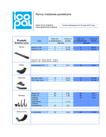 Rynny metalowe powlekane www.rynny.icopal.pl www.gwarancje.icopal.pl Produkt Opis Ilość szt. w opakowaniu Średnica rynny Rynna Cennik obowiązuje od 19 maja 2014 roku Cena za sztukę Ilość szt. w opakowaniu 125 mm odcinki 4 mb odcinki 3 mb 5 5 Cena za sztukę 150 mm 61,32 45,99 4 4 83,40 62,55 Cena za 1 mb : Rynna 125 mm - 15,33 zł Cena za 1 mb : Rynna 150 mm - 20,85 zł Dekiel uniwersalny L/P 50 9,07 30 12,04 Narożnik 90° wew./zew. 135° wew./zew. 15 5 53,92 125,2 10 5 61,64 147,46 długa 210 krótka 70 czołowa czołowa regulowana czołowa kompaktowa 50 50 - 9,22 7,48 - 40 50 50 9,57 7,72 12,04 - 11,10 - - 50 7,61 - - z uszczelką 50 10,92 40 11,58 Rynajzy Złącze rynny Rynny metalowe powlekane www.rynny.icopal.pl www.gwarancje.icopal.pl Produkt Opis Cennik obowiązuje od 19 maja 2014 roku Ilość szt. w opakowaniu Cena za sztukę Ilość szt. w opakowaniu 90 mm Średnica rury spustowej Cena za sztukę 100 mm Rura spustowa odcinki 3 mb odcinki 1 mb 2 2 60,90 22,50 2 2 80,04 27,60 Cena za 1 mb : Rura spustowa 90 mm: odcinki 3 m – 20,30 zł odcinki 1 m 22,50 zł Cena za 1 mb : Rura spustowa 100 mm: odcinki 3 m – 26,68 zł odcinki 1 m 27,60 zł Sztucer do rynny 125 mm 150 mm 25 - 20,84 - 20 29,44 kolano 70° trójnik 60° 15 15 20,84 108,87 10 10 33,70 144,32 15 149,72 10 161,51 100 6,13 50 11,11 50 9,70 50 10,30 200 9,10 200 9,10 20 21,95 15 35,00 16 48,30 12 64,85 Kolano i trójnik Obejmy zbieracz deszczówki obejma rury (do drewna i stali) obejma rury (do muru) wkręt dł 210 mm do obejmy muru Wylewki wylewka wylewka kanalizacyjna Rynny metalowe powlekane www.rynny.icopal.pl www.gwarancje.icopal.pl Produkt Opis Cennik obowiązuje od 19 maja 2014 roku Ilość szt. w opakowaniu Cena za sztukę Ilość szt. w opakowaniu 90 mm Średnica rury spustowej Czyszczaki uchwyt wzmacniający mufa czyszczak Lovis Cena za sztukę 100 200 32 x 4,90 20,13 52,79 200 32 x 4,90 52,79 5 150,51 5 150,51 Lej spustowy Lej spustowy Niniejszy cennik ma charakter informacyjny i nie stanowi oferty w rozumieniu art.66 i następnych Kodeksu Cywilnego Ceny podane w niniejszym cenniku są cenami netto i nie zawierają podatku VAT Kolory standardowe: Kolory standardowe pod zamówienie: • brązowy (RAL 8028) • biały (RAL 9002) • czarny (RAL 9005) ) • ceglasty (RAL 8004) • grafitowy (RAL 7011) • wiśniowy (RAL 3009) • silver metallic (RAL 9006) + 5% do poniższych cen • na specjalne zamówienie dostępne są rury spustowe i akcesoria w rozmiarze 110 mm Icopal SA 98-220 Zduńska Wola ul. Łaska 169/197 tel. +48 43/823 41 11 fax +48 43/823 40 25 www.icopal.pl www.rynny.icopal.pl