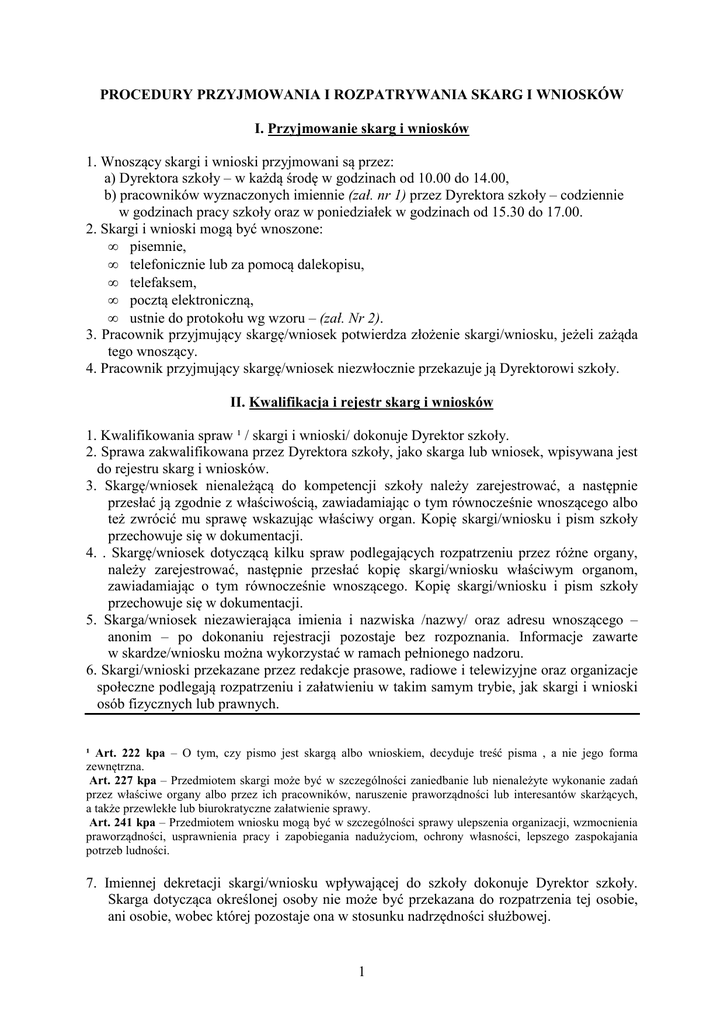 PROCEDURY PRZYJMOWANIA I ROZPATRYWANIA SKARG I WNIOSKÓW I. Przyjmowanie skarg i wniosków 1. Wnoszący skargi i wnioski przyjmowani są przez: a) Dyrektora szkoły – w każdą środę w godzinach od 10.00 do 14.00, b) pracowników wyznaczonych imiennie (zał. nr 1) przez Dyrektora szkoły – codziennie w godzinach pracy szkoły oraz w poniedziałek w godzinach od 15.30 do 17.00. 2. Skargi i wnioski mogą być wnoszone: • pisemnie, • telefonicznie lub za pomocą dalekopisu, • telefaksem, • pocztą elektroniczną, • ustnie do protokołu wg wzoru – (zał. Nr 2). 3. Pracownik przyjmujący skargę/wniosek potwierdza złożenie skargi/wniosku, jeżeli zażąda tego wnoszący. 4. Pracownik przyjmujący skargę/wniosek niezwłocznie przekazuje ją Dyrektorowi szkoły. II. Kwalifikacja i rejestr skarg i wniosków 1. Kwalifikowania spraw ¹ / skargi i wnioski/ dokonuje Dyrektor szkoły. 2. Sprawa zakwalifikowana przez Dyrektora szkoły, jako skarga lub wniosek, wpisywana jest do rejestru skarg i wniosków. 3. Skargę/wniosek nienależącą do kompetencji szkoły należy zarejestrować, a następnie przesłać ją zgodnie z właściwością, zawiadamiając o tym równocześnie wnoszącego albo też zwrócić mu sprawę wskazując właściwy organ. Kopię skargi/wniosku i pism szkoły przechowuje się w dokumentacji. 4. . Skargę/wniosek dotyczącą kilku spraw podlegających rozpatrzeniu przez różne organy, należy zarejestrować, następnie przesłać kopię skargi/wniosku właściwym organom, zawiadamiając o tym równocześnie wnoszącego. Kopię skargi/wniosku i pism szkoły przechowuje się w dokumentacji. 5. Skarga/wniosek niezawierająca imienia i nazwiska /nazwy/ oraz adresu wnoszącego – anonim – po dokonaniu rejestracji pozostaje bez rozpoznania. Informacje zawarte w skardze/wniosku można wykorzystać w ramach pełnionego nadzoru. 6. Skargi/wnioski przekazane przez redakcje prasowe, radiowe i telewizyjne oraz organizacje społeczne podlegają rozpatrzeniu i załatwieniu w takim samym trybie, jak skargi i wnioski osób fizycznych lub prawnych. ¹ Art. 222 kpa – O tym, czy pismo jest skargą albo wnioskiem, decyduje treść pisma , a nie jego forma zewnętrzna. Art. 227 kpa – Przedmiotem skargi może być w szczególności zaniedbanie lub nienależyte wykonanie zadań przez właściwe organy albo przez ich pracowników, naruszenie praworządności lub interesantów skarżących, a także przewlekłe lub biurokratyczne załatwienie sprawy. Art. 241 kpa – Przedmiotem wniosku mogą być w szczególności sprawy ulepszenia organizacji, wzmocnienia praworządności, usprawnienia pracy i zapobiegania nadużyciom, ochrony własności, lepszego zaspokajania potrzeb ludności. 7. Imiennej dekretacji skargi/wniosku wpływającej do szkoły dokonuje Dyrektor szkoły. Skarga dotycząca określonej osoby nie może być przekazana do rozpatrzenia tej osobie, ani osobie, wobec której pozostaje ona w stosunku nadrzędności służbowej. 1 8. Pracownik prowadzący rejestr skarg i wniosków rejestruje je poprzez odręczne wpisanie na obwolucie skargi/wniosku numeru, obowiązującego w dokumentacji skargi/wniosku, składającego się z: a. symbolu szkoły, b. inicjałów osoby wyznaczonej do ich rozpatrywania, c. symbolu kwalifikacyjnego jednolitego wykazu akt, d. kolejnego numeru z rejestru, e. dwóch ostatnich cyfr danego roku kalendarzowego. Ponadto wpisuje termin ich załatwienia oraz nadzoruje terminowość załatwienia skarg i wniosków. 9. Rejestr skarg i wniosków uwzględnia następujące rubryki (zał. nr 3): • liczba porządkowa, • data wpływu skargi/wniosku, • data rejestrowania skargi/wniosku, • adres osoby lub instytucji wnoszącej skargę/wniosek, • treść (krótka) skargi/wniosku, • termin załatwienia skargi/wniosku, • imię i nazwisko osoby odpowiedzialnej za załatwienie skargi/wniosku, • datę załatwienia skargi/wniosku, • informacja (krótka) o sposobie załatwienia skargi/wniosku, • informację o terminie realizacji wydanych zaleceń – jeśli takie wydano. 10. Do rejestru nie wpisuje się skarg i wniosków skierowanych do innych organów i przesłanych do wiadomości szkoły. III. Rozpatrywanie skarg i wniosków 1. Pracownik upoważniony do załatwienia skargi/wniosku winien postępować według wskazówek zamieszczonych w zał. nr 4. 2. Z wyjaśnienia skargi/wniosku, należy sporządzić dokumentację zawierającą: • oryginał skargi/wniosku, • notatkę służbową informującą o sposobie załatwienia skargi/wniosku i wynikach postępowania wyjaśniającego – (zał. nr 5), • materiały pomocnicze zebrane w trakcie wyjaśniania skargi/wniosku (oświadczenia, opinie, kserokopie dokumentów, wyciągi itp.), • wyczerpującą odpowiedź do wnoszącego, informującą o sposobie rozstrzygnięcia sprawy wraz z urzędowo potwierdzonym jej wysłaniem, • pismo z wydanymi zaleceniami – jeśli wymaga tego sprawa, 3. Odpowiedź do wnoszącego winna zawierać: • oznaczenie organu, od którego pochodzi, • wyczerpującą informację o sposobie załatwienia sprawy z odniesieniem się do wszystkich zarzutów/wniosków zawartych w skardze/wniosku, • faktyczne i prawne (z podaniem podstawy prawnej) uzasadnienie, jeżeli skarga/wniosek została załatwiona odmownie, • imię i nazwisko, podpis i stanowisko osoby upoważnionej do załatwienia skargi. 4. Pismo z odpowiedzią do wnoszącego skargę/wniosek, przed jego wysłaniem parafuje Dyrektor szkoły. 5. Pełną dokumentację, po zakończeniu sprawy, pracownik rozpatrujący skargę/wniosek składa osobiści u pracownika rejestrującego skargi i wnioski – nie później niż w ciągu 7 dni po upływie terminu jej załatwienia, potwierdzając ten fakt własnoręcznym podpisem 2 w rejestrze skarg i wniosków. Na obwolucie skargi/wniosku, na której zamieszcza się spis dokumentów zgromadzonych w trakcie załatwiania skargi/wniosku, powinien znajdować się również podpis pracowni