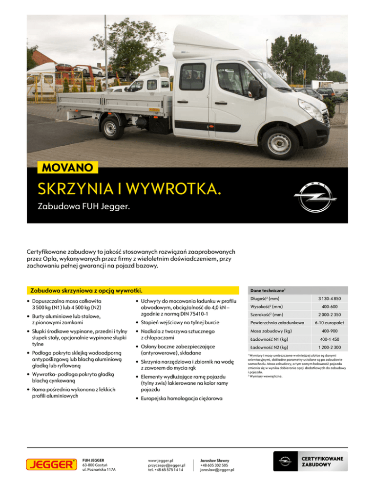 MOVANO SKRZYNIA I WYWROTKA. Zabudowa FUH Jegger. Certyfikowane zabudowy to jakość stosowanych rozwiązań zaaprobowanych przez Opla, wykonywanych przez firmy z wieloletnim doświadczeniem, przy zachowaniu pełnej gwarancji na pojazd bazowy. Zabudowa skrzyniowa z opcją wywrotki. • Dopuszczalna masa całkowita 3 500 kg (N1) lub 4 500 kg (N2) • Burty aluminiowe lub stalowe, z pionowymi zamkami • Słupki środkowe wypinane, przedni i tylny słupek stały, opcjonalnie wypinane słupki tylne • Podłoga pokryta sklejką wodoodporną antypoślizgową lub blachą aluminiową gładką lub ryflowaną • Wywrotka- podłoga pokryta gładką blachą cynkowaną • Rama pośrednia wykonana z lekkich profili aluminiowych FUH JEGGER 63-800 Gostyń ul. Poznańska 117A Dane techniczne1 Długość2 (mm) 3 130-4 850 • Uchwyty do mocowania ładunku w profilu obwodowym, obciążalność do 4,0 kN – zgodnie z normą DIN 75410-1 Wysokość2 (mm) 400-600 Szerokość2 (mm) 2 000-2 350 • Stopień wejściowy na tylnej burcie Powierzchnia załadunkowa • Nadkola z tworzywa sztucznego z chlapaczami Masa zabudowy (kg) • Osłony boczne zabezpieczające (antyrowerowe), składane • Skrzynia narzędziowa i zbiornik na wodę z zaworem do mycia rąk • Elementy wydłużające ramę pojazdu (tylny zwis) lakierowane na kolor ramy pojazdu • Europejska homologacja ciężarowa www.jegger.pl [email protected] tel. +48 65 575 14 14 Jarosław Sławny +48 605 302 505 [email protected] 6-10 europalet 400-900 Ładowność N1 (kg) 400-1 450 Ładowność N2 (kg) 1 200-2 300 Wymiary i masy umieszczone w niniejszej ulotce są danymi orientacyjnymi, dokładne parametry ustalane są po zabudowie samochodu. Masa zabudowy, a tym samym ładowność pojazdu zmienia się w wyniku dobierania opcji dodatkowych do zabudowy i pojazdu. 2 Wymiary wewnętrzne. 1 ZABUDOWA TYPU SKRZYNIA / WYWROTKA Szczegóły • Nadkola z tworzywa sztucznego • Stopień wejściowy na tylnej burcie • Podłoga antypoślizgowa w skrzyni bez wywrotu Jakość • Precyzja wykonania • Dbałość o szczegóły • Trwałe elementy mechaniczne Lekka konstrukcja • Odporna na korozję atmosferyczną • Niska masa własna konstrukcji • Większa ładowność WYWROTKA • • • • • • • • • Agregat elektrohydrauliczny o mocy 2kW Wychylenie siłownika do 50 stopni Wyładowanie na tył lub na trzy strony (tył i boki) Krata przedniej ściany do wysokości kabiny Zdalne sterowanie wywrotem skrzyni Tylna burta wyposażona w zawiasy górne i dolne Dźwiękowy sygnał ostrzegający o pracy wywrotki Krańcowy wyłącznik zasilania siłownika wywrotki Podłoga gładka pokryta blachą stalową cynkowaną WYPOSAŻENIE DODATKOWE • Kratki ochronne lamp tylnego oświetlenia • Poduszki pneumatyczne tylnej osi • Hak holowniczy • Spojler nad kabiną • Wytrzymała plandeka zakrywająca górę skrzyni • Żuraw załadunkowy za kabiną pojazdu • Stalowy lub aluminiowy pałąk chroniący kabinę z tyłu • Światła obrysowe zabudowy WYBIERZ ODPOWIEDNIĄ WERSJĘ OPLA MOVANO POD ZABUDOWĘ Podwozie z pojedynczą lub podwójną kabiną WERSJE H1 3 256 mm Długość i wysokość Podwozie L2 H1 FWD/RWD1 Podwozie z kabiną załogową FWD L3 H1 FWD/RWD1 FWD/RWD1 L4 H1 RWD2 RWD2 Dostępna również z podwójnymi tylnymi kołami (DRW) 2 Dostępna tylko z tylnymi podwójnymi kołami (DRW). L - długość nadwozia: 1 = krótka, 2 = średnia, 3 = długa, 4 = przedłużona H - wysokość nadwozia: 1 = standardowa. Napęd 4x4 tylko z napędem na tylną oś RWD 1 SILNIKI L2 5 643 mm L3 6 293 mm L4 6 843 mm FWD Napęd na przednią oś 2.3 CDTI 110 KM S/S RWD Napęd na tylną oś 2.3 CDTI 125 KM 4x4 ESP® Start/Stop BiTurbo Napęd na wszystkie koła Wspomaganie kierowcy System oszczędzania paliwa Silniki podwójnie doładowane BiTurbo BiTurbo 2.3 CDTI 136 KM S/S 2.3 CDTI 163 KM S/S 2 lata/ 40 tys. km Bluetooth® USB Przeglądy Łączność