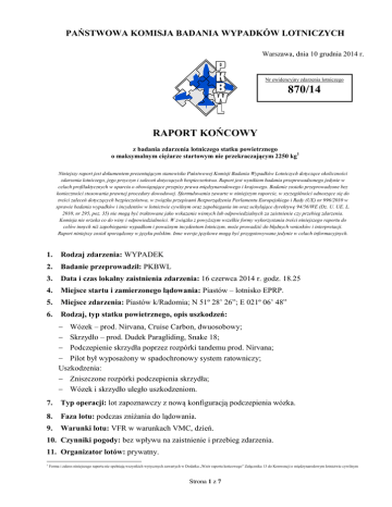 PAŃSTWOWA KOMISJA BADANIA WYPADKÓW LOTNICZYCH Warszawa, dnia 10 grudnia 2014 r. Nr ewidencyjny zdarzenia lotniczego 870/14 RAPORT KOŃCOWY z badania zdarzenia lotniczego statku powietrznego o maksymalnym ciężarze startowym nie przekraczającym 2250 kg1 Niniejszy raport jest dokumentem prezentującym stanowisko Państwowej Komisji Badania Wypadków Lotniczych dotyczące okoliczności zdarzenia lotniczego, jego przyczyn i zaleceń dotyczących bezpieczeństwa. Raport jest wynikiem badania przeprowadzonego jedynie w celach profilaktycznych w oparciu o obowiązujące przepisy prawa międzynarodowego i krajowego. Badanie zostało przeprowadzone bez konieczności stosowania prawnej procedury dowodowej. Sformułowania zawarte w niniejszym raporcie, w szczególności odnoszące się do treści zaleceń dotyczących bezpieczeństwa, w związku przepisami Rozporządzenia Parlamentu Europejskiego i Rady (UE) nr 996/2010 w sprawie badania wypadków i incydentów w lotnictwie cywilnym oraz zapobiegania im oraz uchylające dyrektywę 94/56/WE (Dz. U. UE. L. 2010, nr 295, poz. 35) nie mogą być traktowane jako wskazanie winnych lub odpowiedzialnych za zaistnienie czy przebieg zdarzenia. Komisja nie orzeka co do winy i odpowiedzialności. W związku z powyższym wszelkie formy wykorzystania treści niniejszego raportu do celów innych niż zapobieganie wypadkom i poważnym incydentom lotniczym, może prowadzić do błędnych wniosków i interpretacji. Raport niniejszy został sporządzony w języku polskim. Inne wersje językowe mogą być przygotowywane jedynie w celach informacyjnych. 1. Rodzaj zdarzenia: WYPADEK 2. Badanie przeprowadził: PKBWL 3. Data i czas lokalny zaistnienia zdarzenia: 16 czerwca 2014 r. godz. 18.25 4. Miejsce startu i zamierzonego lądowania: Piastów – lotnisko EPRP. 5. Miejsce zdarzenia: Piastów k/Radomia; N 51º 28’ 26”; E 021º 06’ 48” 6. Rodzaj, typ statku powietrznego, opis uszkodzeń: Wózek – prod. Nirvana, Cruise Carbon, dwuosobowy; Skrzydło – prod. Dudek Paragliding, Snake 18; Podczepienie skrzydła poprzez rozpórki tandemu prod. Nirvana; Pilot był wyposażony w spadochronowy system ratowniczy; Uszkodzenia: Zniszczone rozpórki podczepienia skrzydła; Wózek i skrzydło uległo uszkodzeniom. 7. Typ operacji: lot zapoznawczy z nową konfiguracją podczepienia wózka. 8. Faza lotu: podczas zniżania do lądowania. 9. Warunki lotu: VFR w warunkach VMC, dzień. 10. Czynniki pogody: bez wpływu na zaistnienie i przebieg zdarzenia. 11. Organizator lotów: prywatny. 1 Forma i zakres niniejszego raportu nie spełniają wszystkich wytycznych zawartych w Dodatku „Wzór raportu końcowego” Załącznika 13 do Konwencji o międzynarodowym lotnictwie cywilnym Strona 1 z 7 12. Dane dotyczące dowódcy statku powietrznego: mężczyzna lat 37, posiadał świadectwo kwalifikacji pilota paralotni, z uprawnieniami: Do wykonywania lotów na paralotni z napędem (PPG); Do wykonywania lotów na motoparalotni (PPGG); Do wykonywania przeglądu przedlotowego statku wykonywania napraw i regulacji (PDI); Do lotów z pasażerem (CP). powietrznego bez prawa Pilot posiadał orzeczenie lotniczo-lekarskie klasy 2 / LAPL. Świadectwo kwalifikacji, uprawnienia i orzeczenie lotniczo-lekarskie były ważne w dniu zdarzenia. Pilot był doświadczonym zawodnikiem latającym na paralotniach z napędem (PPG), startującym w klasie PF1, ze zdecydowanie mniejszym doświadczeniem w lotach na motoparalotniach (PPGG) dwuosobowych (klasa PL-2)2. 13. Obrażenia załogi: W wyniku zderzenia ze znaczną prędkością z ziemią, pilot doznał obrażeń ze skutkiem śmiertelnym. 14. Opis przebiegu i analiza zdarzenia: W dniu wypadku pilot wykonywał loty w załodze jednoosobowej, na miejscu pasażera pilot zamontował obciążenie. Odbywał loty w celach zapoznawczych w nowej konfiguracji podczepienia wózka. Do lotu wykorzystane było skrzydło, na którym pilot wykonywał loty podczas tegorocznych treningów i zakończonych dzień wcześniej zawodów. W czasie lotów pilot miał przy sobie następujące urządzenia umożliwiające rejestrację niektórych parametrów lotów: odbiornik GPSmap-76S, przyrząd pokładowy BRAUNIGER IQCOMFORT i logger GPS AMOD 3080. Odbiornik GPSmap-76S nie był uruchomiony w dniu wypadku i z tego powodu w pamięci urządzenia nie znajdowały się dane dotyczące lotu. Z pamięci IQ-COMFORT odczytano zapisy parametrów lotów, w tym z dnia 16.06.2014 r. Zapis dotyczy tylko jednego lotu, aczkolwiek z zapisu w pamięci loggera GPS AMOD 3080 wynika, że pilot w tym dniu wykonał dwa loty. Zgodnie z zapisem z loggera, pierwszy lot trwał 2 min. 23 s. Nie został on jednak zapisany w pamięci przyrządu BRAUNIGER IQ-COMFORT, gdyż nie został spełniony łączny warunek długotrwałości lotu powyżej 3 minut i różnicy wysokości więcej 25 m. Na tej podstawie Komisja przyjęła, że zapis w pamięci z dnia 16 czerwca 2014 r. dotyczy drugiego w tym dniu lotu, w którym nastąpił wypadek. Potwierdzeniem identyfikacji odczytanych danych jest zapis z kamery zamontowanej na miejscu startu, zgodnie z którym czas lotu poprzedzającego lot zakończony wypadkiem nie przekraczał 3 minut. 2 Klasa PF1 – paralotnie z napędem ze startem z nóg pilota, klasa PL2 – motoparalotnie (wózki dwuosobowe). Strona 2 z 7 Dane z dnia 16.06.2014 r. odczytane zostały w trybie ekranowym, a z poszczególnych sekwencji wykonano fotografie, (fot. 1 – 3). Fot. 1 Fot. 2 Fot 3 Odczytane parametry lotu: - maksymalna wysokość lotu AMSL 703m (przy ciśnieniu QNH 1015 hPa i nastawie przyrządu 1015 hPa) - maksymalna wysokość lotu AGL 557m - suma nabranych wysokości 1400m - maksymalne wznoszenie +4,1 m/s - maksymalne opadanie -16,0m/s - czas lotu 2:37 - data lotu 16.06.2014r. W opinii Komisji, zarejestrowana maksymalna prędkość opadania, wynosząca 16 m/s wystąpiła w fazie lotu, w której nastąpił wypadek. Wartość 2 godz. 35 min wyświetlona, jako „flight time”, zgodnie z info
