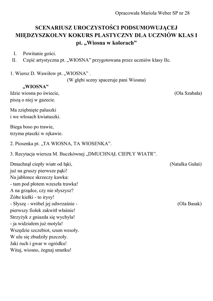 Opracowała Mariola Weber SP nr 28 SCENARIUSZ UROCZYSTOŚCI PODSUMOWUJĄCEJ MIĘDZYSZKOLNY KOKURS PLASTYCZNY DLA UCZNIÓW KLAS I pt. „Wiosna w kolorach” I. II. Powitanie gości. Część artystyczna pt. „WIOSNA” przygotowana przez uczniów klasy IIc. 1. Wiersz D. Wawiłow pt. „WIOSNA” . (W głębi sceny spaceruje pani Wiosna) „WIOSNA” Idzie wiosna po świecie, piszą o niej w gazecie. (Ola Szabała) Ma zziębnięte paluszki i we włosach kwiatuszki. Biega boso po trawie, trzyma ptaszki w rękawie. 2. Piosenka pt. „TA WIOSNA, TA WIOSENKA”. 3. Recytacja wiersza M. Buczkównej „DMUCHNĄŁ CIEPŁY WIATR”. Dmuchnął ciepły wiatr od łąki, już na gruszy pierwsze pąki! Na jabłonce skrzeczy kawka: - tam pod płotem wzeszła trawka! A na grządce, czy nie słyszysz? Żółte kiełki - to irysy! - Słyszę - wróbel jej odwrzaśnie pierwszy fiołek zakwitł właśnie! Strzyżyk z gniazda się wychyla! - ja widziałem już motyla! Wszędzie szczebiot, szum wesoły. W ulu się zbudziły pszczoły. Jaki ruch i gwar w ogródku! Witaj, wiosno, żegnaj smutku! (Natalka Gułaś) (Ola Basak) 4. Granie na fletach melodii piosenki „Powitalny koncert”. (Marcin Kamiński Michał Żurkowski dziewczynki) 5. Wiersz S. Łukasik pt. „Upodobania wiosny”. „Upodobania wiosny” Wiosna nie znosi brudu, bałaganu i nudy. Wiosna ma skłonność do porządku. Zróbmy wiośnie przyjemność i posprzątajmy najlepiej w każdym kątku. (Natalka Gułaś) Wiosna wie, że kiedy czystość bije z każdego kątka, lepiej się myśli, lepiej wypoczywa i chętniej czyta. (Gabrysia Szymańska) Wiosna nie znosi leni. Wiosna jest pracowita. Więc zacznij wiosenne sprzątanie. Wiosna cię wita. (Ola Basak) 6. Układ taneczny do piosenki pt. „ŚMIECIU PRECZ”. (płyta czerwona, CD3, kl. 1, utwór nr 7) 7. Recytacja wiersza H. Zdzitowieckiej „W NASZYM OGRÓDECZKU”. „W NASZYM OGRÓDECZKU” W naszym ogródeczku zrobimy porządki zagrabimy ścieżki, przekopiemy grządki. (Pola Branecka) Na grządkach wyrośnie fasolka, marchewka sałata i groszek, czerwona rzodkiewka. W naszym ogródeczku posiejemy kwiatki będą nam pachniały fiołki i bratki, (Emilka Kobielska) Nasturcja, goździki, nagietki i groszek, i ta biała lilia, co tak żółci nosek. 8. Wiersz pt. „DNI WIOSENNE” „DNI WIOSENNE” Dni wiosenne zawitały, słonko jasne ślicznie świeci Skowroneczek, ptaszek mały, z ciepłych krajów do nas leci. Za skowronkiem, mości panie, przylatujesz nam bocianie. Witaj boćku, bratku miły. Zaklekotaj co masz siły. Za bocianem jaskółeczka, za jaskółką kukułeczka. I słowiczek ulubiony, chętnie wraca w nasze strony. (Zuzia Narębska) 9. Piosenka pt. „Kle, kle, boćku”. 10. Inscenizacja pt. „BOCIAN I ŻABY”. (Konrad Kaczmar - bocian dziewczynki - żaby) Żaby : Idzie żabka na spacerek, gdzie słoneczko i wiaterek. Skacze żabka - skik, skik, skik! Nie dorówna żabce nikt. (Skaczą) Bocian: (kroczy wolno, kiwając głową) Idzie bocian na spacerek, gdzie słoneczko i wiaterek. Mówi bocian: kle, kle, kle! Wszystkie żabki złapać chcę! Żaba I: Siostro żabko, kto to chodzi? Żaba II: To pan bocian w trawie brodzi. Żaby: (Ola Basak) (Gabrysia Szymańska) (uciekając): Uciekajmy, hyc, hyc, hyc! Nie zobaczy bocian nic! Bocian: Próżno bocian żabek szuka, próżno długim dziobem stuka. Żaby: Choć tu żabek cały tłum, nic nie znajdziesz - kum, kum, kum! Bocian: (idzie za głosem żab, które tymczasem uciekają już gdzie indziej): Tu słyszałem gdzieś kumkanie, tutaj bocian was dostanie. Żaby: (uciekając dalej): Choć tu żabek cały tłum, nic nie znajdziesz - kum, kum, kum! Bocian: (zwiesza głowę, robi strapioną minę): Nic nie znajdę. To ci los! Ze zmartwienia zwieszam nos. Kle, kle, kle! 11. Recytacja wiersza S. Szuchowej pt. „MAJOWY DESZCZ”. „MAJOWY DESZCZ” W pewien ranek majowy spadł dzieciakom na głowy. Spadł na kwiaty i liście ciepło... krótko… rzęsiście… Pogwarzył coś o wiośnie… Ucichł… i wszystko rośnie. (Gabrysia Szymańska) 12. Układ taneczny do piosenki „PRZYSZŁA PANI WIOSNA”. (płyta niebieska, CD2B, kl. 3, utwór nr 13) III. Wręczenie dyplomów przez panią Annę Woś. IV. Gratulacje dla laureatów konkursu. V. Podziękowania. VI. Pożegnanie gości. ( w tle muzyka z płyty Marka Grechuty, utwór nr 5 „Wiosna - ach, to ty”)
