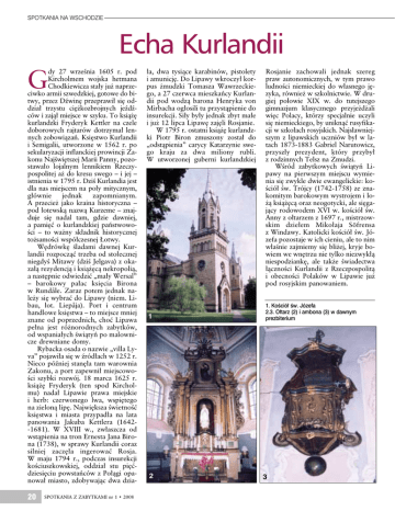 SPOTKANIA NA WSCHODZIE Echa Kurlandii dy 27 września 1605 r. pod Kircholmem wojska hetmana Chodkiewicza stały już naprzeciwko armii szwedzkiej, gotowe do bitwy, przez Dźwinę przeprawił się oddział trzystu ciężkozbrojnych jeźdźców i zajął miejsce w szyku. To książę kurlandzki Fryderyk Kettler na czele doborowych rajtarów dotrzymał lennych zobowiązań. Księstwo Kurlandii i Semigalii, utworzone w 1562 r. po sekularyzacji inflanckiej prowincji Zakonu Najświętszej Marii Panny, pozostawało lojalnym lennikiem Rzeczypospolitej aż do kresu swego – i jej – istnienia w 1795 r. Dziś Kurlandia jest dla nas miejscem na poły mitycznym, głównie jednak zapomnianym. A przecież jako kraina historyczna – pod łotewską nazwą Kurzeme – znajduje się nadal tam, gdzie dawniej, a pamięć o kurlandzkiej państwowości – to ważny składnik historycznej tożsamości współczesnej Łotwy. Wędrówkę śladami dawnej Kurlandii rozpocząć trzeba od stołecznej niegdyś Mitawy (dziś Jelgava) z okazałą rezydencją i książęcą nekropolią, a następnie odwiedzić „mały Wersal” – barokowy pałac księcia Birona w Runda-le. Zaraz potem jednak należy się wybrać do Lipawy (niem. Libau, łot. Liepa-ja). Port i centrum handlowe księstwa – to miejsce mniej znane od poprzednich, choć Lipawa pełna jest różnorodnych zabytków, od wspaniałych świątyń po malownicze drewniane domy. Rybacka osada o nazwie „villa Lyva” pojawiła się w źródłach w 1252 r. Nieco później stanęła tam warownia Zakonu, a port zapewnił miejscowości szybki rozwój. 18 marca 1625 r. książę Fryderyk (ten spod Kircholmu) nadał Lipawie prawa miejskie i herb: czerwonego lwa, wspiętego na zieloną lipę. Największa świetność księstwa i miasta przypadła na lata panowania Jakuba Kettlera (1642-1681). W XVIII w., zwłaszcza od wstąpienia na tron Ernesta Jana Birona (1738), w sprawy Kurlandii coraz silniej zaczęła ingerować Rosja. W maju 1794 r., podczas insurekcji kościuszkowskiej, oddział stu pięćdziesięciu powstańców z Połągi opanował miasto, zdobywając dwa dzia- G 20 SPOTKANIA Z ZABYTKAMI nr 1 • 2008 ła, dwa tysiące karabinów, pistolety i amunicję. Do Lipawy wkroczył korpus żmudzki Tomasza Wawrzeckiego, a 27 czerwca mieszkańcy Kurlandii pod wodzą barona Henryka von Mirbacha ogłosili tu przystąpienie do insurekcji. Siły były jednak zbyt małe i już 12 lipca Lipawę zajęli Rosjanie. W 1795 r. ostatni książę kurlandzki Piotr Biron zmuszony został do „odstąpienia” carycy Katarzynie swego kraju za dwa miliony rubli. W utworzonej guberni kurlandzkiej 1 2 Rosjanie zachowali jednak szereg praw autonomicznych, w tym prawo ludności niemieckiej do własnego języka, również w szkolnictwie. W drugiej połowie XIX w. do tutejszego gimnazjum klasycznego przyjeżdżali więc Polacy, którzy specjalnie uczyli się niemieckiego, by uniknąć rusyfikacji w szkołach rosyjskich. Najsławniejszym z lipawskich uczniów był w latach 1873-1883 Gabriel Narutowicz, przyszły prezydent, który przybył z rodzinnych Telsz na Żmudzi. Wśród zabytkowych świątyń Lipawy na pierwszym miejscu wymienia się zwykle dwie ewangelickie: kościół św. Trójcy (1742-1758) ze znakomitym barokowym wystrojem i lożą książęcą oraz neogotycki, ale sięgający rodowodem XVI w. kościół św. Anny z ołtarzem z 1697 r., mistrzowskim dziełem Mikołaja Söfrensa z Windawy. Katolicki kościół św. Józefa pozostaje w ich cieniu, ale to nim właśnie zajmiemy się bliżej, kryje bowiem we wnętrzu nie tylko niezwykłą niespodziankę, ale także świadectwa łączności Kurlandii z Rzeczpospolitą i obecności Polaków w Lipawie już pod rosyjskim panowaniem. 1. Kościół św. Józefa 2.3. Ołtarz (2) i ambona (3) w dawnym prezbiterium 3 SPOTKANIA NA WSCHODZIE 4 w Maryjny, w niszy nad tabernakulum umieszczono figurę Matki Bożej z Lourdes, a powyżej kopię „Madonny” Rafaela. Tuż przy wejściu, na lewo, znajduje się ambona, zawieszona płasko przy ścianie – wyrzeźbione na korpusie owce spoglądają w górę, na pasterza. Naprzeciwko ambony widnieje zaś kurlandzkie godło, efektownie eksponujące związek z Polską, unikatowe, bo w takiej formie nigdzie indziej niewystępujące. Na błękitnym płaszczu z czerwonym podbiciem, pod wielką koroną rozpościera skrzydła Orzeł Biały, trzymający 6 4. Orzeł Biały z herbami książąt Kurlandii 5. Wizerunek Matki Bożej Ostrobramskiej 6. Herb Plater-Sybergów w nowym prezbiterium 5 W 1747 r. z fundacji księcia Birona rozpoczęto w centrum miasta budowę pierwszej świątyni katolickiej. Jednonawowy kościół z czworościenną wieżą, nakrytą hełmem – iglicą, został konsekrowany 28 lipca 1762 r. pod wezwaniem św. Karola Boromeusza. Pod koniec XIX w. był już za ciasny, w 1894 r. podjęto więc decyzję o rozbudowie, by w rezultacie wznieść znacznie większą świątynię – nowy kościół św. Józefa. Autorzy projektu, miejscowi architekci Luis Melvil i Karl Strandmanis, zachowali jednak osiemnastowieczne prezbiterium jako boczną kaplicę Matki Bożej – to właśnie wspomniana niespodzianka. Tym większa, że z zewnątrz kaplica nie wyróżnia się w bryle budowli, obmurowana taką samą jasnożółtą cegłą, z jakiej zbudowano całą świątynię. Jedynie u góry na ścianie widnieją historyczne daty: „1747” i „1894”. Poziom posadzki pierwotnie znajdował się niżej, toteż do kaplicy – dawnego prezbiterium o rokokowym wystroju schodzimy po schodach. Ołtarz główny przekształcony został (zdjęcia: Jarosław Komorowski) dwie tarcze herbowe. W lewej łapie znajduje się herb Ernesta Jana Birona, fundatora świątyni: na tarczy dzielonej w pas u góry dwugłowy półorzeł, u dołu – ptak siedzący na pniu, a przed nim klucz. Godło Saksonii w łapie prawej – to herb księcia Karola Wettyna. Syn polskiego króla Augusta III sprawował władzę w latach 1758-1763,