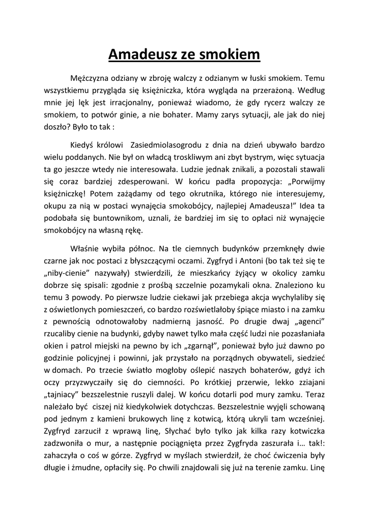 Amadeusz ze smokiem Mężczyzna odziany w zbroję walczy z odzianym w łuski smokiem. Temu wszystkiemu przygląda się księżniczka, która wygląda na przerażoną. Według mnie jej lęk jest irracjonalny, ponieważ wiadomo, że gdy rycerz walczy ze smokiem, to potwór ginie, a nie bohater. Mamy zarys sytuacji, ale jak do niej doszło? Było to tak : Kiedyś królowi Zasiedmiolasogrodu z dnia na dzieo ubywało bardzo wielu poddanych. Nie był on władcą troskliwym ani zbyt bystrym, więc sytuacja ta go jeszcze wtedy nie interesowała. Ludzie jednak znikali, a pozostali stawali się coraz bardziej zdesperowani. W koocu padła propozycja: „Porwijmy księżniczkę! Potem zażądamy od tego okrutnika, którego nie interesujemy, okupu za nią w postaci wynajęcia smokobójcy, najlepiej Amadeusza!” Idea ta podobała się buntownikom, uznali, że bardziej im się to opłaci niż wynajęcie smokobójcy na własną rękę. Właśnie wybiła północ. Na tle ciemnych budynków przemknęły dwie czarne jak noc postaci z błyszczącymi oczami. Zygfryd i Antoni (bo tak też się te „niby-cienie” nazywały) stwierdzili, że mieszkaocy żyjący w okolicy zamku dobrze się spisali: zgodnie z prośbą szczelnie pozamykali okna. Znaleziono ku temu 3 powody. Po pierwsze ludzie ciekawi jak przebiega akcja wychylaliby się z oświetlonych pomieszczeo, co bardzo rozświetlałoby śpiące miasto i na zamku z pewnością odnotowałoby nadmierną jasnośd. Po drugie dwaj „agenci” rzucaliby cienie na budynki, gdyby nawet tylko mała częśd ludzi nie pozasłaniała okien i patrol miejski na pewno by ich „zgarnął”, ponieważ było już dawno po godzinie policyjnej i powinni, jak przystało na porządnych obywateli, siedzied w domach. Po trzecie światło mogłoby oślepid naszych bohaterów, gdyż ich oczy przyzwyczaiły się do ciemności. Po krótkiej przerwie, lekko zziajani „tajniacy” bezszelestnie ruszyli dalej. W koocu dotarli pod mury zamku. Teraz należało byd ciszej niż kiedykolwiek dotychczas. Bezszelestnie wyjęli schowaną pod jednym z kamieni brukowych linę z kotwicą, którą ukryli tam wcześniej. Zygfryd zarzucił z wprawą linę, Słychad było tylko jak kilka razy kotwiczka zadzwoniła o mur, a następnie pociągnięta przez Zygfryda zaszurała i… tak!: zahaczyła o coś w górze. Zygfryd w myślach stwierdził, że chod dwiczenia były długie i żmudne, opłaciły się. Po chwili znajdowali się już na terenie zamku. Linę ukryli pod krzewem rosnącym przy pałacu, mogła się jeszcze przydad. Jako że mieli swojego informatora wśród służby, w ich posiadaniu był dokładny plan budynku w którym aktualnie się znajdowali. Po raz kolejny przyszło im na myśl porównanie ze szwajcarskim zegarkiem, w którym wszystko jest też idealnie zsynchronizowane. Mknąc w skupieniu wysokimi korytarzami, nie mieli okazji, aby zauważyd ich piękno, a szkoda! Już po chwili stali pod drzwiami komnaty księżniczki. Antoni pewną ręką włożył wytrych do zamka. Trochę nim pokręcił, a po chwili… drzwi stały otworem. Cicho podeszli do łoża z baldachimem, w którym spała królewna. Wprawnymi ruchami skrępowali ją sznurem, a usta zakneblowali chustą. Opowieści o niej były prawdą: miała bardzo twardy sen, nic jej nie zbudziło. Wynieśli ją związaną na korytarz, a sami wrócili na chwilę do komnaty, aby włożyd do łóżka, wcześniej przygotowaną przez informatora kukłę i zamknąd za sobą drzwi. Następnie wyszli tą samą drogą, co weszli i już będąc na ulicy puścili się sprintem do oberży „U Zgredka”, gdzie czekała reszta ich wspólników. Mimo, iż hałasowali, nie przejęli się tym: zrobiło się już jasno i byli bardzo dobrze widoczni, biegnąc środkiem ulicy ze związaną kobietą. Król obudził się jak zwykle o 10:00. Wstał, ubrał się, umył, zjadł śniadanie i zasiadł na tronie. Od początku dnia towarzyszyło mu dziwne uczucie jakby czegoś lub kogoś mu brakowało. Po kilkukrotnym sprawdzeniu kieszeni, szuflad i skarbca, zorientował się, że nie ma jego córki! Rozkazał przeszukad pałac, ale nigdzie jej nie było. Po południu doszedł do niego specyficzny list: Zasiedmiolasogród, 03.03.1004r. Drogi Królu Okrutniku! Mamy Twoją córkę i nie oddamy Ci jej dopóki nie wynajmiesz smokobójcy Amadeusza, aby zabił smoka, który zjada nas, Twoich poddanych. Z poważaniem Buntownicy Król kazał natychmiast ściągnąd Amadeusza za wszelką cenę. Po przyjeździe Amadeusz przedstawił koszt zabicia smoka. Król, wielkie skąpiradło, cierpiąc, zgodził się. Wolał się nie targowad, przecież chodziło o życie jego jedynego dziecka. I w ten właśnie sposób dochodzimy do znanej nam sytuacji. Smokobójca Amadeusz, po zapoznaniu się ze szczegółami smoka (tym, że ma 19-centymetrowe kły i 10-centymetrowe szpony oraz zieje ogniem) wybrał długą kopię i w jednym natarciu zgładził smoka. Królewna, już wcześniej uwolniona przyglądała się temu ze zdumieniem (i *udawanym+ przerażeniem). Ten chuderlawiec zrobił coś, z czym nie mogli sobie poradzid najmężniejsi mieszczanie? Cóż, stwierdziła w duchu, był wart ceny, jaką za jego wynajęcie zapłacił tato… Ciąg dalszy nastąpi…