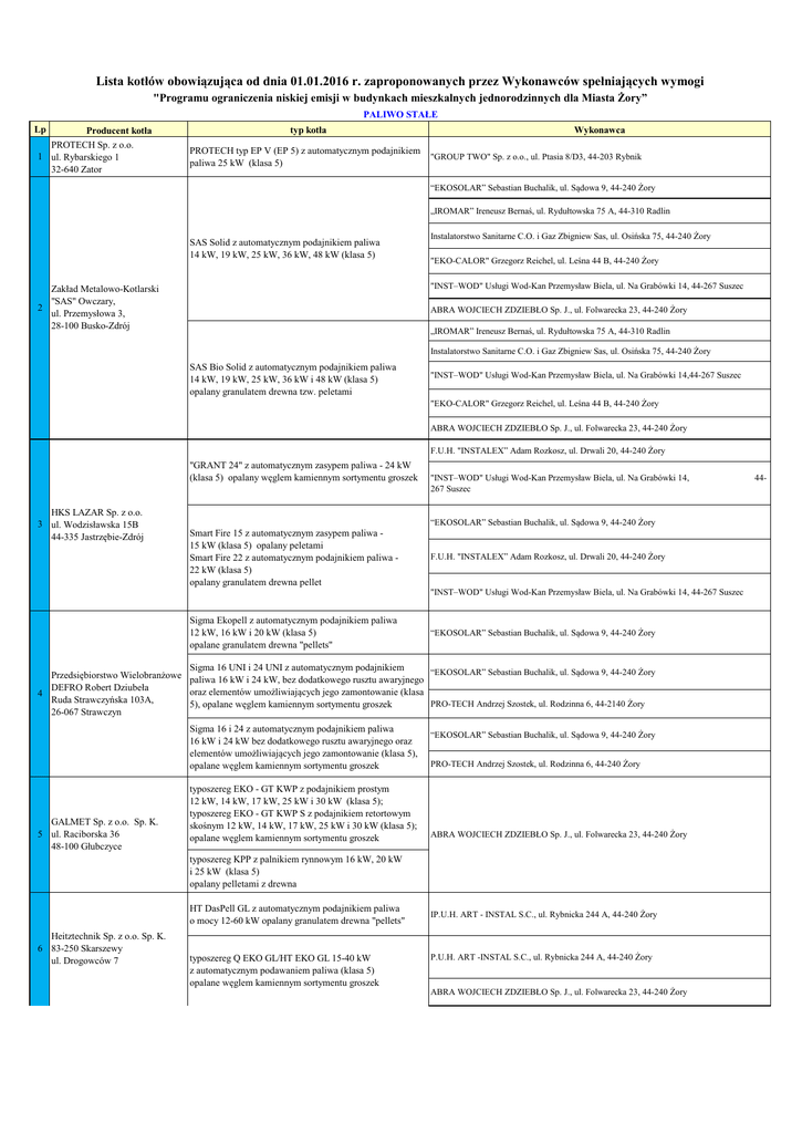 Lista kotłów obowiązująca od dnia 01.01.2016 r