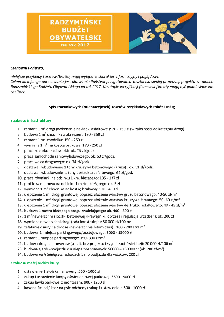 Szanowni Państwo, niniejsze przykłady kosztów (brutto) mają wyłącznie charakter informacyjny i poglądowy. Celem niniejszego opracowania jest ułatwienie Państwu przygotowania kosztorysu swojej propozycji projektu w ramach Radzymińskiego Budżetu Obywatelskiego na rok 2017. Na etapie weryfikacji finansowej koszty mogą być podniesione lub zaniżone. Spis szacunkowych (orientacyjnych) kosztów przykładowych robót i usług z zakresu infrastruktury 1. 2. 3. 4. 5. 6. 7. 8. 9. 10. 11. 12. 13. 14. 15. 16. 17. 18. 19. 20. 21. 22. 23. 24. remont 1 m2 drogi (wykonanie nakładki asfaltowej): 70 - 150 zł (w zależności od kategorii drogi) budowa 1 m2 chodnika z obrzeżem: 180 - 350 zł remont 1 m2 chodnika: 150 - 250 zł wymiana 1m2 na kostkę brukową: 170 - 250 zł praca koparko - ładowarki: ok. 73 zł/godz. praca samochodu samowyładowczego: ok. 50 zł/godz. praca walca drogowego: ok. 74 zł/godz. dostawa i wbudowanie 1 tony kruszywa betonowego (gruzu) : ok. 31 zł/godz. dostawa i wbudowanie 1 tony destruktu asfaltowego: 62 zł/godz. praca równiarki na odcinku 1 km. bieżącego: 135 - 137 zł profilowanie rowu na odcinku 1 metra bieżącego: ok. 5 zł wymiana 1 m2 chodnika na kostkę brukową: 170 - 400 zł ulepszenie 1 m2 drogi gruntowej poprzez ułożenie warstwy gruzu betonowego: 40-50 zł/m2 ulepszenie 1 m2 drogi gruntowej poprzez ułożenie warstwy kruszywa łamanego: 50- 60 zł/m2 ulepszenie 1 m2 drogi gruntowej poprzez ułożenie warstwy destruktu asfaltowego: 43 - 45 zł/m2 budowa 1 metra bieżącego progu zwalniającego: ok. 400 - 500 zł 1 m2 nawierzchni z kostki betonowej (krawężniki, obrzeża i regulacja urządzeń): ok. 200 zł wymiana nawierzchni drogi (cała konstrukcja): 50 000 zł/100 m2 załatanie dziury na drodze (nawierzchnia bitumiczna): 100 - 200 zł/1 m2 budowa 1 miejsca parkingowego/postojowego: 8000 - 15000 zł remont 1 miejsca parkingowego: 150- 300 zł/m2 budowa drogi dla rowerów (asfalt, bez projektu i sygnalizacji świetlnej): 20 000 zł/100 m2 budowa zjazdu-podjazdu dla niepełnosprawnych: 50000 – 150000 zł (ok. 200 zł/m2) budowa na istniejących schodach 1 mb podjazdu dla wózków: 200 zł z zakresu małej architektury 1. 2. 3. 4. ustawienie 1 stojaka na rowery: 500 - 1000 zł zakup i ustawienie lampy oświetleniowej parkowej: 6500 - 9000 zł zakup ławki parkowej z montażem: 900 - 1200 zł kosz na śmieci/ kosz na psie odchody (zakup i ustawienie): 500 - 1000 zł 5. 6. 7. 8. 9. 10. 11. 12. 13. 14. 15. 16. stół do gier towarzyskich (np. szachy, warcaby): 4000 - 10000 zł/szt betonowy stół do gry w ping-ponga: 5000 - 6000 zł betonowy stół do piłkarzyków: 7000 - 10000 zł urządzenie siłowni zewnętrznej: 3000 - 8000 zł budowa piaskownicy: 2000 - 4500 zł zestaw zabawowy mały: 12000 - 16000 zł zakup i montaż tablic informacyjnych: ok. 1200 zł/szt. wykonanie grilla miejskiego/gminnego: 60000 zł hamak miejski: 1500 - 3000 zł ustawienie 1 stojaka rowerowego: 300 - 500 zł ustawienie 1 podpórki dla rowerzystów przy przejściu dla pieszych: 500 - 900 zł zakup i montaż tablic informacyjnych: 1200 zł/szt z zakresu bezpieczeństwa publicznego i oświetlenia 1. 2. 3. 4. 5. 6. 7. 8. zakup i ustawienie latarni ulicznej z zasilaniem: 4000 - 15000 zł odmalowanie pasów - całe przejście: ok. 150 zł (23 - 36 z/m2) montaż lustra drogowego: ok. 1200 zł wyznaczenie kontrapasu: ok. 40 zł/mkw. wykonanie barierki ochronnej/ogrodzenia: 120 - 500 zl/mb zakup znaku drogowego: 300 - 700 zł/szt oświetlenie przejścia dla pieszych: ok. 40000 zł zainstalowanie spowalniacza ruchu wraz z wykonaniem projektu organizacji ruchu: 10 000 – 15 000 zł (budowa progu zwalniającego: 300 - 400 zł/mb) 9. wyznaczenie pasa rowerowego na jezdni (bez projektu): 7000 - 12000 zł/100 mb z zakresu zieleni miejskiej 1. wykonanie nasadzeń - drzewo, krzew - drzewo iglaste: 130 - 150 zł/ szt. - drzewo liściaste: 200 - 250 zł/szt. - krzew liściasty: 20 - 40 zł/szt. - krzew iglasty: 35 - 50 zł/szt 2. przygotowanie podłoża oraz wykonanie nasadzeń - drzewa iglaste o wysokości 1 -1,5 m: 250 - 400 zł/szt. 3. przygotowanie podłoża oraz wykonanie nasadzeń - drzewa liściaste o obwodzie pnia 14-18 cm:400-600 zł/szt. 4. zakup i posadzenie drzewa: 150 - 2 500 zł (zależy od obwodu pnia) 5. urządzenie trawnika: 8 - 40 zł/m2 6. urządzenie 1 m2 z rolki: 15 zł 7. posadzenie żywopłotu: 700 - 960 zł/10 mb 8. posadzenie pnączy: 80 - 100 zł/mb 9. założenie kwietnika, rabaty bylinowej (zakup roślin i posadzenie): ok. 250 zł/m2 10. zasianie łąki kwietnej zamiast trawnika: ok. 40 zł/m2 z zakresu kultury, kultury fizycznej, sportu, rekreacji i turystyki 1. wynajem obiektów w Radzymińskim Ośrodku Kultury i Sportu, Bibliotece Publicznej Miasta i Gminy Radzymin: zgodnie z cennikiem 2. urządzenie do siłowni zewnętrznych: 2500 - 5000 zł 3. wykonanie siłowni na świeżym powietrzu (10 - elementowej, ogrodzonej z ławkami): ok. 100000 zł 4. wynajem sceny (6 x 8m): ok. 2500 zł/dzień 5. wynajem sceny (8 x 10 m): ok. 10000 zł/dzień 6. samoobsługowa stacja - stojak z zestawem narzędzi i pompką na wszystkie rodzaje zaworów- dostępne bez opłat: 3000 - 6000 zł 7. spotkanie autorskie z ze znanym pisarzem: 700 - 1500 zł 8. zakup 50 nowości czytelniczych do biblioteki - książki popularno-naukowe: ok. 2500 zł - beletrystyka: 1600 - 2000 zł 9. projekcja jednego filmu kina plenerowego: ok. 4500 zł Uwaga! Opracowując szacunkową wartość składanego wniosku należy pamiętać, aby doliczyć ok. 5% całkowitej wartości inwestycji, uwzględniające koszty przygotowania dokumentacji (np. projektu, map). Opracowanie: Ref. Partycypacji i Polityki Społecznej
