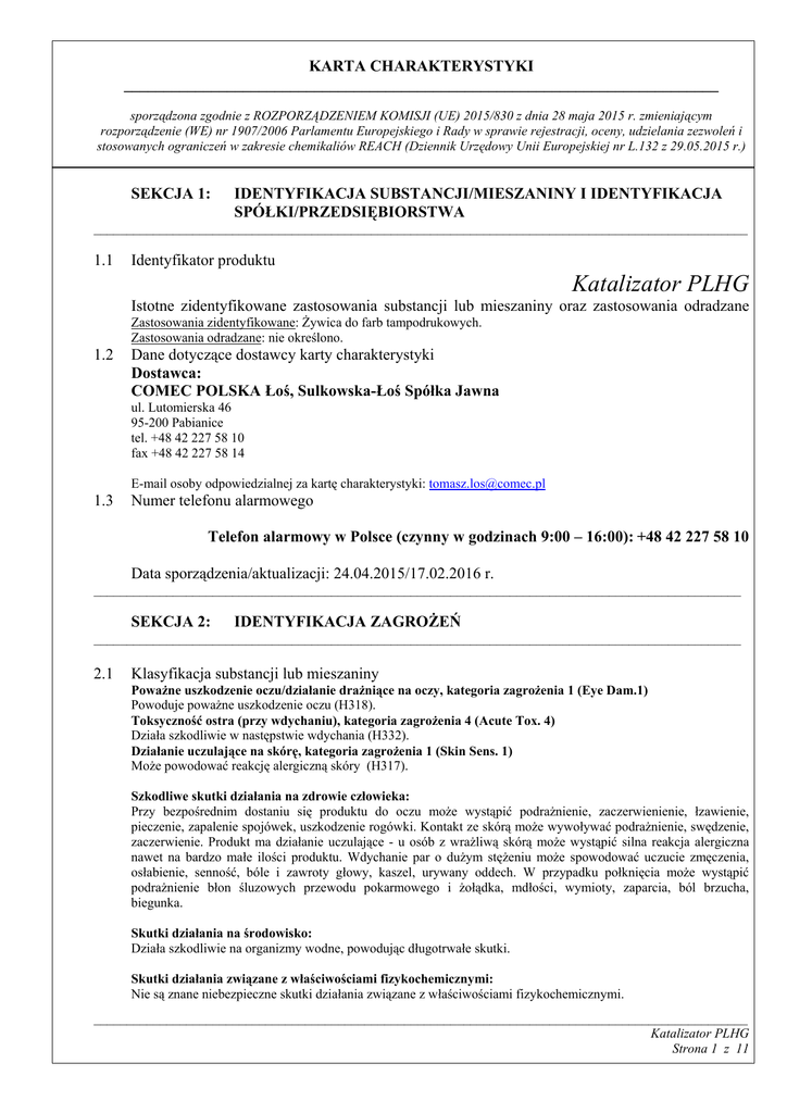 KARTA CHARAKTERYSTYKI ___________________________________________________________________________ sporządzona zgodnie z ROZPORZĄDZENIEM KOMISJI (UE) 2015/830 z dnia 28 maja 2015 r. zmieniającym rozporządzenie (WE) nr 1907/2006 Parlamentu Europejskiego i Rady w sprawie rejestracji, oceny, udzielania zezwoleń i stosowanych ograniczeń w zakresie chemikaliów REACH (Dziennik Urzędowy Unii Europejskiej nr L.132 z 29.05.2015 r.) SEKCJA 1: IDENTYFIKACJA SUBSTANCJI/MIESZANINY I IDENTYFIKACJA SPÓŁKI/PRZEDSIĘBIORSTWA ___________________________________________________________________________________________________ 1.1 Identyfikator produktu Katalizator PLHG Istotne zidentyfikowane zastosowania substancji lub mieszaniny oraz zastosowania odradzane Zastosowania zidentyfikowane: Żywica do farb tampodrukowych. Zastosowania odradzane: nie określono. 1.2 Dane dotyczące dostawcy karty charakterystyki Dostawca: COMEC POLSKA Łoś, Sulkowska-Łoś Spółka Jawna ul. Lutomierska 46 95-200 Pabianice tel. +48 42 227 58 10 fax +48 42 227 58 14 E-mail osoby odpowiedzialnej za kartę charakterystyki: [email protected] 1.3 Numer telefonu alarmowego Telefon alarmowy w Polsce (czynny w godzinach 9:00 – 16:00): +48 42 227 58 10 Data sporządzenia/aktualizacji: 24.04.2015/17.02.2016 r. __________________________________________________________________________________________________ SEKCJA 2: IDENTYFIKACJA ZAGROŻEŃ __________________________________________________________________________________________________ 2.1 Klasyfikacja substancji lub mieszaniny Poważne uszkodzenie oczu/działanie drażniące na oczy, kategoria zagrożenia 1 (Eye Dam.1) Powoduje poważne uszkodzenie oczu (H318). Toksyczność ostra (przy wdychaniu), kategoria zagrożenia 4 (Acute Tox. 4) Działa szkodliwie w następstwie wdychania (H332). Działanie uczulające na skórę, kategoria zagrożenia 1 (Skin Sens. 1) Może powodować reakcję alergiczną skóry (H317). Szkodliwe skutki działania na zdrowie człowieka: Przy bezpośrednim dostaniu się produktu do oczu może wystąpić podrażnienie, zaczerwienienie, łzawienie, pieczenie, zapalenie spojówek, uszkodzenie rogówki. Kontakt ze skórą może wywoływać podrażnienie, swędzenie, zaczerwienie. Produkt ma działanie uczulające - u osób z wrażliwą skórą może wystąpić silna reakcja alergiczna nawet na bardzo małe ilości produktu. Wdychanie par o dużym stężeniu może spowodować uczucie zmęczenia, osłabienie, senność, bóle i zawroty głowy, kaszel, urywany oddech. W przypadku połknięcia może wystąpić podrażnienie błon śluzowych przewodu pokarmowego i żołądka, mdłości, wymioty, zaparcia, ból brzucha, biegunka. Skutki działania na środowisko: Działa szkodliwie na organizmy wodne, powodując długotrwałe skutki. Skutki działania związane z właściwościami fizykochemicznymi: Nie są znane niebezpieczne skutki działania związane z właściwościami fizykochemicznymi. ___________________________________________________________________________________________________ Katalizator PLHG Strona 1 z 11 KARTA CHARAKTERYSTYKI ___________________________________________________________________________ sporządzona zgodnie z ROZPORZĄDZENIEM KOMISJI (UE) 2015/830 z dnia 28 maja 2015 r. zmieniającym rozporządzenie (WE) nr 1907/2006 Parlamentu Europejskiego i Rady w sprawie rejestracji, oceny, udzielania zezwoleń i stosowanych ograniczeń w zakresie chemikaliów REACH (Dziennik Urzędowy Unii Europejskiej nr L.132 z 29.05.2015 r.) 2.2 Elementy oznakowania Piktogramy: Hasło ostrzegawcze: Niebezpieczeństwo Zwroty wskazujące rodzaj zagrożenia: H317- Może powodować reakcję alergiczną skóry. H318 - Powoduje poważne uszkodzenie oczu. H332 - Działa szkodliwie w następstwie wdychania. Zwroty wskazujące środki ostrożności: P280 - Stosować rękawice ochronne/odzież ochronną/ochronę oczu/ochronę twarzy. P302 + P352 - W PRZYPADKU KONTAKTU ZE SKÓRĄ: umyć dużą ilością wody. P333+P313 - W przypadku wystąpienia podrażnienia skóry lub wysypki: Zasięgnąć porady/zgłosić się pod opiekę lekarza. P305 + P351 + P338 - W PRZYPADKU DOSTANIA SIĘ DO OCZU: Ostrożnie płukać wodą przez kilka minut. Wyjąć soczewki kontaktowe, jeżeli są i można je łatwo usunąć. Nadal płukać. P304+P340 - W PRZYPADKU DOSTANIA SIĘ DO DRÓG ODDECHOWYCH: wyprowadzić lub wynieść poszkodowanego na świeże powietrze i zapewnić mu warunki do swobodnego oddychania. P310 - Natychmiast skontaktować się z OŚRODKIEM ZATRUĆ/lekarzem. Dodatkowe wymagania dotyczące oznakowania: Zawiera: N-(3-(trimetoksysylilo)propylo)etylenodiaminę. 2.3 Inne zagrożenia Mieszanina nie spełnia kryteriów PBT i vPvB. __________________________________________________________________________________________________ SEKCJA 3: SKŁAD / INFORMACJA O SKŁADNIKACH ___________________________________________________________________________________________________ 3.2 Mieszanina Identyfikator produktu: Katalizator PLHG Składniki mieszaniny: Nazwa substancji N-(3-(Trimetoksysylilo)propylo) etylenodiamina Metanol nr indeksowy nr CAS nr WE uł. masowy w% - 1760-24-3 217-164-6 96 - 100 603-001-00-X 67-56-1 200-659-6 0.4 – 0.5 Klasy zagrożenia i kody kategorii Kody zwrotów wskazujących rodzaj zagrożenia Acute Tox. 4 Eye Dam. 1 Skin Sens. 1 Flam. Liq. 2 Acute Tox. 3 Acute Tox. 3 Acute Tox. 3 STOT SE 1 H332 H318 H317 H225 H331 H311 H301 H370 ___________________________________________________________________________________________________ Katalizator PLHG Strona 2 z 11 KARTA CHARAKTERYSTYKI ___________________________________________________________________________ sporządzona zgodnie z ROZPORZĄDZENIEM KOMISJI (UE) 2015/830 z dnia 28 maja 2015 r. zmieniającym rozporządzenie (WE) nr 1907/2006 Parlamentu Europejskiego i Rady w sprawie rejestracji, oceny, udzielania zezwoleń i stosowanych ograniczeń w zakresie chemikaliów REACH (Dziennik Urzędowy Unii Europejski