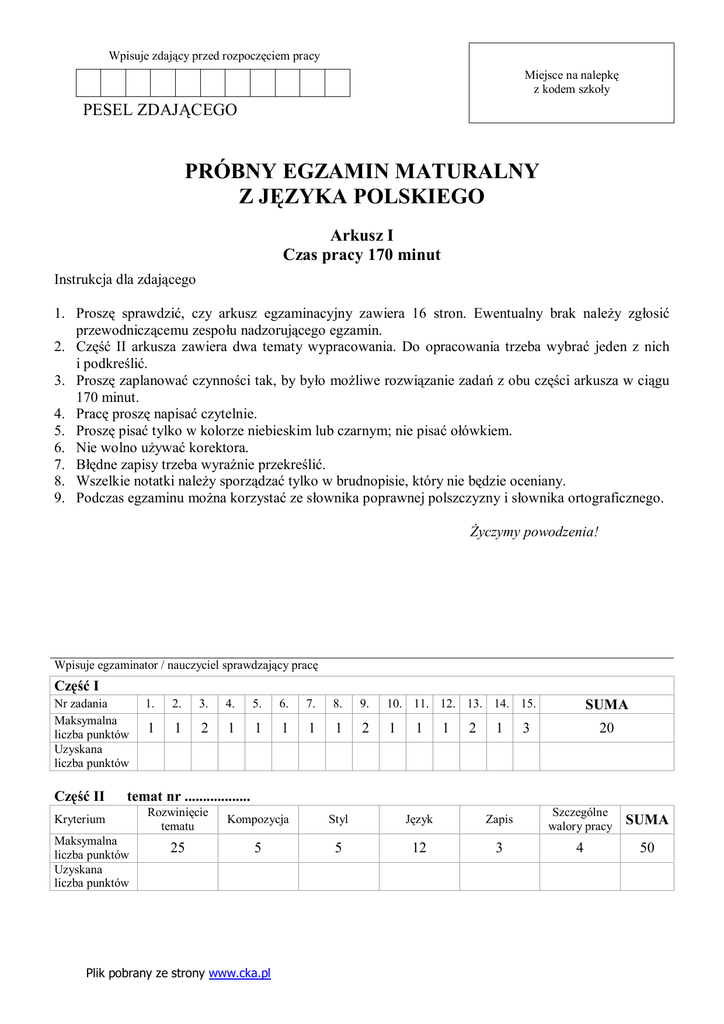 Wpisuje zdający przed rozpoczęciem pracy Miejsce na nalepkę z kodem szkoły PESEL ZDAJĄCEGO PRÓBNY EGZAMIN MATURALNY Z JĘZYKA POLSKIEGO Arkusz I Czas pracy 170 minut Instrukcja dla zdającego 1. Proszę sprawdzić, czy arkusz egzaminacyjny zawiera 16 stron. Ewentualny brak należy zgłosić przewodniczącemu zespołu nadzorującego egzamin. 2. Część II arkusza zawiera dwa tematy wypracowania. Do opracowania trzeba wybrać jeden z nich i podkreślić. 3. Proszę zaplanować czynności tak, by było możliwe rozwiązanie zadań z obu części arkusza w ciągu 170 minut. 4. Pracę proszę napisać czytelnie. 5. Proszę pisać tylko w kolorze niebieskim lub czarnym; nie pisać ołówkiem. 6. Nie wolno używać korektora. 7. Błędne zapisy trzeba wyraźnie przekreślić. 8. Wszelkie notatki należy sporządzać tylko w brudnopisie, który nie będzie oceniany. 9. Podczas egzaminu można korzystać ze słownika poprawnej polszczyzny i słownika ortograficznego. Życzymy powodzenia! Wpisuje egzaminator / nauczyciel sprawdzający pracę Część I Nr zadania Maksymalna liczba punktów Uzyskana liczba punktów Część II 1. 2. 3. 4. 5. 6. 7. 8. 9. 10. 11. 12. 13. 14. 15. 1 1 2 1 1 1 1 1 2 1 1 1 2 1 SUMA 3 20 temat nr .................. Kryterium Maksymalna liczba punktów Uzyskana liczba punktów Rozwinięcie tematu Kompozycja Styl Język Zapis Szczególne walory pracy SUMA 25 5 5 12 3 4 50 Plik pobrany ze strony www.cka.pl Część I – rozumienie czytanego tekstu Przeczytaj uważnie tekst Andrzeja Szczeklika, a następnie odpowiedz na pytania. Odpowiadaj tylko na podstawie tekstu, własnymi słowami. Udzielaj tylu odpowiedzi, o ile jesteś proszony. OCZYSZCZAJĄCA MOC 1. Przed sześciuset laty Petrarka twierdził, iż gdyby wziąć tysiąc ludzi cierpiących na tę samą chorobę i połowę z nich oddać w ręce lekarza, połowę zaś zostawić swojemu losowi, to ci ostatni mieliby lepsze szanse na wyzdrowienie. Przez wieki też powtarzano, iż między dobrym a złym lekarzem różnica jest ogromna, lecz między dobrym lekarzem a brakiem lekarza nie ma różnicy żadnej. Jeśliby tak było, to jak mogła przez tysiąclecia funkcjonować medycyna? Czym wytłumaczyć wyzdrowienia? 2. Paradoks ten wyjaśnił Hipokrates1 uzdrowicielską siłą natury. To w samej naturze – uczył on – drzemią dobroczynne, lecznicze siły. Trzeba zaufać naturze. Przy łóżku chorego obserwować bacznie, jak ona postępuje, pomagać jej, nigdy nie szkodzić. Takie też było pierwotne znaczenie aforyzmu primum non nocere: przede wszystkim nie szkodzić. I już w przedhipokratejskiej Grecji pralekarzy nazywano „oczyścicielami” (kathartai), wymieniając ich jednym tchem z magami, którzy znali zaklęcia miłosne i sprzedawali amulety oraz talizmany odczarowujące chorobę. Wierzono, iż chorobę zsyłają bogowie za karę, więc zadaniem lekarza-wróżbity było rozpoznać i wyjawić, jak oczyścić się z grzechu, by wrócić do zdrowia. Każdorazowe wejście do świątyni Asklepiosa2 poprzedzały: post, ablucje3 i ofiary. Kulminacja tych obrzędów, dramaturgia nocnych wydarzeń w świątyni, przywracających zdrowie, miała w sobie pierwiastek sceniczny, znamiona teatru, była sztuką. Ze sztuką łączyło ją też słowo katharsis. 3. Pojęcie katharsis wywodzi się zazwyczaj od Pitagorasa, ale ten termin pojawił się o wiele wcześniej, u początków sztuki greckiej – w chorei4, będącej zespoleniem tańca z muzyką, pieśnią i poezją. Uprawiana w czasie misteriów i obrzędów choreja służyła do złagodzenia i ukojenia uczuć, a „mówiąc mową ówczesną, do oczyszczenia dusz”, do katharsis. Pseudo-Plutarch – autor słynnego traktatu O muzyce z III wieku przed Chrystusem – wskazuje na jej wspólne z medycyną pochodzenie. 4. Pitagorejczycy wierzyli, że dusza więziona jest w ciele za swoje winy i będzie wyzwolona, gdy się z nich oczyści. To oczyszczenie uważali za „najwznioślejszy cel człowieka” i powzięli myśl, że jest ono możliwe dzięki muzyce. Jak pisze Arystoteles: „pitagorejczycy stosowali medycynę do oczyszczania ciała, a muzykę do oczyszczania dusz”. Stąd też muzykę mieli za stan wyjątkowy, za szczególny dar bogów. 5. Dopiero jednak Arystoteles uczynił z katharsis tajemniczą zagadkę, którą pozostała do dzisiaj. W swoim dziele Polityka anonsuje on słowo katharsis i obiecuje omówić je później szczegółowo, ze względu na jego kluczowe znaczenie. Tymczasem wraca do niego jeszcze tylko raz, w Poetyce, ujmując sprawę lapidarnie i niejednoznacznie. Otworzył w ten sposób pole do nieprzebranych interpretacji, które narastały przez tysiąclecia. Stagiryta5 świadomie zostawił węzłowe zagadnienie sztuki otwarte, gdyż wymyka się ono jednoznacznej interpretacji. Może dostrzegł on, iż w pierwszej sylabie słowa, które zamierzał określić, zaklęta była pradawna, nieprzenikniona tajemnica? „Ka” spotykamy w początkach historii starożytnego Egiptu jako wyraz, „którego znaczenie nadzwyczaj trudno pochwycić”. Łączono go z mocą podtrzymującą życie, siłą stwórczą, duszą człowieka. 1 Hipokrates – (ok. 460 – 377 p.n.e.), grecki lekarz z Kos, ojciec medycyny, najważniejszy przedstawiciel szkoły lekarskiej z Kos. 2 Asklepios – w mitologii greckiej heros, bóg sztuki lekarskiej, syn Apollina i Koronis. 3 ablucje – rzeczywiste lub symboliczne obrzędowe obmycie ciała, części ciała lub przedmiotów kultu. 4 choreja – w starożytnej Grecji: taniec w kole połączony ze śpiewem. 5 Stagiryta – Arystoteles pochodził ze Stagiry, dlatego zwano go Stagirytą. Strona 2 z 16 Plik pobrany ze strony www.cka.pl 6. Spierano się, czy katharsis wywiódł Arystoteles z medycyny, czy też z kultu religijnego. Niewątpliwie medyczne źródła były mu bliższe i wymieniając katharsis w Polityce, w odniesieniu do muzyki, posługuje się terminologią lekarską. W katharsis zawarty jest więc zarówno pierwi