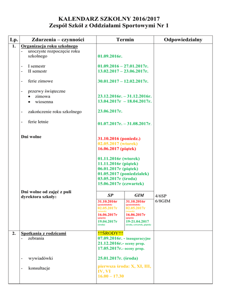 KALENDARZ SZKOLNY 2016/2017 Zespół Szkół z Oddziałami Sportowymi Nr 1 Zdarzenia – czynności Lp. 1. Termin Odpowiedzialny Organizacja roku szkolnego - uroczyste rozpoczęcie roku szkolnego 01.09.2016r. - I semestr II semestr 01.09.2016 – 27.01.2017r. 13.02.2017 – 23.06.2017r. - ferie zimowe 30.01.2017 – 12.02.2017r. - przerwy świąteczne zimowa wiosenna 23.12.2016r. – 31.12.2016r. 13.04.2017r – 18.04.2017r. - zakończenie roku szkolnego 23.06.2017r. - ferie letnie 01.07.2017r. – 31.08.2017r. Dni wolne 31.10.2016 (poniedz.) 02.05.2017 (wtorek) 16.06.2017 (piątek) 01.11.2016r (wtorek) 11.11.2016r (piątek) 06.01.2017r (piątek) 01.05.2017 (poniedziałek) 03.05.2017r (środa) 15.06.2017r (czwartek) Dni wolne od zajęć z puli dyrektora szkoły: 2. Spotkania z rodzicami - zebrania - wywiadówki - konsultacje SP GIM 31.10.2016r 31.10.2016r (poniedziałek) (poniedziałek) 02.05.2017r 02.05.2017r (wtorek) (wtorek) 16.06.2017r 16.06.2017r (piątek) (piątek) 19.04.2017r 19-21.04.2017 (środa) (środa, czwartek, piątek) !!!ŚRODY!!! 07.09.2016r. - inauguracyjne 21.12.2016r.- oceny prop. 17.05.2017r.- oceny prop. 25.01.2017r. (środa) pierwsza środa: X, XI, III, IV, VI 16.00 – 17.30 4/6SP 6/8GIM 3. Wyjazdy na zielone szkoły 4. Posiedzenia Rady Pedagogicznej - rada szkoleniowa 29.05.2017r – 02.06.2017r. Wychowanie do wartości. Kształtowanie postaw. (wrzesień 2017) Komunikacja interpersonalna, Praca nad relacjami. (styczeń 2017) 5. - rada klasyfikacyjna za I semestr rada analityczno – szkoleniowa 25.01.2017r. (środa) 25.01.2017r. (środa) - rada klasyfikacyjna za II semestr rada analityczna za II semestr 14.06.2017r. (środa) 21.06.2017r. (środa) Uroczystości szkolne i uczniowskie - Pasowanie ucznia 1 wrzesień 2016 r. p. Jęsiek 14.10.2016 r. p. Marciniak, p. Młodzińska p. Markowska / p. Grochowska - Dzień Edukacji Narodowej - Święto Niepodległości – akademie 10.11.2016 r. klasy I –III, klasy IV – VI, I – III gim wychowawcy p. Ostrowska p. Zapotoczny - Andrzejki – w klasach 30.11.2016 r. wychowawcy klas - Spotkania opłatkowe w klasach 22.12.2016 r. wychowawcy klas - Święto Konstytucji 3 Maja 28.04.2017 r. p. Matysiak p. Motała - Dzień Sportu klasy I – III klasy IV – VI, I – III gim. zawody pływackie ………... 2016r. wychowawcy klas + nauczyciele w-f + samorząd szkolny - Zakończenie roku szkolnego klasy I - III klasy IV - VI, klasy III gimn. 23.06.2017r. p. Anastaziak, p. Jakubczyk, p. Jędraszak, p. Markowska - rozpoczęcie r.sz.2017/2018 Ślubowanie klas I 01.09.2016 r. p. Kowalewska 6. 7. 9. Finały szkolne olimpiad i konkursów - geografia p. Makowska - j. polski p. Jesionowska - matematyka p. Jakubczyk - j. angielski SP p. Lewandowska - j. angielski GIM p. Marciniak - j. niemiecki p. Barańczak - j. francuski p. Kobierska - chemia p. Jasińska - biologia p. Perzyńska - fizyka p. Kiwilsza - wiedzy o społeczeństwie p. Motała - pływanie / sportowe trenerzy - krajowa olimpiada „Promocji zdrowego stylu życia” p. Majchrzak - informatyczny p. Olek - plastyczny p. Grocholska - humanistyczny SP p. Szyszka - matematyczny SP p. Jędraszak - przyrodniczy SP p. Pisarska - konkurs matematyczny „Kangur” p. Jędraszak, p. Duda - historyczny p. Zapotoczny Egzamin gimnazjalny Kl. III - część humanistyczna - część matemat.-przyrodnicza - część językowa Dzień otwarty i promocja szkoły 19.04.2017r. 20.04.2017r. 21.04.2017r. SP ………………….. p. Jankowska, p. Ciszak M.