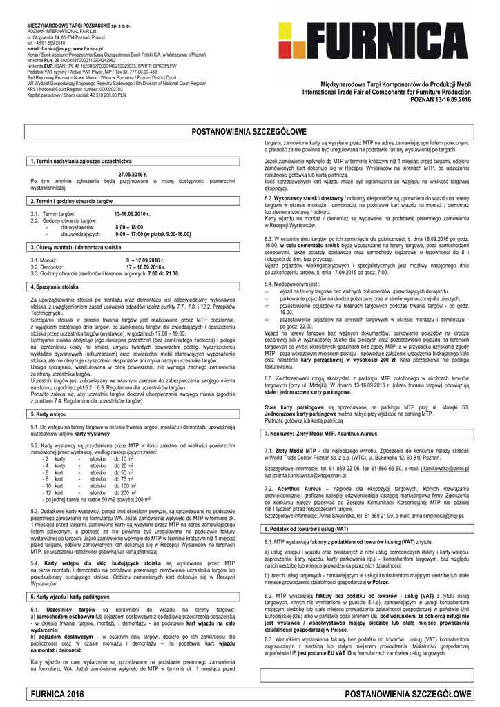MIĘDZYNARODOWE TARGI POZNAŃSKIE sp. z o. o. POZNAŃ INTERNATIONAL FAIR Ltd. ul. Głogowska 14, 60-734 Poznań, Poland tel. +48/61 869 2510 e-mail: [email protected]; www.furnica.pl Konto / Bank account: Powszechna Kasa Oszczędności Bank Polski S.A. w Warszawie o/Poznań Nr konta PLN: 38 102040270000110204242962 Nr konta EUR (IBAN): PL 46 102040270000140210929075, SWIFT: BPKOPLPW Podatnik VAT czynny / Active VAT Payer, NIP / Tax ID: 777-00-00-488 Sąd Rejonowy Poznań – Nowe Miasto i Wilda w Poznaniu / Poznan District Court VIII Wydział Gospodarczy Krajowego Rejestru Sądowego / 8th Division of National Court Register KRS / National Court Register number: 0000202703 Kapitał zakładowy / Share capital: 42 310 200,00 PLN Międzynarodowe Targi Komponentów do Produkcji Mebli International Trade Fair of Components for Furniture Production POZNAŃ 13-16.09.2016 POSTANOWIENIA SZCZEGÓŁOWE targami, zamówione karty są wysyłane przez MTP na adres zamawiającego listem poleconym, a płatność za nie powinna być uregulowana na podstawie faktury wystawionej po targach. 1. Termin nadsyłania zgłoszeń uczestnictwa 27.05.2016 r. Po tym terminie zgłoszenia będą przyjmowane w miarę dostępności powierzchni wystawienniczej. 2. Termin i godziny otwarcia targów 2.1. Termin targów: 2.2. Godziny otwarcia targów: dla wystawców: dla zwiedzających: 13-16.09.2016 r. 8:00 – 18:00 9:00 – 17:00 (w piątek 9.00-16.00) 3. Okresy montażu i demontażu stoiska 3.1. Montaż: 9 – 12.09.2016 r. 3.2. Demontaż: 17 – 18.09.2016 r. 3.3. Godziny otwarcia pawilonów i terenów targowych: 7.00 do 21.30. 4. Sprzątanie stoiska Za uporządkowanie stoiska po montażu oraz demontażu jest odpowiedzialny wykonawca stoiska, z uwzględnieniem zasad usuwania odpadów (patrz punkty 7.7., 7.8. i 12.2. Przepisów Technicznych). Sprzątanie stoiska w okresie trwania targów jest realizowane przez MTP codziennie, z wyjątkiem ostatniego dnia targów, po zamknięciu targów dla zwiedzających i opuszczeniu stoiska przez uczestnika targów (wystawcę), w godzinach 17.00 – 19.00. Sprzątanie stoiska obejmuje jego dostępną przestrzeń (bez zamkniętego zaplecza) i polega na: opróżnieniu koszy na śmieci, umyciu twardych powierzchni podłóg, wyczyszczeniu wykładzin dywanowych (odkurzaczem) oraz powierzchni mebli stanowiących wyposażenie stoiska, ale nie obejmuje czyszczenia eksponatów ani mycia naczyń uczestnika targów. Usługa sprzątania, wkalkulowana w cenę powierzchni, nie wymaga żadnego zamówienia ze strony uczestnika targów. Uczestnik targów jest zobowiązany we własnym zakresie do zabezpieczenia swojego mienia na stoisku (zgodnie z pkt.6.2. i 6.3. Regulaminu dla uczestników targów). Ponadto zaleca się, aby uczestnik targów dokonał ubezpieczenia swojego mienia (zgodnie z punktem 7.4. Regulaminu dla uczestników targów). 5. Karty wstępu 5.1. Do wstępu na tereny targowe w okresie trwania targów, montażu i demontażu upoważniają uczestników targów karty wystawcy. Jeżeli zamówienie wpłynęło do MTP w terminie krótszym niż 1 miesiąc przed targami, odbioru zamówionych kart dokonuje się w Recepcji Wystawców na terenach MTP, po uiszczeniu należności gotówką lub kartą płatniczą. Ilość sprzedawanych kart wjazdu może być ograniczona ze względu na wielkość targowej ekspozycji. 6.2. Wykonawcy stoisk i dostawcy / odbiorcy eksponatów są uprawnieni do wjazdu na tereny targowe w okresie montażu i demontażu, na podstawie kart wjazdu na montaż / demontaż lub zlecenia dostawy / odbioru. Karty wjazdu na montaż / demontaż są wydawane na podstawie pisemnego zamówienia w Recepcji Wystawców. 6.3. W ostatnim dniu targów, po ich zamknięciu dla publiczności, tj. dnia 16.09.2016 po godz. 16:00, w celu demontażu stoisk będą wpuszczane na tereny targowe, poza samochodami osobowymi, także pojazdy dostawcze oraz samochody ciężarowe o ładowności do 8 t i długości do 8 m, bez przyczep. Wjazd pojazdów wielkogabarytowych i specjalistycznych jest możliwy następnego dnia po zakończeniu targów, tj. dnia 17.09.2016 od godz. 7.00. 6.4. Niedozwolonym jest : • wjazd na tereny targowe bez ważnych dokumentów uprawniających do wjazdu, • parkowanie pojazdów na drodze pożarowej oraz w strefie wyznaczonej dla pieszych, • pozostawienie pojazdów na terenach targowych podczas trwania targów - po godz. 19.00, • pozostawienie pojazdów na terenach targowych w okresie montażu i demontażu po godz. 22.00. Wjazd na tereny targowe bez ważnych dokumentów, parkowanie pojazdów na drodze pożarowej lub w wyznaczonej strefie dla pieszych oraz pozostawienie pojazdu na terenach targowych po wyżej określonych godzinach bez zgody MTP, a w przypadku uzyskania zgody MTP - poza wskazanym miejscem postoju - spowoduje założenie urządzenia blokującego koło oraz nałożenie kary porządkowej w wysokości 200 zł. Kara porządkowa nie podlega fakturowaniu. 6.5. Zainteresowani mogą skorzystać z parkingu MTP położonego w okolicach terenów targowych (przy ul. Matejki). W dniach 13-16.09.2016 r. (okres trwania targów) obowiązują stałe i jednorazowe karty parkingowe. Stałe karty parkingowe są sprzedawane na parkingu MTP przy ul. Matejki 63. Jednorazowe karty parkingowe można nabyć przy wjeździe na parking MTP. Płatność gotówką lub kartą płatniczą. 7. Konkursy: Złoty Medal MTP, Acanthus Aureus 5.2. Karty wystawcy są przydzielane przez MTP w ilości zależnej od wielkości powierzchni zamówionej przez wystawcę, według następujących zasad: - 2 karty stoisko do 10 m2 - 4 karty stoisko do 20 m2 - 6 kart stoisko do 50 m2 - 8 kart stoisko do 75 m2 - 10 kart stoisko do 100 m2 - 12 kart stoisko do 200 m2 - po jednej karcie na każde 50 m2 powyżej 200 m2. Szczegółowe informacje: tel. 61 869 22 06, fax 61 866 66 50, e-mail: [email protected] lub [email protected]. 5.3. Dodatkowe karty wystawcy, ponad limit określony powyżej, są sprzedawane na podstawie p