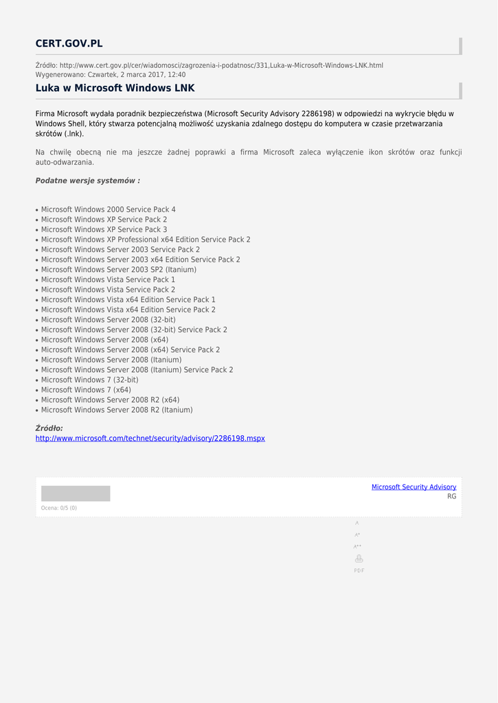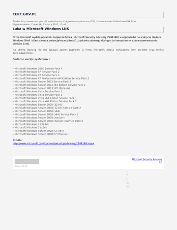 CERT.GOV.PL Źródło: http://www.cert.gov.pl/cer/wiadomosci/zagrozenia-i-podatnosc/331,Luka-w-Microsoft-Windows-LNK.html Wygenerowano: Czwartek, 2 marca 2017, 12:40 Luka w Microsoft Windows LNK Firma Microsoft wydała poradnik bezpieczeństwa (Microsoft Security Advisory 2286198) w odpowiedzi na wykrycie błędu w Windows Shell, który stwarza potencjalną możliwość uzyskania zdalnego dostępu do komputera w czasie przetwarzania skrótów (.lnk). Na chwilę obecną nie ma jeszcze żadnej poprawki a firma Microsoft zaleca wyłączenie ikon skrótów oraz funkcji auto-odwarzania. Podatne wersje systemów : ● ● ● ● ● ● ● ● ● ● ● ● ● ● ● ● ● ● ● ● ● Microsoft Windows 2000 Service Pack 4 Microsoft Windows XP Service Pack 2 Microsoft Windows XP Service Pack 3 Microsoft Windows XP Professional x64 Edition Service Pack 2 Microsoft Windows Server 2003 Service Pack 2 Microsoft Windows Server 2003 x64 Edition Service Pack 2 Microsoft Windows Server 2003 SP2 (Itanium) Microsoft Windows Vista Service Pack 1 Microsoft Windows Vista Service Pack 2 Microsoft Windows Vista x64 Edition Service Pack 1 Microsoft Windows Vista x64 Edition Service Pack 2 Microsoft Windows Server 2008 (32-bit) Microsoft Windows Server 2008 (32-bit) Service Pack 2 Microsoft Windows Server 2008 (x64) Microsoft Windows Server 2008 (x64) Service Pack 2 Microsoft Windows Server 2008 (Itanium) Microsoft Windows Server 2008 (Itanium) Service Pack 2 Microsoft Windows 7 (32-bit) Microsoft Windows 7 (x64) Microsoft Windows Server 2008 R2 (x64) Microsoft Windows Server 2008 R2 (Itanium) Źródło: http://www.microsoft.com/technet/security/advisory/2286198.mspx Microsoft Security Advisory RG Ocena: 0/5 (0)