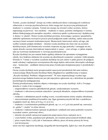 Gotowość szkolna a ryzyko dysleksji Termin „ryzyko dysleksji” stosuje się wobec młodszych dzieci wykazujących wybiórcze zaburzenia w rozwoju psychoruchowym, które mogą stać się przyczyną późniejszych trudności w czytaniu i pisaniu. Termin ten stosuje się również wobec uczniów, którzy napotykają na pierwsze –lecz nasilone – trudności w nauce, pomimo inteligencji w normie, dobrze funkcjonujących narządów zmysłów, właściwej opieki wychowawczej i dydaktycznej w domu i w szkole1. Dzieci ryzyka dysleksji powinny, korzystając z pomocy specjalistów, nadrobić opóźnienia rozwojowe jeszcze przed podjęciem nauki szkolnej, zanim nauczyciele zaczną je karać ocenami niedostatecznymi. Skuteczność interwencji zależy od tego, jak szybko zostanie podjęte działanie – dziecko ryzyka dysleksji nie musi stać się uczniem dyslektycznym, jeśli dostatecznie wcześnie rozpozna się jego potrzeby i zareaguje na nie, zanim dziecko zacznie doświadczać niepowodzeń w nauce – oraz od tego, w jakim stopniu uda się wyrównać dysharmonie w rozwoju psychoruchowym. Ryzyko dysleksji nie jest stanem braku ogólnej zdolności do sprostania wymaganiom szkoły, lecz brakiem zdolności do uczenia się określonych czynności: czytania i (lub) pisania. Dziecko 6–7-letnie z wysokim ryzykiem dysleksji nie jest zatem w pełni gotowe do podjęcia nauki szkolnej i najlepszym rozwiązaniem dla niego będzie odroczenie obowiązku szkolnego oraz – koniecznie – poddanie intensywnej pracy korekcyjno-kompensacyjnej w przedszkolu i w domu. Ocenę ryzyka dysleksji może przeprowadzić nauczyciel przedszkola lub sami rodzice, wykorzystując Skalę Ryzyka Dysleksji Marty Bogdanowicz opublikowaną w książce „Ryzyko dysleksji. Problem i diagnozowanie”. W razie niepomyślnego wyniku tego przesiewowego badania konieczne jest jak najszybsze zgłoszenie się z dzieckiem do poradni psychologiczno-pedagogicznej. Poniżej przedstawiamy niektóre objawy wskazujące na ryzyko dysleksji. Jeśli u Twojego dziecka w wieku 6 lat występuje: nieprawidłowa wymowa jakichkolwiek głosek, zniekształcanie wyrazów, trudności z odwzorowywaniem szlaczków i prostych obrazków, nieprawidłowe trzymanie ołówka, trudności z układaniem puzzli według wzoru, wyszukiwaniem różnic między obrazkami, nierozróżnianie podobnych kształtów (np. figur geometrycznych) lub liter o podobnym wyglądzie (myli np. litery p-b-d-g, t-ł, m-n-w), trudności z rozróżnieniem podobnych głosek, np. z-s, w-f, g-k (nie potrafi np. zauważyć, że „górka” i „kurka” to różne słowa), trudności z dokonywaniem operacji na głoskach i sylabach (nie umie podzielić wyrazów, wyszukać rymów, porównać słów), dziecko nie potrafi zastosować poprawnie pojęć prawa-lewa, nad-pod, na-w, czyta bardzo wolno, pojedynczymi głoskami, nie rozumie przeczytanych krótkich zdań, pisze często litery i cyfry jak w lustrzanym odbiciu, pisze od strony prawej do lewej, jest leworęczne, może ono być zagrożone dysleksją, dysgrafią lub dysortografią. Zgłoś się z nim do poradni psychologiczno-pedagogicznej, która pomoże zapobiec rozwinięciu się w przyszłości problemów z czytaniem i pisaniem. Pamiętaj! Ryzyko dysleksji to nie wyrok. Jeśli Twoje dziecko wcześnie zacznie wykonywać odpowiednie ćwiczenia według wskazań psychologa i pedagoga, najprawdopodobniej nie zostanie dyslektykiem. Dzięki wczesnej diagnozie w poradni możesz uchronić je przed przykrymi trudnościami w nauce. Bibliografia: 1. Materiały szkoleniowe - Monika Gołubiew – Konieczna PP-P Nr 7 w Gdańsku 2. Informator dla rodziców 5- i 6-latków. Czy Twoje dziecko jest gotowe do szkoły? 3. Publikacja bezpłatna przygotowana w ramach projektu „Nasza Poradnia: pomoc psychologicznopedagogiczna dla zwiększenia szans edukacyjnych dzieci z powiatu limanowskiego i okolic” nr UDA.POKL.09.05.00-12-082/07-00 4. M. Bogdanowicz, Ryzyko dysleksji. Problem i diagnozowanie. Wydawnictwo Harmonia, 5. Gdańsk 2005. 6. E. Gruszczyk-Kolczyńska, Dzieci ze specyficznymi trudnościami w uczeniu się matematyki. 7. Przyczyny, diagnoza, zajęcia korekcyjno-wyrównawcze. WSiP, Warszawa 2006. 8. B. Janiszewska, Ocena dojrzałości szkolnej. Seventh Sea, Warszawa 2006. 9. E. Koźniewska (red.), Skala Gotowości Szkolnej. CMPP-P, Warszawa 2006. 10. B. Wilgocka-Okoń, Gotowość szkolna dzieci sześcioletnich. Wydawnictwo Akademickie 11. „Żak” , Warszawa 2003.