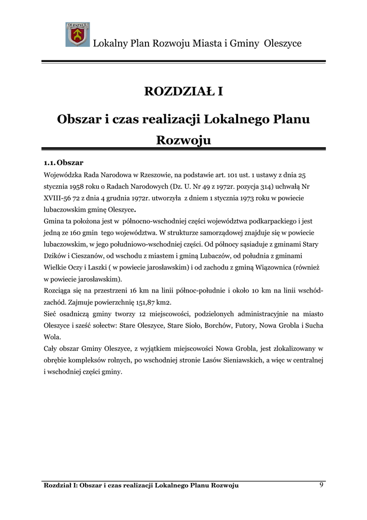 Lokalny Plan Rozwoju Miasta i Gminy Oleszyce ROZDZIAŁ I Obszar i czas realizacji Lokalnego Planu Rozwoju 1.1. Obszar Wojewódzka Rada Narodowa w Rzeszowie, na podstawie art. 101 ust. 1 ustawy z dnia 25 stycznia 1958 roku o Radach Narodowych (Dz. U. Nr 49 z 1972r. pozycja 314) uchwałą Nr XVIII-56 72 z dnia 4 grudnia 1972r. utworzyła z dniem 1 stycznia 1973 roku w powiecie lubaczowskim gminę Oleszyce. Gmina ta położona jest w północno-wschodniej części województwa podkarpackiego i jest jedną ze 160 gmin tego województwa. W strukturze samorządowej znajduje się w powiecie lubaczowskim, w jego południowo-wschodniej części. Od północy sąsiaduje z gminami Stary Dzików i Cieszanów, od wschodu z miastem i gminą Lubaczów, od południa z gminami Wielkie Oczy i Laszki ( w powiecie jarosławskim) i od zachodu z gminą Wiązownica (również w powiecie jarosławskim). Rozciąga się na przestrzeni 16 km na linii północ-południe i około 10 km na linii wschódzachód. Zajmuje powierzchnię 151,87 km2. Sieć osadniczą gminy tworzy 12 miejscowości, podzielonych administracyjnie na miasto Oleszyce i sześć sołectw: Stare Oleszyce, Stare Sioło, Borchów, Futory, Nowa Grobla i Sucha Wola. Cały obszar Gminy Oleszyce, z wyjątkiem miejscowości Nowa Grobla, jest zlokalizowany w obrębie kompleksów rolnych, po wschodniej stronie Lasów Sieniawskich, a więc w centralnej i wschodniej części gminy. Rozdział I: Obszar i czas realizacji Lokalnego Planu Rozwoju 9 Lokalny Plan Rozwoju Miasta i Gminy Oleszyce „Lokalny Plan Rozwoju Miasta i Gminy Oleszyce na lata 2007-2015” z poszerzoną prognozą do roku 2020 będzie realizowany w obrębie całej gminy, ze szczególnym uwzględnieniem obszarów rozwojowych wybranych w procesie delimitacji. Lokalny Plan Rozwoju jest dokumentem planistycznym, który dotyczy obszaru całej gminy Oleszyce. Realizacja zawartych w nim działań będzie zorientowana na osiągnięcie długotrwałego i zrównoważonego rozwoju gminy. Plan stanowi uszczegółowienie założeń Studium Uwarunkowań i Kierunków Zagospodarowania Przestrzennego Miasta i Gminy Oleszyce, Strategii Rozwoju Miasta i Gminy Oleszyce,Planu Rozwoju Lokalnego Miasta i Gminy Oleszyce na lata 2004-2006 i innych dokumentów strategicznych. W planie są zawarte propozycje działań i zadań inwestycyjnych, których realizacja przyczyni się do osiągnięcia celów strategicznych gminy, określonych w dokumencie strategii. Lokalny Plan Rozwoju określa nie tylko ogólne cele, lecz konkretne zadania, terminy ich realizacji oraz sposoby finansowania. Poszerza to możliwości inwestycyjne, umożliwia koncentrację inwestycji, a tym samym zwiększa szybkość ich realizacji, jednocześnie zmniejszając koszty. Lokalny Plan Rozwoju z Wieloletnim Planem Inwestycyjnym i Wieloletnim Planem Finansowym przygotowany został jako dokument programowy ukierunkowujący politykę Gminy Oleszyce w zakresie rozwoju społeczno-gospodarczego w wyznaczonym horyzoncie czasu, to jest na lata 2007 – 2015. Inwestycje na terenie gminy Oleszyce będą realizowane etapami. Będą w znacznej części współfinansowane ze środków finansowych pochodzących z funduszy strukturalnych UE i Mechanizmów Finansowych EOG. Celem Lokalnego Planu Rozwoju jest zapewnienie optymalnego rozwoju inicjatyw w wymiarze indywidualnym i zbiorowym w sferze gospodarczej i społecznej, którego skutki mają być skierowane na tworzenie nowych miejsc pracy i zapewnienie, jak najlepszych warunków życia mieszkańcom gminy, w tym bezpieczeństwa publicznego oraz poprawę stanu środowiska naturalnego i rewitalizację bogactwa dziedzictwa kulturowego. Działania te będą w pierwszej kolejności skierowane na obszary rozwojowe Miasta i Gminy Oleszyce, takie jak: Rozdział I: Obszar i czas realizacji Lokalnego Planu Rozwoju 10 Lokalny Plan Rozwoju Miasta i Gminy Oleszyce OBSZARY ROZWOJOWE: 1. Infrastruktura techniczna, 2. Infrastruktura społeczna, 3. Kultura i dziedzictwo kulturowe, 4. Turystyka, Sport i Rekreacja, 5. Promocja przedsiębiorczości. Klasyczne podejście delimitacji obszarów problemowych w ujęciu obszarowym, znacznie ogranicza zakres zadań i problemów występujących na terenie Miasta i Gminy Oleszyce. Dlatego delimitacja obszarów problemowych została dokonana w nowatorski sposób - w obrębie obszarów rozwojowych. Obszar rozwojowy, to obszar w ujęciu przestrzennym, w obrębie którego, zostały zidentyfikowane najważniejsze problemy oraz harmonogram planowanych działań inwestycyjnych. Granice administracyjne Gminy Oleszyce WOJEWÓDZTWO Podkarpackie POWIAT lubaczowski POWIERZCHNIA 15 187 ha SOŁECTWA Stare Oleszyce, Stare Sioło, Borchów, Futory, Nowa Grobla i Sucha Wola. Rozdział I: Obszar i czas realizacji Lokalnego Planu Rozwoju 11 Lokalny Plan Rozwoju Miasta i Gminy Oleszyce Mapa Gminy Oleszyce Czas Cezura czasowa Lokalnego Planu Rozwoju obejmuje lata 2007–2015. Podstawą w pracach nad dokumentem było rozpoznanie sytuacji społeczno-gospodarczej na terenie gminy Oleszyce oraz szerokie konsultacje społeczne. Prowadzone były w ramach procesu przygotowania dokumentu i polegały na przeprowadzeniu serii spotkań z kluczowymi reprezentantami społeczności lokalnej, którzy pełnią funkcję lokalnych liderów opinii publicznej. Lokalny Plan Rozwoju przedstawia sytuację społeczno-ekonomiczną gminy, formułuje obszary rozwoju oraz szacuje spodziewane efekty planowanych przedsięwzięć i Rozdział I: Obszar i czas realizacji Lokalnego Planu Rozwoju 12 Lokalny Plan Rozwoju Miasta i Gminy Oleszyce wpływ na przebieg procesów rozwojowych, a także wskazuje kierunki zaangażowania środków funduszy strukturalnych UE, MF EOG i środków własnych gminy. „Lokalny Plan Rozwoju Miasta i Gminy Oleszyce na lata 2007-2015” z poszerzoną prognozą do roku 2020, to zbiór konkretnych, realnych, niezbędnych dla rozwoju społeczności lokalnej działań, odzwierciedla faktyczne potrzeby, a jego realizacja le