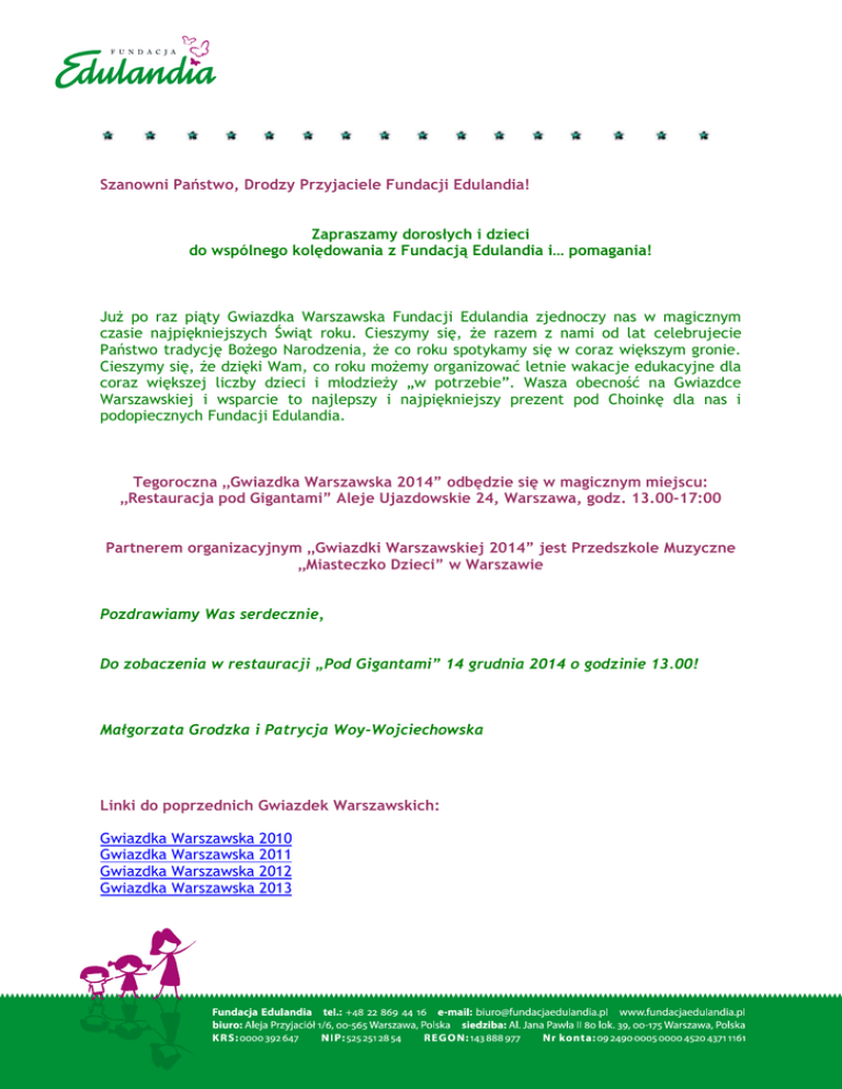 Szanowni Państwo, Drodzy Przyjaciele Fundacji Edulandia! Zapraszamy dorosłych i dzieci do wspólnego kolędowania z Fundacją Edulandia i… pomagania! Już po raz piąty Gwiazdka Warszawska Fundacji Edulandia zjednoczy nas w magicznym czasie najpiękniejszych Świąt roku. Cieszymy się, że razem z nami od lat celebrujecie Państwo tradycję Bożego Narodzenia, że co roku spotykamy się w coraz większym gronie. Cieszymy się, że dzięki Wam, co roku możemy organizować letnie wakacje edukacyjne dla coraz większej liczby dzieci i młodzieży „w potrzebie”. Wasza obecność na Gwiazdce Warszawskiej i wsparcie to najlepszy i najpiękniejszy prezent pod Choinkę dla nas i podopiecznych Fundacji Edulandia. Tegoroczna „Gwiazdka Warszawska 2014” odbędzie się w magicznym miejscu: „Restauracja pod Gigantami” Aleje Ujazdowskie 24, Warszawa, godz. 13.00-17:00 Partnerem organizacyjnym „Gwiazdki Warszawskiej 2014” jest Przedszkole Muzyczne „Miasteczko Dzieci” w Warszawie Pozdrawiamy Was serdecznie, Do zobaczenia w restauracji „Pod Gigantami” 14 grudnia 2014 o godzinie 13.00! Małgorzata Grodzka i Patrycja Woy-Wojciechowska Linki do poprzednich Gwiazdek Warszawskich: Gwiazdka Warszawska 2010 Gwiazdka Warszawska 2011 Gwiazdka Warszawska 2012 Gwiazdka Warszawska 2013 "Gwiazdka Warszawska 2014" Fundacji Edulandia 14 grudnia 2014 godz. 13.00-17.00 Restauracja "Pod Gigantami" Aleje Ujazdowskie 24 w Warszawie Bilety: 1 bilet dla osoby dorosłej – 180 złotych 1 bilet dla dziecka - 100 złotych dzieci poniżej 2-giego roku życia, zapraszamy bezpłatnie. Zakup biletów do 10 GRUDNIA : FUNDACJA EDULANDIA, Nr Konta: 75 1300 1036 2006 4234 9416 0001 W tytule przelewu prosimy o wpisanie nazwy imprezy i ilości biletów oraz nazwiska osoby wpłacającej lub uczestników, np.: „Gwiazdka Warszawska 2014, 2 bilety dorosłe, 1 bilet dziecko, Kowalscy“ . Informacja w: Biurze Fundacji Edulandia, Anna Kwoczko, tel. kom: + 48 502 102 670, tel. biuro: +48 22 869 44 16, e-mail: [email protected]. PROGRAM godzina 13.00 - rozpoczęcie Gwiazdki Warszawskiej 13:00 – Powitanie gości improwizacją muzyczną na wiolonczelę i gitarę duetu Malicki, Rogoziński. 13:30 – Życzenia od Fundacji Edulandia, świąteczny obiad 14:00 - Koncert kolęd oraz standardów świątecznych pod opieką muzyczną Patryka Rogozińskiego, chórek dziecięcy, młodzi soliści z Gimnazjum nr 12, fortepian oraz wokal Patryk Rogoziński , gitara Piotr Malicki, instrumenty perkusyjne oraz wokal Ricki Lion 14:30 – Przywołanie Świętego Mikołaja tańcem śnieżynek - fragment baletu „Dziadek Do Orzechów” przedstawiony przez tancerki baletowe z Teatru Palladium oraz dzieci z Przedszkola Muzycznego „Miasteczko Dzieci”. Skrzypce Justyna Linowska. 13:00-15:00 – Świąteczne zdjęcia rodzinne 13:00 - 17:00 - Rodzinne tworzenie dekoracji świątecznych, zabawy plastyczne dla dzieci. 13:00 - 17:00 - „Świąteczny Kiermasz Rzeczy Ładnych i Unikatowych”, „Dzieci Dzieciom” czyli prezenty od dzieci dla dzieci Podczas „Gwiazdki Warszawskiej 2014” Fundacja Edulandia zbiera gry planszowe, puzzle (w dobrym stanie i kompletne) oraz płyty CD z filmami, bajkami, grami komputerowymi i audiobookami dla dzieci do społecznych i szpitalnych świetlic edukacyjnych. Będzie nam bardzo miło jeśli Państwa pociechy podzielą się z dziećmi „w potrzebie” grami, audiobookami itd. – jak wyżej, którymi już się nie bawią. 17:00 – Odbiór pamiątkowych zdjęć 14:45 -Wizyta Świętego Mikołaja 15:00 -Zabawy muzyczne dla dzieci z Rickim Lion- artystą z Konga 16:00 - Rozstrzygnięcie aukcji obrazu autorstwa Andrzeja Fogtta 16:30 - Świąteczny koncert jazzowy Kasi (wokal) i Rafała (pianino) Rokickich