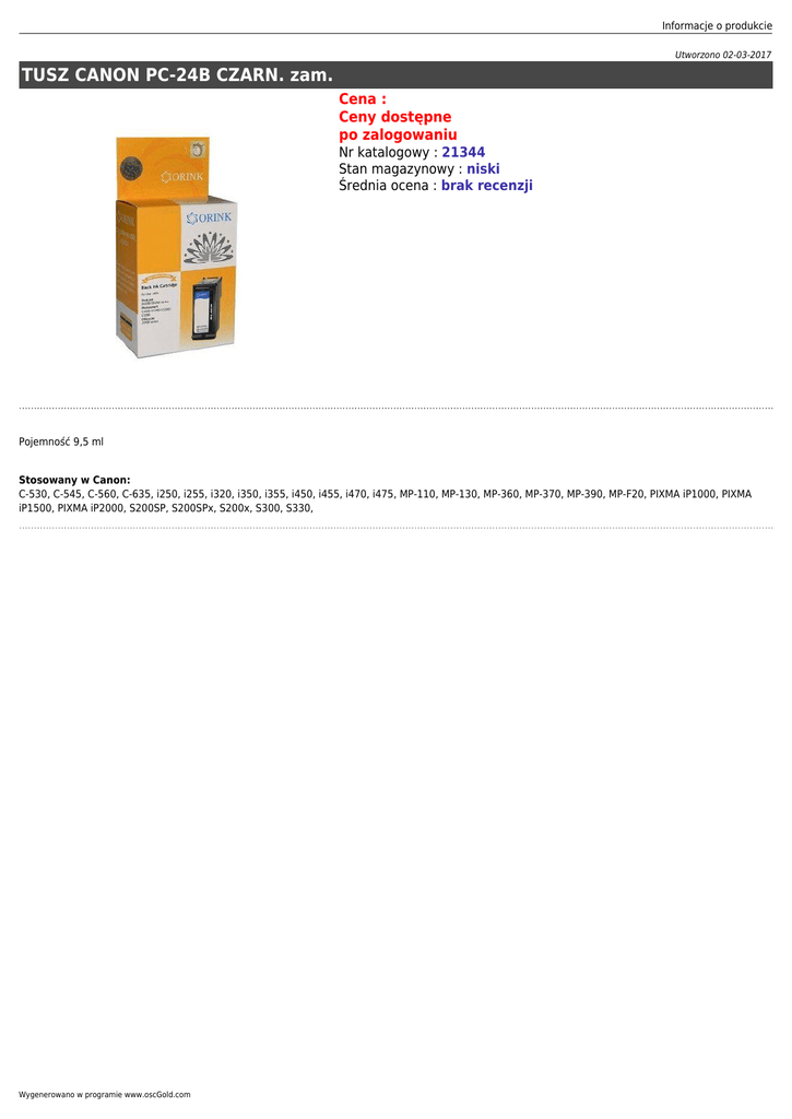 Informacje o produkcie Utworzono 02-03-2017 TUSZ CANON PC-24B CZARN. zam. Cena : Ceny dostępne po zalogowaniu Nr katalogowy : 21344 Stan magazynowy : niski Średnia ocena : brak recenzji Pojemność 9,5 ml Stosowany w Canon: C-530, C-545, C-560, C-635, i250, i255, i320, i350, i355, i450, i455, i470, i475, MP-110, MP-130, MP-360, MP-370, MP-390, MP-F20, PIXMA iP1000, PIXMA iP1500, PIXMA iP2000, S200SP, S200SPx, S200x, S300, S330, Wygenerowano w programie www.oscGold.com