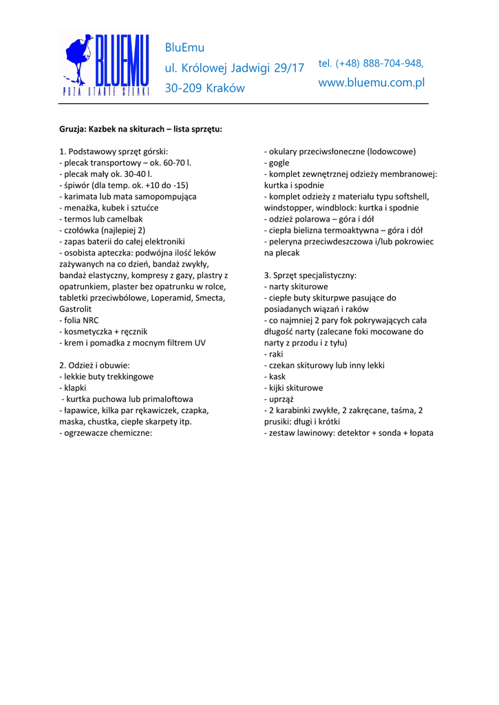 BluEmu ul. Królowej Jadwigi 29/17 30-209 Kraków tel. (+48) 888-704-948, www.bluemu.com.pl POLAND Gruzja: Kazbek na skiturach – lista sprzętu: 1. Podstawowy sprzęt górski: - plecak transportowy – ok. 60-70 l. - plecak mały ok. 30-40 l. - śpiwór (dla temp. ok. +10 do -15) - karimata lub mata samopompująca - menażka, kubek i sztućce - termos lub camelbak - czołówka (najlepiej 2) - zapas baterii do całej elektroniki - osobista apteczka: podwójna ilość leków zażywanych na co dzień, bandaż zwykły, bandaż elastyczny, kompresy z gazy, plastry z opatrunkiem, plaster bez opatrunku w rolce, tabletki przeciwbólowe, Loperamid, Smecta, Gastrolit - folia NRC - kosmetyczka + ręcznik - krem i pomadka z mocnym filtrem UV 2. Odzież i obuwie: - lekkie buty trekkingowe - klapki - kurtka puchowa lub primaloftowa - łapawice, kilka par rękawiczek, czapka, maska, chustka, ciepłe skarpety itp. - ogrzewacze chemiczne: - okulary przeciwsłoneczne (lodowcowe) - gogle - komplet zewnętrznej odzieży membranowej: kurtka i spodnie - komplet odzieży z materiału typu softshell, windstopper, windblock: kurtka i spodnie - odzież polarowa – góra i dół - ciepła bielizna termoaktywna – góra i dół - peleryna przeciwdeszczowa i/lub pokrowiec na plecak 3. Sprzęt specjalistyczny: - narty skiturowe - ciepłe buty skiturpwe pasujące do posiadanych wiązań i raków - co najmniej 2 pary fok pokrywających cała długość narty (zalecane foki mocowane do narty z przodu i z tyłu) - raki - czekan skiturowy lub inny lekki - kask - kijki skiturowe - uprząż - 2 karabinki zwykłe, 2 zakręcane, taśma, 2 prusiki: długi i krótki - zestaw lawinowy: detektor + sonda + łopata