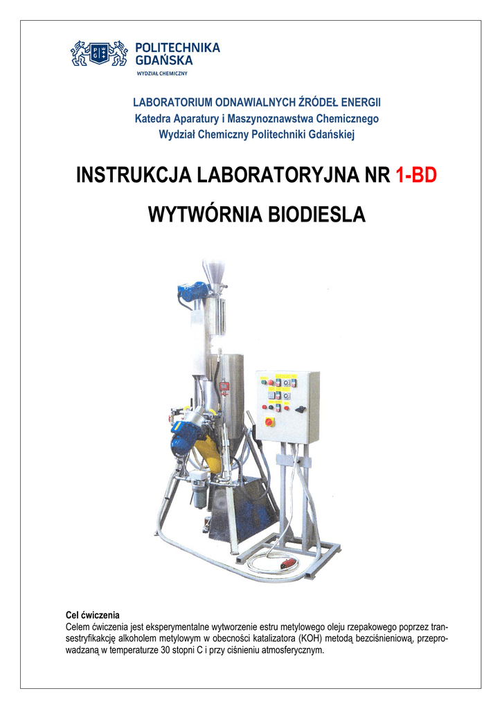 LABORATORIUM ODNAWIALNYCH ŹRÓDEŁ ENERGII Katedra Aparatury i Maszynoznawstwa Chemicznego Wydział Chemiczny Politechniki Gdańskiej INSTRUKCJA LABORATORYJNA NR 1-BD WYTWÓRNIA BIODIESLA Cel ćwiczenia Celem ćwiczenia jest eksperymentalne wytworzenie estru metylowego oleju rzepakowego poprzez transestryfikakcję alkoholem metylowym w obecności katalizatora (KOH) metodą bezciśnieniową, przeprowadzaną w temperaturze 30 stopni C i przy ciśnieniu atmosferycznym. PRZEPROWADZENIE PROCESU WYTWARZANIA BIODIESLA POPRZEZ REAKCJĘ TRANSESTRYFIKACJI OLEJU ROŚLINNEGO ALKOHOLEM METYLOWYM Produkcja biodiesla: Zastosowanie oleju roślinnego jako zamiennika lub komponentu oleju napędowego wymaga obróbki. Istnieje wiele metod produkcji biodiesla z olejów roślinnych np.: - kraking termiczny i katalityczny, - elektroliza, - transestryfikacja. Przemysłowe zastosowanie znalazła przede wszystkim metoda transestryfikacji, polegająca na otrzymywaniu estrów niższych alkoholi i wyższych kwasów tłuszczowych olejów roślinnych w reakcji mieszaniny oleju z alkoholem etylowym lub metylowym w obecności alkalicznego katalizatora (Rys. 1). CH2 – O – C CH – O – C CH2 – O – C Trójgliceryd O CH3 – OH R O R O + CH3 – OH 3R– C KOH O O – CH3 CH3 – OH CH2 – OH + CH – OH CH2 – OH R Metanol Katalizator Ester metylowy Glicerol Rys. 1 Ogólny schemat przebiegu reakcji transestryfikacji W wyniku reakcji 3 cząsteczki alkoholu metylowego tworzą z resztą kwasu tłuszczowego 3 cząsteczki monoestru oraz produkt odpadowy - cząsteczkę gliceryny. Standardowo proces przebiega następującymi etapami: - estryfikacja oleju rzepakowego, - rozdzielenie produktów estryfikacji, - oddestylowanie metanolu, - oczyszczanie estru. W rzeczywistości w rozbudowanej instalacji produkcyjnej proces złożony jest z większej ilości etapów. Parametrami, mającymi największy wpływ na przebieg reakcji, wydajność i jakość estrów metylowych oleju rzepakowego są proporcje molowe oleju do metanolu, rodzaj i ilość katalizatora, temperatura procesu, intensywność mieszania i czas separacji. Proces produkcji estrów alkoholowych można prowadzić w różnych warunkach temperatury i ciśnienia. W praktyce stosuje się najczęściej jedną z dwóch metod: ciśnieniową lub bezciśnieniową. 2 Stanowisko laboratoryjne: Laboratoryjna wytwórnia paliwa charakteryzuje się następującymi parametrami technicznymi: - Maksymalna ilość wytworzonego paliwa w ciągu 1 cyklu produkcyjnego: 60 l/24h - Zapotrzebowanie surowców do pełnego cyklu produkcyjnego: ♦ Olej roślinny: 70,5 l ♦ Metanol: 10,3 l ♦ Katalizator: 1,2 kg - Moc elektryczna zainstalowana: 3,35 kW - Masa: 130 kg - Obsługa: 1 osoba Stanowisko wyposażone jest w reaktor o pojemności 90 l, zbiornik do przygotowywania mieszanki katalitycznej (KOH+metanol) o pojemności 14 l oraz zbiornik na metanol, wszystkie wykonane z blachy kwasoodpornej. Ponadto w skład instalacji wchodzą także: grzałka elektryczna do podgrzania oleju rzepakowego, pompa, zespół filtracyjny, a także zestaw zaworów, ustawianymi w zadanej konfiguracji podczas kolejnych etapów i układ sterujący. Proces mieszania zachodzi w urządzeniu trzema sposobami zachodzącymi równolegle: - Mieszanie mechaniczne za pomocą obrotowego mieszadła napędzanego silnikiem - Mieszanie hydrauliczne poprzez przetłaczanie substratów z dna zbiornika do góry - Mieszadło statyczne – system odpowiednio ukształtowanych przegród w króćcu doprowadzającym mieszankę w górnej części zbiornika Układ sterujący Układ sterujący obsługiwany jest za pomocą przycisków i pokręteł umieszczonych na szafce sterowniczej (Rys. 2). 11 3 10 2 9 4 8 7 5 1 6 1 - wyłącznik główny, 2 - wyłącznik awaryjny, 3 - przycisk załączający sterowanie, 4 - regulator temperatury, 5 - włącznik podgrzewania oleju, 6 - załączanie / wyłączanie pompy metanolu, 7 - załączanie/wyłączanie mieszadła katalizatora, 8 - timer mieszadła katalizatora, 9 - timer mieszadła głównego, 10 - załączanie/wyłączanie timera mieszadła głównego, 11 - załączanie / wyłączanie pompy i mieszadła głównego. Rys. 2 Pulpit układu sterującego 3 Opis ustawień zaworów Urządzenie wyposażone jest w 8 zaworów. Poszczególne etapy pracy urządzenia wymagają określonych ustawień zaworów (Tabela 1). Tabela 1 Ustawienie zaworów sterujących Oznaczenie zaworu 1 2 3 4 5 6 7 8 Napełnianie zbiornika reaktora olejem roślinnym Z Z Z Z 2 2 Z Z Ustawienie zaworów sterujących Etap procesu technologicznego – położenie zaworów Napełnienie Reestryfikacja Odprowadze- Odprowadzezbiornika nie gliceryny nie gliceryny mieszalnika Etap 1 Etap 2 metanolem Z Z O Z Z O Z O Z Z Z O Z O Z O 2 1 1 1 2 2 1 1 O Z Z Z Z O Z Z Filtracja paliwa Z O Z O 1 1 Z Z Zalecenia wstępne: Należy pamiętać, że olej roślinny podczas przechowywania narażony jest na zachodzące niekorzystne procesy chemiczne, polegające między innymi na wzroście zawartości wolnych kwasów tłuszczowych. Powodują one w procesie estryfikacji niekorzystny efekt zmydlenia znacznej części oleju, powodując pogorszenie jakości paliwa. Dlatego najkorzystniejsze jest stosowanie stosunkowo świeżego oleju rzepakowego. Na jakość wytwarzanego tą technologią paliwa wpływają przede wszystkim następujące czynniki: - jakość zastosowanych reagentów, - dokładność odmierzenia ilości składników potrzebnych do procesu, - przestrzeganie czasów trwania poszczególnych etapów procesu produkcji. Przed przystąpieniem do transestryfikacji większej ilości oleju roślinnego w zbiorniku-reaktorze zaleca się przeprowadzić próbę na małej ilości oleju (1 litr) dla wypróbowania obliczonej proporcji reagentów. Jeżeli zastosowana próbka ulegnie transestryfikacji, wówczas obliczone proporcje mogą być zastosowane do produkcji większej ilości paliwa. Przebieg ćwiczenia: Po włączeniu panelu sterującego włącznikiem głó