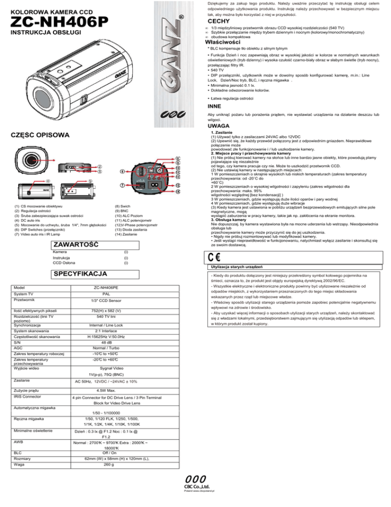 Dziękujemy za zakup tego produktu. Należy uważnie przeczytać tę instrukcję obsługi celem odpowiedniego użytkowania produktu. Instrukcję należy przechowywać w bezpiecznym miejscu KOLOROWA KAMERA CCD tak, aby można było korzystać z niej w przyszłości. ZC-NH406P CECHY • • • INSTRUKCJA OBSŁUGI 1/3 międzyliniowy przetwornik obrazu CCD wysokiej rozdzielczości (540 TV) Szybkie przełączanie między trybem dziennym i nocnym (kolorowy/monochromatyczny) obudowa kompaktowa Właściwości * BLC kompensuje tło obiektu z silnym tylnym • Funkcja Dzień i noc zapewniają obraz w wysokiej jakości w kolorze w normalnych warunkach oświetleniowych (tryb dzienny) i wysoka czułość czarno-biały obraz w słabym świetle (tryb nocny), przełączając filtry IR. • 540 TV • DIP przełączniki, użytkownik może w dowolny sposób konfigurować kamerę, m.in.: Line Lock, Dzień/Noc tryb, BLC, i ręczna migawka . • Minimalna jasność 0.1 lx. • Dokładne odwzorowanie kolorów. • Łatwa regulacja ostrości INNE Aby uniknąć pożaru lub porażenia prądem, nie wystawiać urządzenia na działanie deszczu lub wilgoci. UWAGA 1. Zasilanie (1) Używać tylko z zasilaczami 24VAC albo 12VDC (2) Upewnić się, że każdy przewód połączony jest z odpowiednim gniazdem. Nieprawidłowe połączenie może powodować złe funkcjonowanie i / lub uszkodzenie kamery. 2. Miejsce pracy i przechowywania kamery (1) Nie próbuj kierować kamery na słońce lub inne bardzo jasne obiekty, które powodują plamy pojawiające się niezależnie od tego, czy kamera pracuje czy nie. Może to uszkodzić przetwornik CCD. (2) Nie ustawiaj kamery w następujących miejscach: 1 W pomieszczeniach o skrajnie wysokich lub niskich temperaturach (zakres temperatury przechowywania: od -20˚C do +60˚C) 2 W pomieszczeniach o wysokiej wilgotności i zapyleniu (zakres wilgotności dla przechowywania: maks. 95% wilgotności względnej [bez kondensacji] ) 3 W pomieszczeniach, gdzie występują duże ilości oparów i pary wodnej 4 W pomieszczeniach, gdzie występują duże wibracje (3) Kiedy kamera jest ustawiona w pobliżu urządzeń bezprzewodowych emitujących silne pole magnetyczne, mogą wystąpić zaburzenia w pracy kamery, takie jak np. zakłócenia na ekranie monitora. 3. Obsługa kamery Nie dopuszczaj, by kamera wystawiona była na mocne uderzenia lub wstrząsy. Nieodpowiednia obsługa lub przechowywanie kamery może przyczynić się do jej uszkodzenia. • Nigdy nie próbuj rozmontowywać lub modyfikować kamery. • Jeśli wystąpi nieprawidłowość w funkcjonowaniu, natychmiast wyłącz zasilanie i skonsultuj się ze swoim dostawcą. CZĘŚĆ OPISOWA (1) (2) (3) (4) (5) (6) (7) CS mocowanie obiektywu Regulacja ostrości Śruba zabezpieczająca suwak ostrości DC auto iris Mocowanie do uchwytu, śruba 1/4", 7mm głębokości DIP Switches (przełączniki) Video auto iris i IR Lamp (8) Swich (9) BNC (10) ALC Poziom (11) ALC potencjometr (12)V-Phase potencjometr (13) Dioda zasilania (14) Zasilanie ZAWARTOŚĆ Kamera (i) Instrukcja CCD Osłona (i) (i) C€ Utylizacja starych urządzeń SPECYFIKACJA Model ZC-NH406PE System TV PAL Przetwornik 1/3" CCD Sensor llość efektywnych pikseli 752(H) x 582 (V) Rozdzielczość (linii TV poziomo) Synchronizacja System skanowania Częstotliwość skanowania - Kiedy do produktu dołączony jest niniejszy przekreślony symbol kołowego pojemnika na śmieci, oznacza to, że produkt jest objęty europejską dyrektywą 2002/96/EC. - Wszystkie elektryczne i elektroniczne produkty powinny być utylizowane niezależnie od odpadów miejskich, z wykorzystaniem przeznaczonych do tego miejsc składowania wskazanych przez rząd lub miejscowe władze. - Właściwy sposób utylizacji starego urządzenia pomoże zapobiec potencjalnie negatywnemu wpływowi na zdrowie i środowisko. - Aby uzyskać więcej informacji o sposobach utylizacji starych urządzeń, należy skontaktować się z władzami lokalnymi, przedsiębiorstwem zajmującym się utylizacją odpadów lub sklepem, w którym produkt został kupiony. 540 TV lini Internal / Line Lock 2:1 Interlace H:15625Hz V:50.0Hz S/N 48 dB AGC Normal / Turbo Zakres temperatury roboczej -10°C to +50°C Zakres temperatury przechowywania Wyjście wideo -20°C to +60°C Sygnał Video 1V(p-p), 75Q (BNC) Zasilanie Zużycie prądu IRIS Connector AC 50Hz, 12VDC / ~24VAC ± 10% 4.5W Max. 4 pin Connector for DC Drive Lens / 3 Pin Terminal Block for Video Drive Lens Automatyczna migawka 1/50 - 1/100000 Ręczna migawka 1/50, 1/120 FLK, 1/250, 1/500, 1/1K, 1/2K, 1/4K, 1/10K, 1/100K Minimalne oświetlenie Dzień : 0.3 lx @ F1.2 Noc : 0.1 lx @ F1.2 AWB Normal : 2700°K ~ 9700°K Extra : 2000°K ~ BLC 18000°K Off / On Rozmiary Waga 62mm (W) x 58mm (H) x 120mm (L), 260 g 000 CBC Co.,Ltd. Poland www.cbcpoland.pl PODŁĄCZNIE I REGULACJA Ważna uwaga: Wykwalifikowany personel serwisu lub instalator systemu może przeprowadzić instalację. Upewnij się, że zasilanie jest wyłączone zanim będziesz podłączał zasilanie Zasilanie, podłączenie kabli - odnieś się do części (14) w kamerze Kamera współpracuje z prądem 12VDC / ~24VAC ± 10%Podłącz kabel zasilania do złącza DIP SWITCHES – Konfiguracja Konfiguracja przełączników w kamerze.. • LL / INT Funkcja LL sprawia, że ramki obrazów z wszystkich kamer są przesyłane jednocześnie. Naturalnie aby skorzystać z funkcji LL kamery muszą korzystać z zasilania AC o tej samej fazie. L.L I HI INT TDN I■ ON BLC I■ ON AGC I« TURBO AWB I HI AWB-EX TDN I HI HI • BLC / ON wejścia zasilania lub do złącza na tylnym panelu. Dioda LED na tylnym panelu świeci się, gdy kamera jest podłączona do źródła zasilania (patrz Opis części 13). Połączenie kabli VIDEO Podłącz kabel koncentryczny 75Ω do wyjścia wideo kamery. Auto Iris Lens - odnieś się do części (4) i (7) w kamerze Kompensacja tylnego oświetlenia. Funkcja kamer umożliwiająca uzyskanie prawidłowo naświetlonej (czyl
