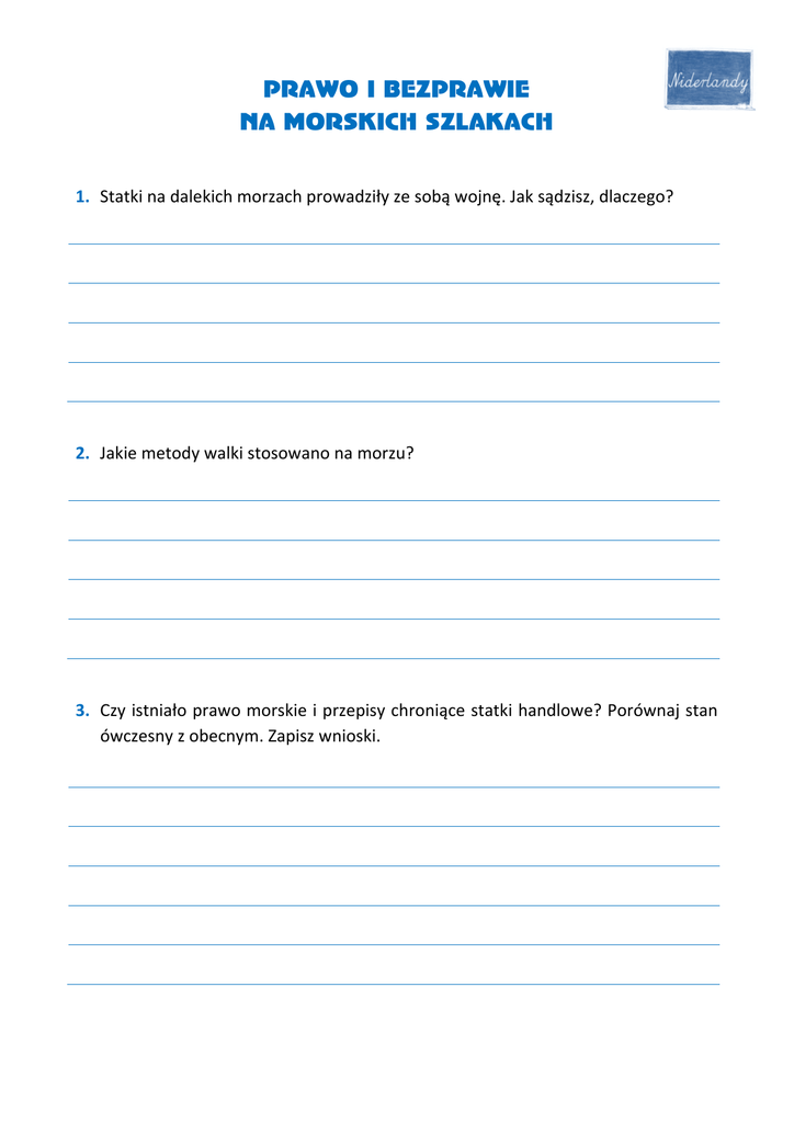 PRAWO I BEZPRAWIE NA MORSKICH SZLAKACH 1. Statki na dalekich morzach prowadziły ze sobą wojnę. Jak sądzisz, dlaczego? 2. Jakie metody walki stosowano na morzu? 3. Czy istniało prawo morskie i przepisy chroniące statki handlowe? Porównaj stan ówczesny z obecnym. Zapisz wnioski. CZY WIESZ, ŻE… Prawo morskie – to prawo wewnętrzne państwa, regulujące stosunki prawne związane z żeglugą morską i korzystaniem z morza. http://pl.wikipedia.org/wiki/Prawo_morskie Prawo morza – to dział prawa międzynarodowego, określający status prawny obszarów morskich oraz statków morskich. Prawo morza opiera się na zwyczaju międzynarodowym oraz umowach międzynarodowych, spośród których najpowszechniej stosowaną jest Konwencja Narodów Zjednoczonych o prawie morza, sporządzona w 1982 r. (tzw. Konwencja jamajska). http://pl.wikipedia.org/wiki/Prawo_morza Już w Republice Rodos w II-III wieku p.n.e. spisano prawa morskie w postaci „Praw wodnych”, które potem zostały przyjęte i dostosowane do własnych potrzeb przez Rzymian. Od tych czasów powstało wiele spisanych kodeksów, orzeczeń, ordynacji, regulaminów i praw morskich. Najstarsze średniowieczne prawa morskie pochodzą z XI wieku. Nie były to regulaminy, ale raczej opis zwyczajów, uznawanych mocą prawa zwyczajowego lub na mocy decyzji sądów morskich, czy też mocą rezolucji kupców i armatorów. Kupcy handlujący winem i solą u wybrzeży Anglii, Francji i Hiszpanii posługiwali się spisanym kodeksem morskim zwanym „Zwojami z Oleronu”. Flamandzki przekład prawa olerońskiego nazwano „Orzeczeniami z Damme”, do których w 1407 roku dołączono drugą część zwaną „Ordynacją" – obie części nazwano „Prawem wodnym” . W 1611 spisano „Prawo morskie miasta Gdańska”. Czytaj więcej – http://www.ezagle.republika.pl/t2.htm Korsarstwo – w przypadku braku okrętów, ludzi lub kapitału niezbędnych do prowadzenia wojny na morzu, do akcji wkraczały jednostki prywatne czyli korsarze. Misja korsarzy polegała na zajmowaniu wrogich statków i sprzedaży ich ładunków po najwyższej możliwej cenie. Zyski ze sprzedaży były dzielone pomiędzy udziałowców przedsięwzięcia, oficerów i załogę w proporcjach ustalonych przed rozpoczęciem wyprawy. Co ważne, aby można było zajmować wrogie statki, trzeba było mieć list kaperski, a więc potwierdzenie udzielane przez władcę, że działa się w jego imieniu. Nieszczęsny był los korsarza, który kontynuował proceder po ustaniu działań wojennych: nie mógł już powoływać się na ochronę przysługującą mu z tytułu wspomagania marynarki wojennej i jeśli został schwytany, uznawany był za pirata i jako taki – wieszany. http://www.marmucommerce.com/pl/Korsarstwo.html