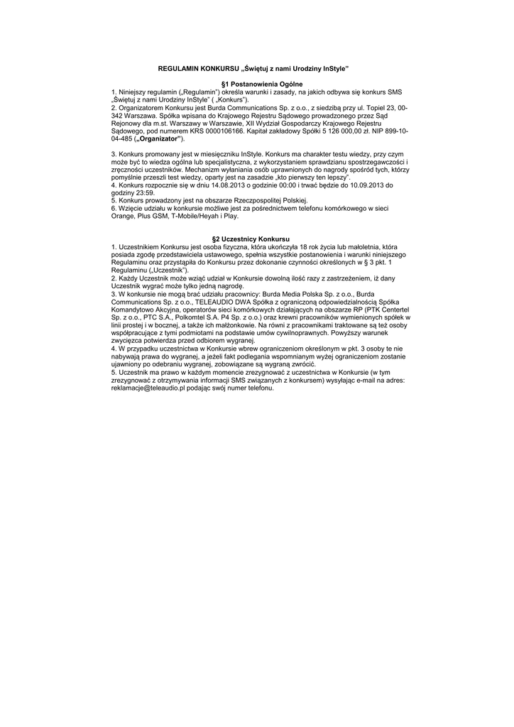 REGULAMIN KONKURSU „Świętuj z nami Urodziny InStyle” §1 Postanowienia Ogólne 1. Niniejszy regulamin („Regulamin”) określa warunki i zasady, na jakich odbywa się konkurs SMS „Świętuj z nami Urodziny InStyle” ( „Konkurs”). 2. Organizatorem Konkursu jest Burda Communications Sp. z o.o., z siedzibą przy ul. Topiel 23, 00342 Warszawa. Spółka wpisana do Krajowego Rejestru Sądowego prowadzonego przez Sąd Rejonowy dla m.st. Warszawy w Warszawie, XII Wydział Gospodarczy Krajowego Rejestru Sądowego, pod numerem KRS 0000106166. Kapitał zakładowy Spółki 5 126 000,00 zł. NIP 899-1004-485 („Organizator”). 3. Konkurs promowany jest w miesięczniku InStyle. Konkurs ma charakter testu wiedzy, przy czym może być to wiedza ogólna lub specjalistyczna, z wykorzystaniem sprawdzianu spostrzegawczości i zręczności uczestników. Mechanizm wyłaniania osób uprawnionych do nagrody spośród tych, którzy pomyślnie przeszli test wiedzy, oparty jest na zasadzie „kto pierwszy ten lepszy”. 4. Konkurs rozpocznie się w dniu 14.08.2013 o godzinie 00:00 i trwać będzie do 10.09.2013 do godziny 23:59. 5. Konkurs prowadzony jest na obszarze Rzeczpospolitej Polskiej. 6. Wzięcie udziału w konkursie możliwe jest za pośrednictwem telefonu komórkowego w sieci Orange, Plus GSM, T-Mobile/Heyah i Play. §2 Uczestnicy Konkursu 1. Uczestnikiem Konkursu jest osoba fizyczna, która ukończyła 18 rok życia lub małoletnia, która posiada zgodę przedstawiciela ustawowego, spełnia wszystkie postanowienia i warunki niniejszego Regulaminu oraz przystąpiła do Konkursu przez dokonanie czynności określonych w § 3 pkt. 1 Regulaminu („Uczestnik”). 2. Każdy Uczestnik może wziąć udział w Konkursie dowolną ilość razy z zastrzeżeniem, iż dany Uczestnik wygrać może tylko jedną nagrodę. 3. W konkursie nie mogą brać udziału pracownicy: Burda Media Polska Sp. z o.o., Burda Communications Sp. z o.o., TELEAUDIO DWA Spółka z ograniczoną odpowiedzialnością Spółka Komandytowo Akcyjna, operatorów sieci komórkowych działających na obszarze RP (PTK Centertel Sp. z o.o., PTC S.A., Polkomtel S.A. P4 Sp. z o.o.) oraz krewni pracowników wymienionych spółek w linii prostej i w bocznej, a także ich małżonkowie. Na równi z pracownikami traktowane są też osoby współpracujące z tymi podmiotami na podstawie umów cywilnoprawnych. Powyższy warunek zwycięzca potwierdza przed odbiorem wygranej. 4. W przypadku uczestnictwa w Konkursie wbrew ograniczeniom określonym w pkt. 3 osoby te nie nabywają prawa do wygranej, a jeżeli fakt podlegania wspomnianym wyżej ograniczeniom zostanie ujawniony po odebraniu wygranej, zobowiązane są wygraną zwrócić. 5. Uczestnik ma prawo w każdym momencie zrezygnować z uczestnictwa w Konkursie (w tym zrezygnować z otrzymywania informacji SMS związanych z konkursem) wysyłając e-mail na adres: [email protected] podając swój numer telefonu. §3 Przebieg Konkursu 1. Aby wziąć udział w konkursie należy w dniach od 14.08.2013 od godziny 00:00 do 10.09.2013 do godziny 15:00 wysłać SMS pod numer 72303 (koszt SMS: 2zł/2,46zł z VAT) o treści reklamowanej na łamach numeru 9/2013 miesięcznika InStyle. 2. Uczestnicy, którzy wyślą sms o treści od IS.01 do IS.25 pod numer 72303 grają o konkretną nagrodę. Rodzaj nagrody przydzielany jest według poniższego klucza: a) O 1 notebook Lenovo Z500 grają Uczestnicy konkursu, którzy wyślą sms o treści IS.01, b) o 1 tablet IdeaTab A2107 grają Uczestnicy konkursu, którzy wyślą sms o treści IS.02 , c) o 5 flakonów perfum Manifesto EDP Yves Saint Laurent grają Uczestnicy konkursu, którzy wyślą sms o treści IS.03, d) o 20 szminek Shiseido Perfect Rouge (różne kolory) grają Uczestnicy konkursu, którzy wyślą sms o treści IS.04. e) o 10 etui marki Wittchen grają Uczestnicy konkursu, którzy wyślą sms o treści IS.05. f) o 5 bransoletek Pandora grają Uczestnicy konkursu, którzy wyślą sms o treści IS.06. g) o 7 Podarunków Piękności o wartości 250 zł do wykorzystania w Kosmetycznym Instytucie Dr Irena Eris grają Uczestnicy konkursu, którzy wyślą sms o treści IS.07. h) o 13 zestawów świec Yankee Candle grają Uczestnicy konkursu, którzy wyślą sms o treści IS.08. i) o 2 zestawy Jemioł: longsleeve długi szary, t-shirt bawełniany biały, szal bawełniany (rozmiar S-L) grają Uczestnicy konkursu, którzy wyślą sms o treści IS.09.(rozmiar uczestnika) j) o 10 bransoletek Mokobelle (różne kolory) grają Uczestnicy konkursu, którzy wyślą sms o treści IS.10. k) o 2 torebki marki Batycki grają Uczestnicy konkursu, którzy wyślą sms o treści IS.11. l) o 4 zaproszenia na pobyt w hotelu Krasicki i pielęgnację Bioline grają Uczestnicy konkursu, którzy wyślą sms o treści IS.12. m) o 5 voucherów na zabiegi w Maniewski Hair&Body grają Uczestnicy konkursu, którzy wyślą sms o treści IS.13. n) o 10 produktów marki Sisley Phyto-Cernes Éclat grają Uczestnicy konkursu, którzy wyślą sms o treści IS.14. o) o 5 zestawów lakierów Orly grają Uczestnicy konkursu, którzy wyślą sms o treści IS.15. p) o 6 zegarków damskich marki Bering grają Uczestnicy konkursu, którzy wyślą sms o treści IS.16 (różne kolory). q) o torbę marki LOFT37 grają Uczestnicy konkursu, którzy wyślą sms o treści IS.17. r) o parę butów marki LOFT37 (rozmiar 35-43) grają Uczestnicy konkursu, którzy wyślą sms o treści IS.18.(rozmiar buta Uczestnika) s) o 8 zestawów kosmetyków marki Galilu (różne kolory) grają Uczestnicy konkursu, którzy wyślą sms o treści IS.19. t) o 2 aparaty Panasonic Lumix DMC-FT5 grają Uczestnicy konkursu, którzy wyślą sms o treści IS.20. u) o 10 błyszczyków Dior (różne kolory) grają Uczestnicy konkursu, którzy wyślą sms o treści IS.21. v) o 9 flakonów perfum Lolita Lempicka grają Uczestnicy konkursu, którzy wyślą sms o treści IS.22. w) o 5 zestawów kosmetyków L’Occitane grają Uczestni