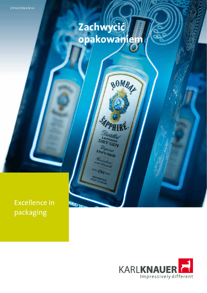 O PA K O W A N I A Zachwycić opakowaniem Excellence in packaging Opakowanie czynnikiem sukcesu Poczuj moc Innovation Engine 7.0, którą przedstawiamy w tej publikacji. Podnosimy atrakcyjność prezentacji produktów na point-of-sale (POS) i wzmacniamy markę wywierającym wrażenie opakowaniem. Opracowywane i wdrażane przez Karl Knauer innowacyjne rozwiązania w dziedzinie opakowań odnoszą nieustannie sukcesy. Zapewnimy sukces także w Twojej branży i w świecie Twojego produktu. A do tego precyzyjnie dopasujemy opakowanie do Twoich wymagań. Dzięki nieustannemu dialogowi z krajowymi i międzynarodowymi Klientami nasi eksperci opracowują rozwiązania, które spełniają wszelkie wymagania stawiane opakowaniom – poczynając od funkcji ochronnej aż po atrakcyjną prezentację w POS. Nasz dział badań i rozwoju opracowuje imponujące rozwiązania nawet dla najambitniejszych wyzwań. Prowadzimy także badania dotyczące wymagań stawianych opakowaniom przyszłości, niezależnie od tego, czy dotyczą one wygody, bezpieczeństwa produktu, zabezpieczenia przed fałszowaniem, technologii uszlachetniania, efektywności, czy smart packaging. Kładziemy przy tym duży nacisk na innowacyjność naszych rozwiązań. Ponad 30 krajowych i międzynarodowych nagród, które otrzymaliśmy w ciągu ostatnich dwóch lat, dowodzi imponująco wysokiego stopnia innowacyjności naszego przedsiębiorstwa. Pozwól, by również Twoje produkty wzorowo zapakował Karl Knauer! Innovation Engine 7.0: turbonapęd Twojego sukcesu rynkowego! Wzorowe opakowanie: sprawdź najnowsze pomysły najbardziej innowacyjnego przedsiębiorstwa roku. Przedstawiamy wyjątkowy Innovation Engine 7.0 – turbonapęd Twojego sukcesu rynkowego! Poznaj siedem wymiarów, które przybliżą Cię do jeszcze bardziej udanej przyszłości! [1] Materiał [2] Kształt [3] Funkcja [4] Uszlachetnianie [5] Proces [6] Wartości [7] Interaktywność Karton, tektura falista, tworzywo sztuczne, materiały nowej generacji: stawiamy na innowacje, zwłaszcza w odniesieniu do naszego podstawowego surowca. W zależności od potrzeb oferujemy Ci największy wybór różnorodnych materiałów przeznaczonych do stworzenia opakowań oraz opracowujemy skrojone na miarę nowe materiały o innowacyjnych funkcjach i nowych walorach wizualnych. Kształt buduje markę. Opakowanie nie zawsze musi być tradycyjnie kwadratowe. Oferujemy stworzenie opakowań w szerokiej gamie rozmaitych kształtów, które zwrócą uwagę na Twój produkt. Nasza innowacyjność imponuje w procesie opracowania i realizacji technicznej nawet najbardziej niezwykłych kształtów stanowiących integralny element Twojej marki. Najważniejsza jest wygoda. Klient nie chce komplikacji, zwłaszcza przy otwieraniu opakowania. Oferujemy dużą liczbę docenianych i nagradzanych rozwiązań dotyczących ochrony przed pierwszym otwarciem, prostego dozowania lub ponownego zamykania. Dzięki nim powstaje decydująca wartość dodana na rzecz jeszcze większego sukcesu Twojej marki. Karl Knauer może zaprezentować szerokie i imponująco innowacyjne portfolio w zakresie uszlachetniania. Opracowywane przez nas rozwiązania przemawiają do wszystkich zmysłów: wypróbuj multisensorykę w nowym wymiarze. Twój produkt stanie się wyjątkowy, przyciągnie wzrok i nieoczekiwanie poruszy zmysły. Tak właśnie wywołujemy zachwyt. Dbamy o efektywną współpracę z naszymi Klientami. Naszą filozofię lean realizujemy we wszystkich procesach wewnętrznych i zewnętrznych. Rozwiązania e-biznesowe, webcenter czy SMI optymalizują kompleksowo naszą działalność. Wiemy, jak całościowo podchodzić do pakowania. Przejawia się to w naszych kompetencjach związanych z budową maszyn do produkcji Twoich opakowań oraz w rozwiązaniach z zakresu co-packingu. Jako producent opakowań jesteśmy świadomi naszej odpowiedzialności za środowisko i społeczeństwo. Stawiamy więc na równowagę i bezpieczeństwo we wszystkich obszarach, przejawiające się w ochronie produktu i marki, bezpieczeństwie artykułów spożywczych, certyfikacji FSC i CO2. Duży udział inwestycji, a także nasze zaangażowanie w działalność Fundacji Karla Knauera zapewniają zrównoważony rozwój przedsiębiorstwa. Przyszłości przemysłu opakowań nie można już sobie wyobrazić bez nadrukowanej elektroniki. My jako pierwsi zintegrowaliśmy ją z opakowaniem. Oferujemy dostęp do najnowocześniejszych technologii multisensorycznych. Zaufaj naszemu doświadczeniu: wiemy, jak uczynić z opakowania interaktywne narzędzie marketingowe. Z A S K A KUJ E MY W K A Ż D E J B R A N ŻY SY N E R G I E W Y T WA R Z A JĄ WA RTO Ś C I D O DA N E Farmacja i zdrowie Środowisko i przyroda Produkty rolne Artykuły spożywcze Napoje Napoje premium Najwyższa jakość, bezpieczeństwo i ochrona przed fałszowaniem przy jednoczesnej znakomitej prezentacji produktu w POS – to priorytety również w branży farmaceutyczno-zdrowotnej. Konstrukcja i jakość uszlachetnienia naszych opakowań także i tu przyczyniają się w decydujący sposób do budowania wartości marki. Karl Knauer wnosi znaczący wkład w osiągnięcie sukcesu przez Twoją firmę. Możesz wybierać z naszej szerokiej oferty: proponujemy pudełka składane, blistry, displaye i tacki oraz znakomite zarządzanie procesami na rzecz szybkich, korzystnych i niezawodnych dostaw nawet w przypadku niewielkich nakładów. Nasi Klienci przywiązują coraz większą wagę do kształtu i funkcji opakowania oraz do aspektów ochrony i bezpieczeństwa. Przemysł opakowań coraz bardziej łączy się też z obszarem środowiska i przyrody, a także oferuje rozwiązania w zakresie dystrybucji i marketingu. Nasze wielokrotnie nagradzane pomysły przełożyły się na duży zakres oferowanych opakowań z nowymi formami podawania, systemami zamykania i urządzeniami ochronnymi z tektury litej lub falistej, z funkcją barierową, jaką pełni np. wyściółka wewnętrzna, oraz jeszcze 