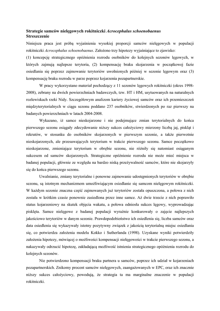Strategie samców nielęgowych rokitniczki Acrocephalus schoenobaenus Streszczenie Niniejsza praca jest próbą wyjaśnienia wysokiej proporcji samców nielęgowych w populacji rokitniczki Acrocephalus schoenobaenus. Założono trzy hipotezy wyjaśniające to zjawisko: (1) koncepcję strategicznego opóźnienia rozrodu osobników do kolejnych sezonów lęgowych, w których zajmują najlepsze terytoria, (2) kompensację braku skojarzenia w początkowej fazie osiedlania się poprzez zajmowanie terytoriów uwolnionych później w sezonie lęgowym oraz (3) kompensację braku rozrodu w parze poprzez kojarzenia pozapartnerskie. W pracy wykorzystano materiał pochodzący z 11 sezonów lęgowych rokitniczki (okres 19982008), zebrany na dwóch powierzchniach badawczych, tzw. HT i HM, usytuowanych na naturalnych rozlewiskach rzeki Nidy. Szczegółowym analizom kariery życiowej samców oraz ich przemieszczeń międzyterytorialnych w ciągu sezonu poddano 237 osobników, stwierdzonych po raz pierwszy na badanych powierzchniach w latach 2004-2008. Wykazano, iż samce nieskojarzone i nie podejmujące zmian terytorialnych do końca pierwszego sezonu osiągały zdecydowanie niższy sukces całożyciowy mierzony liczbą jaj, piskląt i rekrutów, w stosunku do osobników skojarzonych w pierwszym sezonie, a także pierwotnie nieskojarzonych, ale przesuwających terytorium w trakcie pierwszego sezonu. Samce początkowo nieskojarzone, zmieniające terytorium w obrębie sezonu, nie różniły się natomiast osiąganym sukcesem od samców skojarzonych. Strategiczne opóźnienie rozrodu nie może mieć miejsca w badanej populacji, głównie ze względu na bardzo niską przeżywalność samców, które nie skojarzyły się do końca pierwszego sezonu. Uwalnianie, zmiany terytorialne i ponowne zajmowanie udostępnionych terytoriów w obrębie sezonu, są istotnym mechanizmem umożliwiającym osiedlanie się samcom nielęgowym rokitniczki. W każdym sezonie znaczna część zajmowanych już terytoriów została opuszczona, a połowa z nich została w krótkim czasie ponownie zasiedlona przez inne samce. Aż dwie trzecie z nich poprawiło status kojarzeniowy na skutek objęcia wakatu, a połowa odniosła sukces lęgowy, wyprowadzając pisklęta. Samce nielęgowe z badanej populacji wyraźnie konkurowały o zajęcie najlepszych jakościowo terytoriów w danym sezonie. Prawdopodobieństwo ich osiedlenia się, liczba samców oraz data osiedlenia się wykazywały istotny pozytywny związek z jakością terytorialną miejsc osiedlania się, co potwierdza założenia modelu Kokko i Sutherlanda (1998). Uzyskane wyniki potwierdziły założenia hipotezy, mówiącej o możliwości kompensacji nielęgowości w trakcie pierwszego sezonu, a nakazywały odrzucić hipotezę, zakładającą możliwość istnienia strategicznego opóźnienia rozrodu do kolejnych sezonów. Nie potwierdzono kompensacji braku partnera u samców, poprzez ich udział w kojarzeniach pozapartnerskich. Znikomy procent samców nielęgowych, zaangażowanych w EPC, oraz ich znacznie niższy sukces całożyciowy, powodują, że strategia ta ma marginalne znaczenie w populacji rokitniczki. Strategie samców nielęgowych rokitniczki Acrocephalus schoenobaenus Streszczenie Niniejsza praca jest próbą wyjaśnienia wysokiej proporcji samców nielęgowych w populacji rokitniczki Acrocephalus schoenobaenus. Założono trzy hipotezy wyjaśniające to zjawisko: (1) koncepcję strategicznego opóźnienia rozrodu osobników do kolejnych sezonów lęgowych, w których zajmują najlepsze terytoria, (2) kompensację braku skojarzenia w początkowej fazie osiedlania się poprzez zajmowanie terytoriów uwolnionych później w sezonie lęgowym oraz (3) kompensację braku rozrodu w parze poprzez kojarzenia pozapartnerskie. W pracy wykorzystano materiał pochodzący z 11 sezonów lęgowych rokitniczki (okres 19982008), zebrany na dwóch powierzchniach badawczych, tzw. HT i HM, usytuowanych na naturalnych rozlewiskach rzeki Nidy. Szczegółowym analizom kariery życiowej samców oraz ich przemieszczeń międzyterytorialnych w ciągu sezonu poddano 237 osobników, stwierdzonych po raz pierwszy na badanych powierzchniach w latach 2004-2008. Wykazano, iż samce nieskojarzone i nie podejmujące zmian terytorialnych do końca pierwszego sezonu osiągały zdecydowanie niższy sukces całożyciowy mierzony liczbą jaj, piskląt i rekrutów, w stosunku do osobników skojarzonych w pierwszym sezonie, a także pierwotnie nieskojarzonych, ale przesuwających terytorium w trakcie pierwszego sezonu. Samce początkowo nieskojarzone, zmieniające terytorium w obrębie sezonu, nie różniły się natomiast osiąganym sukcesem od samców skojarzonych. Strategiczne opóźnienie rozrodu nie może mieć miejsca w badanej populacji, głównie ze względu na bardzo niską przeżywalność samców, które nie skojarzyły się do końca pierwszego sezonu. Uwalnianie, zmiany terytorialne i ponowne zajmowanie udostępnionych terytoriów w obrębie sezonu, są istotnym mechanizmem umożliwiającym osiedlanie się samcom nielęgowym rokitniczki. W każdym sezonie znaczna część zajmowanych już terytoriów została opuszczona, a połowa z nich została w krótkim czasie ponownie zasiedlona przez inne samce. Aż dwie trzecie z nich poprawiło status kojarzeniowy na skutek objęcia wakatu, a połowa odniosła sukces lęgowy, wyprowadzając pisklęta. Samce nielęgowe z badanej populacji wyraźnie konkurowały o zajęcie najlepszych jakościowo terytoriów w danym sezonie. Prawdopodobieństwo ich osiedlenia się, liczba samców oraz data osiedlenia się wykazywały istotny pozytywny związek z jakością terytorialną miejsc osiedlania się, co potwierdza założenia modelu Kokko i Sutherlanda (1998). Uzyskane wyniki potwierdziły założenia hipotezy, mówiącej o możliwości kompensacji nielęgowości w trakcie pierwszego sezonu, a nakazywały odrzucić hipotezę, zakładającą możliwość istnienia