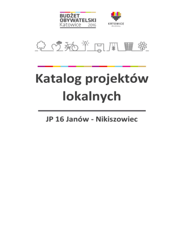 Katalog projektów lokalnych JP 16 Janów - Nikiszowiec Numer ID za pomocą którego będziesz głosować: L/3/16/2015 Plac zabaw i usypanie górki na sanki LOKALIZACJA ZADANIA ul. Zamkowa, za blokiem nr 30 KWOTA ZADANIA 400 000,00 zł SKRÓCONY OPIS ZADANIA Plac zabaw o dużej powierzchni wraz z górką na sporty zimowe (sanki, inne). WNIOSKODAWCA Ryszard Bereska KONTAKT 502 749 879 Numer ID za pomocą którego będziesz głosować: L/4/16/2015 Modernizacja placu zabaw wraz z ogrodzeniem przy ul. Szopienickiej 21, 23, 25 LOKALIZACJA ZADANIA ul. Szopienicka 21, 23, 25 KWOTA ZADANIA 410 000,00 zł SKRÓCONY OPIS ZADANIA Rewitalizacja starego placu zabaw, wprowadzenie nowych urządzeń dla dzieci młodszych oraz uatrakcyjnienie go dla starszych. Zapewnienie większego bezpieczeństwa dzięki zmianom. WNIOSKODAWCA Magdalena Freiherr KONTAKT [email protected] Numer ID za pomocą którego będziesz głosować: L/5/16/2015 "W zdrowym ciele zdrowy duch" LOKALIZACJA ZADANIA ul. Leśnego Potoku, obok bloku 32a KWOTA ZADANIA 72 000,00 zł SKRÓCONY OPIS ZADANIA Zadbajmy o nasze zdrowie - darmowa siłownia na wyciągnięcie ręki - wystarczy zagłosować! WNIOSKODAWCA Urszula Rybarczyk KONTAKT 600 274 571 [email protected] Numer ID za pomocą którego będziesz głosować: L/6/16/2015 Zakup audiobooków i nowości książkowych dla Filii nr 21 Miejskiej Biblioteki Publicznej w Katowicach przy ulicy Zamkowej 45 LOKALIZACJA ZADANIA Miejska Biblioteka Publiczna, Filia nr 21, ul. Zamkowa 45 KWOTA ZADANIA 20 000,00 zł SKRÓCONY OPIS ZADANIA Zakup audiobooków i nowości książkowych dla Filii nr 21 Miejskiej Biblioteki Publicznej w Katowicach przy ulicy Zamkowej 45. Biblioteka rozszerzy i uatrakcyjni swoją ofertę. WNIOSKODAWCA Marek Trala KONTAKT [email protected] L/8/16/2015 Numer ID za pomocą którego będziesz głosować: Modernizacja boiska Szkoły Podstawowej nr 53 w Katowicach przy Placu Wyzwolenia 18 LOKALIZACJA ZADANIA Plac Wyzwolenia 18 KWOTA ZADANIA 480 000,00 zł SKRÓCONY OPIS ZADANIA Modernizacja boiska szkolnego: 1. Wykonanie wewnętrznej drogi przeciwpożarowej przy budynku szkolnym 2. Wykonanie 1 dodatkowego wjazdu na teren boiska szkolnego 3. Wyznaczenie miejsc parkingowych dla samochodów osobowych 4. Wykonanie bieżni dwutorowej tartanowej o dł. 60 m 5. Wykonanie skoczni w dal 6. Remont ogrodzenia. WNIOSKODAWCA Krystyna Kokoszka KONTAKT Irena Cichoń – Dyrektor Szkoły Podstawowej nr 53 szkola53katowice @poczta.onet.pl 798 751 071 32 255 71 47 Numer ID za pomocą którego będziesz głosować: L/9/16/2015 Budowa ścieżki do jazdy na rolkach w Ośrodku Wypoczynkowym "BOLINA" LOKALIZACJA ZADANIA koniec ul. Leśnego Potoku, Ośrodek "BOLINA" KWOTA ZADANIA 165 000,00 zł SKRÓCONY OPIS ZADANIA Wyodrębnienie i przekształcenie jednej ze ścieżek spacerowych w Ośrodku "BOLINA" do jazdy na rolkach. WNIOSKODAWCA Agata Kokot KONTAKT [email protected] Numer ID za pomocą którego będziesz głosować: L/13/16/2015 "Drzewka Różane na Nikiszowieckim Rynku" LOKALIZACJA ZADANIA Plac Wyzwolenia KWOTA ZADANIA 100 000,00 zł SKRÓCONY OPIS ZADANIA Celem tego zadania jest postawienie na Nikiszowieckim Rynku donic z drzewami różanymi oraz ławek. Dzięki temu rynek ożyje nabierze nowych walorów. Drzewa różane będą nawiązywać do róż na budynku poczty. Jednocześnie ustawienie donic ograniczy ruch kołowy i skanalizuje go dzięki czemu będzie można na nim spokojnie odpoczywać czy też utworzyć ogródki letnie. Donice i ławki nie będą na stałe przymocowane do podłoża dzięki czemu zależnie od potrzeb będzie można je przestawiać. WNIOSKODAWCA Tomasz Stęclik KONTAKT [email protected] 515 735 668