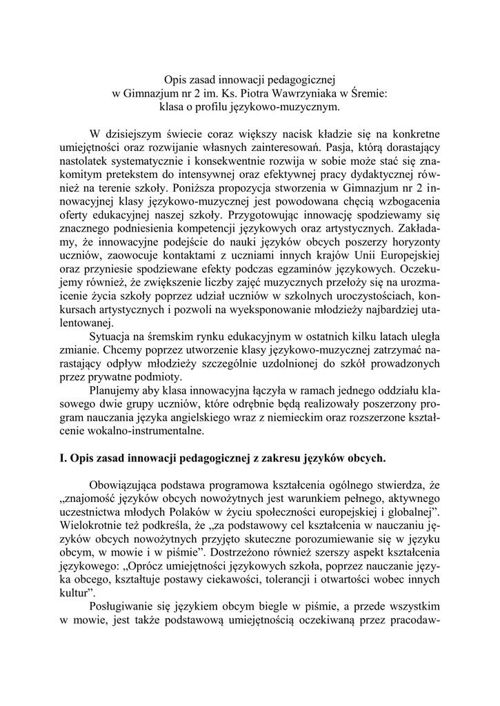 Opis zasad innowacji pedagogicznej w Gimnazjum nr 2 im. Ks. Piotra Wawrzyniaka w Śremie: klasa o profilu językowo-muzycznym. W dzisiejszym świecie coraz większy nacisk kładzie się na konkretne umiejętności oraz rozwijanie własnych zainteresowań. Pasja, którą dorastający nastolatek systematycznie i konsekwentnie rozwija w sobie może stać się znakomitym pretekstem do intensywnej oraz efektywnej pracy dydaktycznej również na terenie szkoły. Poniższa propozycja stworzenia w Gimnazjum nr 2 innowacyjnej klasy językowo-muzycznej jest powodowana chęcią wzbogacenia oferty edukacyjnej naszej szkoły. Przygotowując innowację spodziewamy się znacznego podniesienia kompetencji językowych oraz artystycznych. Zakładamy, że innowacyjne podejście do nauki języków obcych poszerzy horyzonty uczniów, zaowocuje kontaktami z uczniami innych krajów Unii Europejskiej oraz przyniesie spodziewane efekty podczas egzaminów językowych. Oczekujemy również, że zwiększenie liczby zajęć muzycznych przełoży się na urozmaicenie życia szkoły poprzez udział uczniów w szkolnych uroczystościach, konkursach artystycznych i pozwoli na wyeksponowanie młodzieży najbardziej utalentowanej. Sytuacja na śremskim rynku edukacyjnym w ostatnich kilku latach uległa zmianie. Chcemy poprzez utworzenie klasy językowo-muzycznej zatrzymać narastający odpływ młodzieży szczególnie uzdolnionej do szkół prowadzonych przez prywatne podmioty. Planujemy aby klasa innowacyjna łączyła w ramach jednego oddziału klasowego dwie grupy uczniów, które odrębnie będą realizowały poszerzony program nauczania języka angielskiego wraz z niemieckim oraz rozszerzone kształcenie wokalno-instrumentalne. I. Opis zasad innowacji pedagogicznej z zakresu języków obcych. Obowiązująca podstawa programowa kształcenia ogólnego stwierdza, że „znajomość języków obcych nowożytnych jest warunkiem pełnego, aktywnego uczestnictwa młodych Polaków w życiu społeczności europejskiej i globalnej”. Wielokrotnie też podkreśla, że „za podstawowy cel kształcenia w nauczaniu języków obcych nowożytnych przyjęto skuteczne porozumiewanie się w języku obcym, w mowie i w piśmie”. Dostrzeżono również szerszy aspekt kształcenia językowego: „Oprócz umiejętności językowych szkoła, poprzez nauczanie języka obcego, kształtuje postawy ciekawości, tolerancji i otwartości wobec innych kultur”. Posługiwanie się językiem obcym biegle w piśmie, a przede wszystkim w mowie, jest także podstawową umiejętnością oczekiwaną przez pracodaw- ców. Niemal każdy uczeń jest świadomy, iż w otaczającym świecie posługiwać się będzie językiem obcym niemalże w każdej pracy i w każdym zawodzie. W grupie realizującej innowację z zakresu języków obcych planowane jest wprowadzenie 2 godzin dodatkowych tygodniowo języka angielskiego (poziom III.1) i 1 godziny dodatkowej języka niemieckiego (poziom III.0) w każdym roku trzyletniego cyklu kształcenia. Głównym założeniem innowacji jest rozwijanie umiejętności komunikacyjnych ze szczególnym naciskiem na kształtowanie sprawności mówienia w języku obcym. W ramach dodatkowych godzin objętych innowacją przewidziana jest głównie realizacja materiału pozapodręcznikowego, inspirującego konwersację i poszerzającego wiedzę uczniów o elementy kulturoznawcze (wiedza o krajach anglo- i niemieckojęzycznych). Na całym etapie kształcenia nauczania zintegrowanego uczniowie przygotowywani są do egzaminu gimnazjalnego w oparciu o cele i treści kształcenia określone w podstawie programowej. Innowacyjność grupy językowej będzie polegała na sposobie nauczania, na doborze odpowiednich metod i form pracy podczas zajęć, a przede wszystkim na stosowaniu dodatkowych materiałów dydaktycznych. Poza obowiązkowym zestawem podręczników, podczas zajęć wykorzystywane będą dodatkowe materiały dydaktyczne. Mowa tu o nagraniach programów dokumentalnych, autentycznych tekstach użytkowych tj. gazetach, broszurach, stronach internetowych itd. Na zajęciach uczniowie będą poznawać i wykonywać zadania znacznie wykraczające poza ramę podstawy programowej. Nowatorstwo grupy z innowacją pedagogiczną w zakresie języka angielskiego i niemieckiego będzie polegało również na organizacji różnorodnych zajęć pozalekcyjnych, takich jak wyjazdy na uczelnie wyższe czy uczestniczenie w programach międzynarodowych w celu nawiązania kontaktu z uczniami w innych krajach europejskich. W celu uatrakcyjnienia zajęć wykorzystywane będą płyty audio, video, projektor oraz sala komputerowa z dostępem do Internetu. 2