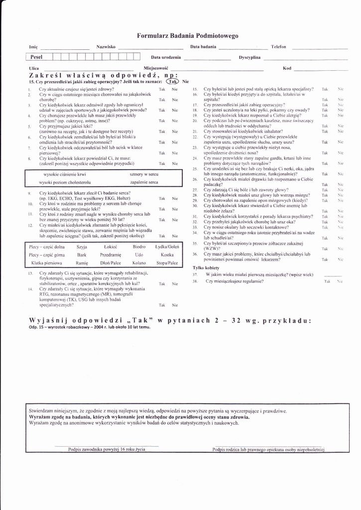 t. Formularz Badania Podmiotowego Nazwisko Data badania Telefon Dyscyplina Data urodzenia Zakreśl właściwąodpowiedź, n-p< (.Tą9 15.Czyprzeszedleś/aśjakiśzabiegoperacyjny?Jeślitaktozaznaczi l. z. Czy aktualnie cnjesz się/jesteśzdrowy? Czy s'ciągu ostatniego miesiąca chorowałeś rrajakąkołwiek r- Czy kiedykolwiek lekarz odmówił zgody lub ograniczył udział u'zajęciach sportowych zjakiegokolwiek powodu? Czy chorujesz przewlekle lub masz jakiś przewlekĘ problem? (np. cukrzycę, astrnę, inne)? Czy przyjmujeszjakieś lcki? (zarówno na receptę,jak i te dostępne bez recepty) Czy kiedykolwiek zemdlałeś/aślub byłeśiaśbliski/a ł. s. e. l' s. chorobę? przy'tomność? orndlenia lub straciłeśiaś Czy kiedykolwiek odczuwałeś/aśból lub ucisk w klatce piersiowej? Czy kiedykolwiek lekarz powiedział Ci, że masz: (zakreś1 poniżej wszystkie odpowiednie przypadki) wysokie ciśnieniekmi ll t2 czgśćdolna Plecy _ czgśćgóma Klatka i3 l4 piersiowa Srlu Bark Ramię Łokieć Przedramię DłouPalce Biodro Udo Kolmo Czy zóamły Ci się sy.tuacje, k1óle wymagaĘ rehabilitacji' fizykoterapii' uszbmienia' gipsu czy korąlstania ze stabiłizatorów, ortez aparatów korekcyjnych lub kui? ' Czy zdarzały Ci się sytuacje. które wymagaĘ wykonmia RTG, rezonansu magnefycznego (MR), tomografii komputerowej (TK)' USG lub innych badań specjalistycm-vch? 15 Tak Nie - wYrostek robackowy _ 2fi}4 r. lub około 10 lat temu. n_ie 15. ló. Czy byłeś/aś łub jesteś pod stałą opieką lekaza specjalist'v-? Czy byłeś/aśkiedyś prz-ljętyla do szpitala. leżałeśiaś w Czy przeszedłeślaśjakiś zabieg operacyjny? CZyjesteś uczulony/a na łeki pyłki, pokarmy czy owady? Czy kiedykolwiek lekmz rozpoznał u Ciebie alergię? Czy podczas lub po ćwiczcniach kasz]esz. nrasz świszczący oddcch lub tnrdności w oddychaniu? szpitalu? Tak Nie I7. 18. Tak Nie Żo. Tak Nie Tak 2\. Czy stosorłałeslaśkivlykolwiek inhalator? 22. Cł w}stępują (występowaĘ) u Ciebie przewlekłe Nie Tak Nie Tak Nię 19. Ż3. Ż1. 25' 26' 27- Tak Nię Tak Nię Tak Nie 'Iak Łydka'/Goleń Kostka Stopa.IPalce 28. 29. 30. ' 32. ll. 34' 3l zapalenia uszu. upośledzenie sfuchu' urazy uszu? Czy występuje u ciebie przewlekĘ nież1t nosa' upośledzenie droźności Czy masz przen'lekłe stany zapalne gardła, krtani lub inne problemy dotyczące tych Czy urodziłeślaśsię bez lub czy brakuje Ci nerki' oka,jądra łub innego narządu (ana1omicmie' Czykicdykolwiek miałeśdrgawki lub rozpoznano u Ciebie nosa? narądów? finkcjonalnie)? padaczkę? Czy Czy Czy Czy zdarująCi się bóle i/lub zawroty głciłyl kiedykolwiek miałeśuraz głowy lub wstrząs mózgu? chorowałeśna zapalenie opon mózgowych (kiedy)? kiedykol*'iek lekarz stwierdził u Ciebie anemię lub niedobór żelaza? Czy Czy Czy Czy kiedykolwiek korzystałcś z porady łekarza psychiaĘ? przebyłeśjakąkolwiek chorobę lub uraz oka / nosisz okulary lub soczewki kontaktowc? 35. w ciągu ostatniego roku istotnie przybrałeślaśna łęadze lub schudłeś/aś? Czy byłeVas szczepionyla przeciw żókaczce zakaźmej 36. Czy nraszjakieś problemy, którc chciałbyś/chciałabyś lub (WZW)? powinienes powinnaś omówić lekarzem? Cz-vmiesiączkujeszregulamie? Nie w pytaniach 2 - 32 wg.przykladu: Stwierdzam niniejszyrą Ze zgodnie z moją najlepsząwiedzą, odpowiedzi naparyŻgze pytania są wyczerpujące i prawdziwe Wyrażam zgodę na badanią lrtórych wykonanie jest nieztlędne do prawidłowej oceny stanu zdrowia. Wyrażam zgodę na anonimowe wykorzystanie wyników badań do cęlów statystycznych i naukowych. is zawodni]<a oowvżei l6 roku żvcia Tak Nie l'ak Nre Tak \rc Tak Tak Nic \le Tak Tak Nie Tak Nic Tak Nie Tak Nie Tak Nil Tak fak Tak Tak Nie Nic Nie \ir \i. Tak Tak Tak Tak \ię \ic Tak \ie rak \i; Tak Nir fa& \:e Ntł \:e Tytko kobieĘ 3'l' w jakim wieku miałaśpierwszą miesiączkę? (wpisz v'iek) ]8' Tak Tak Wyj aśnij odpowiedzi,,Tak'' odp. Nie zapalenie serca Czy kiedykolwiek lekarz Żecił Ci badanie serca? (np. EKc, ECHO' Test wysiłkowy EKG' Holtcr) Czy ktośw rodzinie ma problemy z sercem lub choruje przcwlekle, stale przyjmuje leki? Czy ktośz rodziny mrarł nagle w wyniku choroby serca lub bezznanej przyczyny w wieku poniżej 50 lat? Czy miałeś/aś kiedykolwiek złamanie lub pęknięcie kości, skręcenie' zwichnięcie stawu, zerwanie mięśnialub więzadła lub apalerrie ścięgna? (ieślitaĘ zakreśl poniżej okolicę) Plecy Tak sanery w sercu wysoki pożom cholesterolu i0. Kod Miejscowość Ulica