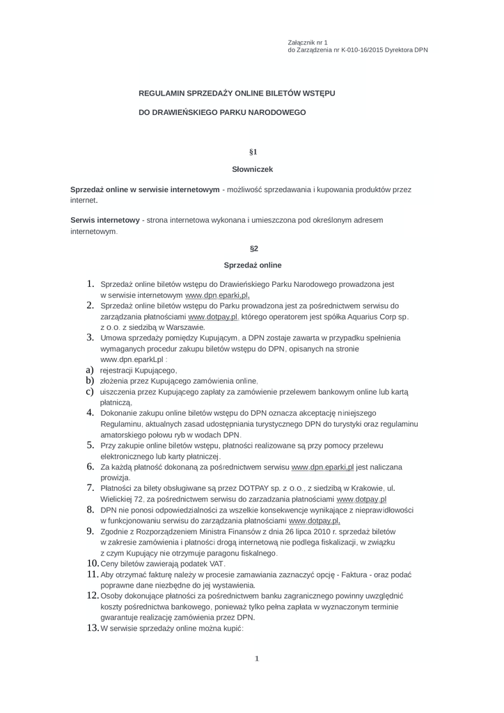 Załącznik nr 1 do Zarządzenia nr K-010-16/2015 Dyrektora DPN REGULAMIN SPRZEDAŻY ONLlNE BILETÓW WSTĘPU DO DRAWIEŃSKIEGO PARKU NARODOWEGO §1 Słowniczek Sprzedaż online w serwisie internetowym - możliwość sprzedawania i kupowania produktów przez internet. Serwis internetowy - strona internetowa wykonana i umieszczona pod określonym adresem internetowym. §2 Sprzedaż online 1. Sprzedaż online biletów wstępu do Drawieńskiego Parku Narodowego prowadzona jest w serwisie internetowym www.dpn.eparki.pl. 2. Sprzedaż online biletów wstępu do Parku prowadzona jest za pośrednictwem serwisu do zarządzania płatnościami www.dotpay.pl. którego operatorem jest spółka Aquarius Corp sp. z 0.0. z siedzibą w Warszawie. 3. Umowa sprzedaży pomiędzy Kupującym, a DPN zostaje zawarta w przypadku spełnienia wymaganych procedur zakupu biletów wstępu do DPN, opisanych na stronie www.dpn.eparkLpl : a) rejestracji Kupującego, b) złożenia przez Kupującego zamówienia online, c) uiszczenia przez Kupującego zapłaty za zamówienie przelewem bankowym online lub kartą płatniczą, 4. Dokonanie zakupu online biletów wstępu do DPN oznacza akceptację niniejszego Regulaminu, aktualnych zasad udostępniania turystycznego DPN do turystyki oraz regulaminu amatorskiego połowu ryb w wodach DPN. 5. Przy zakupie online biletów wstępu, płatności realizowane są przy pomocy przelewu elektronicznego lub karty płatniczej. 6. Za każdą płatność dokonaną za pośrednictwem serwisu www.dpn.eparki.pl jest naliczana prowizja. 7. Płatności za bilety obsługiwane są przez DOTPAY sp. z 0.0., z siedzibą w Krakowie, ul. Wielickiej 72, za pośrednictwem serwisu do zarzadzania płatnościami www.dotpay.pl 8. DPN nie ponosi odpowiedzialności za wszelkie konsekwencje wynikające z niepraw idłowości w funkcjonowaniu serwisu do zarządzania płatnościami www.dotpay.pl. 9. Zgodnie z Rozporządzeniem Ministra Finansów z dnia 26 lipca 2010 r. sprzedaż biletów w zakresie zamówienia i płatności drogą internetową nie podlega fiskalizacji, w związku z czym Kupujący nie otrzymuje paragonu fiskalnego. 10. Ceny biletów zawierają podatek VAT. 11. Aby otrzymać fakturę należy w procesie zamawiania zaznaczyć opcję - Faktura - oraz podać poprawne dane niezbędne do jej wystawienia. 12. Osoby dokonujące płatności za pośrednictwem banku zagranicznego powinny uwzględnić koszty pośrednictwa bankowego, ponieważ tylko pełna zapłata w wyznaczonym terminie gwarantuje realizację zamówienia przez DPN. 13. W serwisie sprzedaży online można kupić: 1 Załącznik nr 1 do Zarządzenia nr K-OIO-16j2015 Dyrektora DPN 1) indywidualne bilety wstępu (normalne i ulgowe), które są imienne (podczas kontroli należy okazać bilet wstępu, dokument tożsamości oraz w przypadku osób korzystających z ulgi dokument urzędowy potwierdzający możliwość jej zastosowania) . 2) zbiorowe bilety wstępu (jeden bilet może dotyczyć max 20 osób); bilet zbiorowy jest biletem imiennym zawierającym imiona i nazwiska osób upoważnionych (podczas kontroli osoby upoważnione, których nazwiska znajdują się na bilecie, zobowiązane są okazać bilet wstępu, dokument tożsamości oraz w przypadku osób korzystających z ulgi dokument urzędowy potwierdzający możliwość jej zastosowania). 3) indywidualne bilety wstępu, zwane licencją wędkarską (podczas kontroli należy okazać bilet wstępu, kartę wędkarza oraz rejestr połowów). 14. Bilety imienne (wyjątek stanowi licencja wędkarska) bez dowodu tożsamości oraz dokumentu urzędowego potwierdzającego możliwość zastosowania ulgi - są nieważne. 15. DPN zastrzega sobie możliwość zakończenia sprzedaży online w każdej chwili, bez podawania przyczyn. 16. DPN nie ponosi odpowiedzialności za skutki podania nieprawdziwych lub błędnych danych w formularzu zamówienia. §3 Reklamacje, zwrot i wymiana biletów 1. 2. 3. 4. 5. 6. W uzasadnionym przypadku, DPN przyjmować będzie zwroty biletów oraz dokonywać zwrotu wpłaconej kwoty. Zwrot biletu może być dokonany wyłącznie w formie elektronicznej poprzez wybranie funkcji "Zgłoś problem" znajdującej się w serwisie www.dpn.eparki .pl i złożenie reklamacji. W przypadku rozpatrzenia reklamacji na korzyść Kupującego, DPN dokonuje zwrotu wpłaconej kwoty, z zastrzeżeniem ust.3 §3 niniejszego Regulaminu. W przypadku zwrotu biletu, Kupującemu przysługuje zwrot wpłaconej kwoty pomniejszonej do: 1) 40% w przypadku zwrotu biletu na czas minimum 40 dni przed dniem , w którym bilet miał być wykorzystany, 2) 60% w przypadku zwrotu biletu na czas od 21 do 39 dni przed dniem , w którym bilet miał być wykorzystany, 3) 80% w przypadku zwrotu biletu na czas poniżej 21 dni przed dniem, w którym bilet miał być wykorzystany. Bilety niewykorzystane, które utraciły ważność nie podlegają zwrotowi ani zmianie terminu. Nie ma możliwości zmiany terminu obowiązywania biletów wstępu . Wszelkie reklamacje dotyczące zakupionych biletów wymagają zgłoszen ia w ciągu dwóch dni roboczych od momentu zakupu biletów, poprzez wybranie funkcji "Zgłoś problem" znajdującej się na stronie www.dpn.eparki .pl i złożenie reklamacji. Reklamacje będą rozpatrywane niezwłocznie, nie później jednak niż w ciągu 14 dni roboczych od dnia wpłynięcia reklamacji. §4 Ochrona danych Kupującego 1. 2. Poprzez rejestrację w serwisie sprzedaży online, Kupujący wyraża zgodę na przechowywanie i przetwarzanie przez operatora danych osobowych Kupującego w celu realizacji zamówien ia, niezbędnego kontaktu z Kupującym oraz w celu wszelkich działań niezbędnych do funkcjonowania serwisie sprzedaży biletów. Wszelkie dane osobowe otrzymywane przez operatora w ramach sprzedaży biletów wstępu do DPN mogą być wykorzystywane wyłącznie w celach przekazywania informacji o 2 Załącznik nr 1 do Zarządzenia nr K-010-16j2015 Dyrektora DPN 3. 4. imprezach i promocjach oferowanych przez