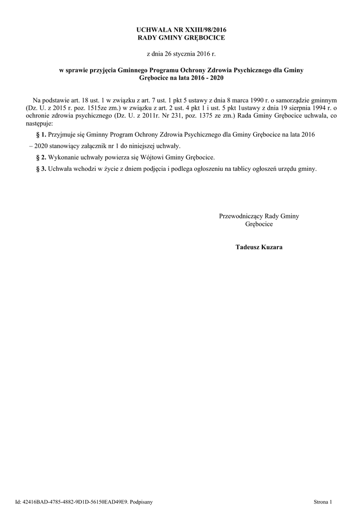 UCHWAŁA NR XXIII/98/2016 RADY GMINY GRĘBOCICE z dnia 26 stycznia 2016 r. w sprawie przyjęcia Gminnego Programu Ochrony Zdrowia Psychicznego dla Gminy Grębocice na lata 2016 - 2020 Na podstawie art. 18 ust. 1 w związku z art. 7 ust. 1 pkt 5 ustawy z dnia 8 marca 1990 r. o samorządzie gminnym (Dz. U. z 2015 r. poz. 1515ze zm.) w związku z art. 2 ust. 4 pkt 1 i ust. 5 pkt 1ustawy z dnia 19 sierpnia 1994 r. o ochronie zdrowia psychicznego (Dz. U. z 2011r. Nr 231, poz. 1375 ze zm.) Rada Gminy Grębocice uchwala, co następuje: § 1. Przyjmuje się Gminny Program Ochrony Zdrowia Psychicznego dla Gminy Grębocice na lata 2016 – 2020 stanowiący załącznik nr 1 do niniejszej uchwały. § 2. Wykonanie uchwały powierza się Wójtowi Gminy Grębocice. § 3. Uchwała wchodzi w życie z dniem podjęcia i podlega ogłoszeniu na tablicy ogłoszeń urzędu gminy. Przewodniczący Rady Gminy Grębocice Tadeusz Kuzara Id: 42416BAD-4785-4882-9D1D-56150EAD49E9. Podpisany Strona 1 Załącznik do Uchwały Nr XXIII/98/2016 Rady Gminy Grębocice z dnia 26 stycznia 2016 r. GMINNY PROGRAMOCHRONY ZDROWIA PSYCHICZNEGO DLA GMINY GRĘBOCICENA LATA 2016 - 2020 Ośrodki i Szpitale psychiatryczne i odwykowe Szpitale psychiatryczne i odwykowe Ośrodki i Szpitale psychiatryczne i odwykowe Szpitale psychiatryczne i odwykowe Ośrodki i Szpitale psychiatryczne i odwykowe Szpitale psychiatryczne i odwykowe Ośrodki i Szpitale psychiatryczne i odwykowe Szpitale psychiatryczne i odwykowe I. WPROWADZENIE W/g definicji Światowej Organizacji Zdrowia (WHO) zdrowiem określa się „stan pełnego, dobrego samopoczucia fizycznego, psychicznego i społecznego, a nie tylko brak choroby lub zniedołężnienia". W odniesieniu do przytaczanej definicji, zdrowiem psychicznym jest nie tylko brak zaburzeń psychicznych, ale również taki stan, w którym osoba jest świadoma swojego potencjału, może radzić sobie z problemami, stresem, efektywnie pracować i funkcjonować w społeczeństwie. W związku z powyższym zdrowie psychiczne jest ważnym elementem zdrowia publicznego. WHO, Unia Europejska oraz organy administracji publicznej Polski opracowały szereg dokumentów określających modele opieki psychiatrycznej. Podstawowym aktem prawnym w tym zakresie jest ustawa o ochronie zdrowia psychicznego określająca, że ochronę zdrowia psychicznego zapewniają organy administracji rządowej i samorządowej oraz instytucje do tego powołane. W działaniach z zakresu ochrony zdrowia psychicznego mogą uczestniczyć stowarzyszenia i inne organizacje społeczne, grupy samopomocy pacjentów i ich rodzin, a także inne osoby fizyczne i prawne. Ochrona zdrowia w szczególności na: psychicznego w aspekcie ustawy o ochronie zdrowia polega 1. promocji zdrowia psychicznego; 2. zapobieganiu zaburzeniom psychicznym; 3. zapewnieniu osobom z zaburzeniami psychicznymi wsparcia i pomocy umożliwiającej prawidłowe funkcjonowanie w środowisku zamieszkania; 4. kształtowaniu wobec osób z zaburzeniami psychicznymi właściwych postaw społecznych a zwłaszcza zrozumienia, tolerancji, życzliwości oraz przeciwdziałaniu ich dyskryminacji. Opieka zdrowotna nad osobami z zaburzeniami w Gminie Grębocice jest realizowana w ramach podstawowej opieki medycznej w formie doraźnej, ambulatoryjnej, finansowanej ze środków Narodowego Funduszu Zdrowia na świadczenia zdrowotne. Z budżetu Gminy Grębocice finansowane są zadania z zakresu pomocy społecznej, które nakreśla ustawa o pomocy społecznej oraz zadania wynikające z realizacji Gminnego Programu Profilaktyki i Rozwiązywania Problemów Uzależnień, które określa ustawa o wychowaniu w trzeźwości i przeciwdziałaniu alkoholizmowi. Id: 42416BAD-4785-4882-9D1D-56150EAD49E9. Podpisany Strona 1 Do zadań własnych gminy należy opracowanie i realizacja gminnej strategii rozwiązywania problemów społecznych, ze szczególnym uwzględnieniem programów pomocy społecznej, profilaktyki i rozwiązywania problemów alkoholowych, których celem jest integracja osób i rodzin z grup szczególnego ryzyka, w tym osób z zaburzeniami psychicznymi. II. LOKALNA DIAGNOZA ZJAWISKA ZABURZENIA PSYCHICZNEGO Zgodnie z zapisem art.3 z zaburzeniami psychicznymi to osoby: ustawy o ochronie zdrowia psychicznego osoby - chore psychicznie ( wykazujące zaburzenia psychotyczne); - upośledzone umysłowo; - wykazujące inne zakłócenia czynności psychicznych, które zgodnie ze stanem wiedzy medycznej zaliczone są do zaburzeń psychicznych a osoby te wymagają świadczeń zdrowotnych, lub innych form pomocy i opieki niezbędnych do życia w środowisku rodzinnym lub społecznym. Według danych przychodni lekarskiej „LANCET” w Grębocicach w oparciu o kryteria definicji zaburzeń psychicznych sformułowanej w ustawie o ochronie zdrowia psychicznego oraz liczby zaoptowanych pacjentów, rozpoznano: 23 osoby z zaburzeniami psychicznymi, w tym 3 dzieci do 18 r. ż. Według danych Gminnego Ośrodka Pomocy Społecznej w Grębocicach w oparciu o kryteria definicji zaburzeń psychicznych sformułowanej w ustawie o ochronie zdrowia psychicznego ze świadczeń pomocy społecznej skorzystało: - w 2013 r. 13 osób z zaburzeniami psychicznymi, w tym 5 dzieci do 18 r. ż. - w 2014 r. 14 osób z zaburzeniami psychicznymi, w tym 6 dzieci do 18 r. ż. - w 2015 r. 12 osób z zaburzeniami psychicznymi, w tym 4 dzieci do 18 r. ż. Specjalistyczne usługi opiekuńcze na rzecz osób z zaburzeniami psychicznymi: - 2013 r. - 5 osób, w tym 4 dzieci do 18 r. ż. i 1 osoba do 19 r. ż. - 2014 r. - 6 osób, w tym 5 dzieci do 18 r. ż. i 1 osoba do 20 r. ż. - 2015 r. - 3 dzieci do 18 r. ż. Rodzaje udzielonego w szczególności: poradnictwa specjalistycznego dla rodzin obejmującego - poradnictwo prawne - poradnictwo psychologiczne III. DZIAŁANIA ZAPOBIEGAWCZE GMINY W ZAKRESIE OCHRONY ZDROWIA PSYCHICZNEGO 1. Zwiększenie pomocy i oparcia bytowego dla osób z zaburzeniami psychicznymi poprzez udzielenie samopomocy środowiskowej, pomocy