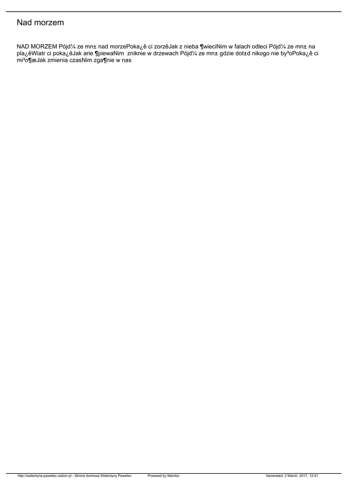 Nad morzem NAD MORZEM Pójd¼ ze mn± nad morzePoka¿ê ci zorzêJak z nieba ¶wieciNim w falach odleci Pójd¼ ze mn± na pla¿êWiatr ci poka¿êJak arie ¶piewaNim zniknie w drzewach Pójd¼ ze mn± gdzie dot±d nikogo nie by³oPoka¿ê ci mi³o¶æJak zmienia czasNim zga¶nie w nas http://walentyna-pawelec.radom.pl - Strona domowa Walentyny Pawelec Powered by Mambo Generated: 2 March, 2017, 12:41
