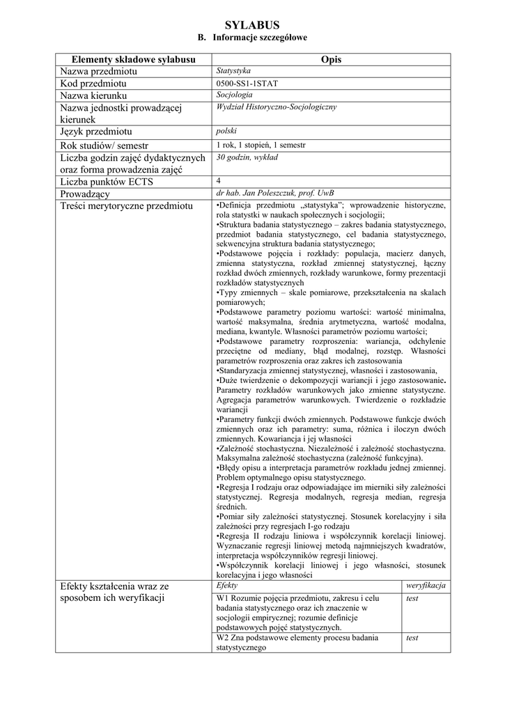 SYLABUS B. Informacje szczegółowe Elementy składowe sylabusu Nazwa przedmiotu Kod przedmiotu Nazwa kierunku Nazwa jednostki prowadzącej kierunek Język przedmiotu Rok studiów/ semestr Liczba godzin zajęć dydaktycznych oraz forma prowadzenia zajęć Liczba punktów ECTS Prowadzący Treści merytoryczne przedmiotu Efekty kształcenia wraz ze sposobem ich weryfikacji Opis Statystyka 0500-SS1-1STAT Socjologia Wydział Historyczno-Socjologiczny polski 1 rok, 1 stopień, 1 semestr 30 godzin, wykład 4 dr hab. Jan Poleszczuk, prof. UwB •Definicja przedmiotu „statystyka”; wprowadzenie historyczne, rola statystki w naukach społecznych i socjologii; •Struktura badania statystycznego – zakres badania statystycznego, przedmiot badania statystycznego, cel badania statystycznego, sekwencyjna struktura badania statystycznego; •Podstawowe pojęcia i rozkłady: populacja, macierz danych, zmienna statystyczna, rozkład zmiennej statystycznej, łączny rozkład dwóch zmiennych, rozkłady warunkowe, formy prezentacji rozkładów statystycznych •Typy zmiennych – skale pomiarowe, przekształcenia na skalach pomiarowych; •Podstawowe parametry poziomu wartości: wartość minimalna, wartość maksymalna, średnia arytmetyczna, wartość modalna, mediana, kwantyle. Własności parametrów poziomu wartości; •Podstawowe parametry rozproszenia: wariancja, odchylenie przeciętne od mediany, błąd modalnej, rozstęp. Własności parametrów rozproszenia oraz zakres ich zastosowania •Standaryzacja zmiennej statystycznej, własności i zastosowania, •Duże twierdzenie o dekompozycji wariancji i jego zastosowanie. Parametry rozkładów warunkowych jako zmienne statystyczne. Agregacja parametrów warunkowych. Twierdzenie o rozkładzie wariancji •Parametry funkcji dwóch zmiennych. Podstawowe funkcje dwóch zmiennych oraz ich parametry: suma, różnica i iloczyn dwóch zmiennych. Kowariancja i jej własności •Zależność stochastyczna. Niezależność i zależność stochastyczna. Maksymalna zależność stochastyczna (zależność funkcyjna). •Błędy opisu a interpretacja parametrów rozkładu jednej zmiennej. Problem optymalnego opisu statystycznego. •Regresja I rodzaju oraz odpowiadające im mierniki siły zależności statystycznej. Regresja modalnych, regresja median, regresja średnich. •Pomiar siły zależności statystycznej. Stosunek korelacyjny i siła zależności przy regresjach I-go rodzaju •Regresja II rodzaju liniowa i współczynnik korelacji liniowej. Wyznaczanie regresji liniowej metodą najmniejszych kwadratów, interpretacja współczynników regresji liniowej. •Współczynnik korelacji liniowej i jego własności, stosunek korelacyjna i jego własności Efekty weryfikacja W1 Rozumie pojęcia przedmiotu, zakresu i celu badania statystycznego oraz ich znaczenie w socjologii empirycznej; rozumie definicje podstawowych pojęć statystycznych. W2 Zna podstawowe elementy procesu badania statystycznego test test Forma i warunki zaliczenia przedmiotu Wykaz literatury podstawowej i uzupełniającej W3 Zna podstawowe parametry rozkładu jednej i dwóch zmiennych test test U1 Potrafi wybrać odpowiednie metody statystycznej analizy danych do pozyskanych danych. Warunkiem dopuszczenia do egzaminu jest obecność na wykładach i uzyskanie zaliczenia ćwiczeń. Student, który będzie miał więcej niż 2 nieobecności na wykładach, będzie musiał przed przystąpieniem do egzaminu pisemnego zdać dodatkowy test. •G. Lissowski, J. Haman, M. Jasiński, Podstawy Statystyki dla Socjologów, Wydawnictwo Naukowe Scholar, Warszawa 2008; •G. Wieczorkowska, J. Wierzbiński, Statystyka Analiza badań społecznych, Wydawnictwo Naukowe Scholar, Warszawa 2007 •M. Sobczyk, Statystyka , PWN, Warszawa (dowolne wydanie) ………………………………. podpis osoby składającej sylabus