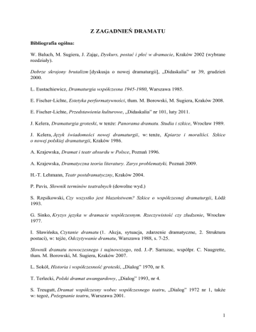 Z ZAGADNIEŃ DRAMATU Bibliografia ogólna: W. Baluch, M. Sugiera, J. Zając, Dyskurs, postać i płeć w dramacie, Kraków 2002 (wybrane rozdziały). Dobrze skrojony brutalizm [dyskusja o nowej dramaturgii], „Didaskalia” nr 39, grudzień 2000. L. Eustachiewicz, Dramaturgia współczesna 1945-1980, Warszawa 1985. E. Fischer-Lichte, Estetyka performatywności, tłum. M. Borowski, M. Sugiera, Kraków 2008. E. Fischer-Lichte, Przedstawienia kulturowe, „Didaskalia” nr 101, luty 2011. J. Kelera, Dramaturgia groteski, w tenże: Panorama dramatu. Studia i szkice, Wrocław 1989. J. Kelera, Język świadomości nowej dramaturgii, w: tenże, Kpiarze i moraliści. Szkice o nowej polskiej dramaturgii, Kraków 1986. A. Krajewska, Dramat i teatr absurdu w Polsce, Poznań 1996. A. Krajewska, Dramatyczna teoria literatury. Zarys problematyki, Poznań 2009. H.-T. Lehmann, Teatr postdramatyczny, Kraków 2004. P. Pavis, Słownik terminów teatralnych (dowolne wyd.) S. Rzęsikowski, Czy wszystko jest błazeństwem? Szkice o współczesnej dramaturgii, Łódź 1993. G. Sinko, Kryzys języka w dramacie współczesnym. Rzeczywistość czy złudzenie, Wrocław 1977. I. Sławińska, Czytanie dramatu (1. Akcja, sytuacja, zdarzenie dramatyczne, 2. Struktura postaci), w: tejże, Odczytywanie dramatu, Warszawa 1988, s. 7-25. Słownik dramatu nowoczesnego i najnowszego, red. J.-P. Sarrazac, współpr. C. Naugrette, tłum. M. Borowski, M. Sugiera, Kraków 2007. L. Sokół, Historia i współczesność groteski, „Dialog” 1970, nr 8. T. Terlecki, Polski dramat awangardowy, „Dialog” 1993, nr 4. S. Treugutt, Dramat współczesny wobec współczesnego teatru, „Dialog” 1972 nr 1, także w: tegoż, Pożegnanie teatru, Warszawa 2001. 1 S. Treugutt, Autor i teatr, w: tenże: Pożegnanie teatru, Warszawa 2001. A. Ubersfeld, Czytanie teatru I, Warszawa 2002. Witold GOMBROWICZ J. Błoński, Gombrowicz jako tragediopisarz, „Dialog” 1990, nr 2. G. Goldman, Teatr Gombrowicza, w: Gombrowicz i krytycy, oprac. Z. Łapiński, Kraków 1984, s. 145-163. J. Jarzębski, Natura i teatr : 16 tekstów o Gombrowiczu, Kraków 2007. J. Majcherek, Gombrowicz a teatr, „Pamiętnik Teatralny” 1983, nr 22. Z. Majchrowski, Gombrowicz i cień wieszcza oraz inne eseje o dramacie i teatrze, Gdańsk 1995. M. P. Markowski, Czarny nurt. Gombrowicz, świat, literatura, Kraków 2004. T. Nyczek, W teatrze Gombrowicza, „Miesięcznik Literacki” 1972, nr 3. M. Piwińska, Legenda romantyczna i szydercy, Warszawa 1973, s. 264-268. H. Schmidt, Struktura semantyczna trzech dramatów Witolda Gombrowicza, „Ruch Literacki” 1984, nr 4. W. Tarnowski, Od Gombrowicza do Mackiewicza, Londyn 1980. Witold Gombrowicz nasz współczesny : materiały międzynarodowej konferencji naukowej w stulecie urodzin pisarza. Uniwersytet Jagielloński - Kraków, 22-27 marca 2004, red. J. Jarzębski, Kraków 2010 (wybrane rozdziały). K. Wolicki, Gombrowicz, „Odra” 1972, nr 1. SŁAWOMIR MROŻEK J. Błoński, Wszystkie sztuki Mrożka, Kraków 1995. M. Esslin, Mrożek, Beckett i teatr absurdu, „NaGłos” 1991, nr 3, s. 209-217. M. Fik, Mrożek zmieniony oraz Co to znaczy Mrożek?, w: Sezony teatralne. Szkice, Kraków 1974. J. Kelera, Krótki przewodnik po Mrożku, „Odra” 1990, nr 6. J. Kelera, Mrożek, dowcip wyobraźni logicznej oraz Mrożek na etapie syntezy, w: Kpiarze i moraliści. Szkice o nowej polskiej dramaturgii, Kraków 1986. 2 M. Masłowski, Sławomir Mrożek. Teatr absurdu czy absurd w teatrze, „Przegląd Humanistyczny” 1989, nr 7. T. Nyczek, Obrona tradycji, „Zeszyty Literackie” 1987, nr 17, także w: tenże, Emigranci, Kraków 1988. M. Piwińska, Legenda romantyczna i szydercy, Warszawa 1973, s. 367-403. E. Sidoruk, Antropologia i groteska w dziełach Sławomira Mrożka, Białystok 1995. H. Stephan, Mrożek, Kraków 1996. M. Sugiera, Dramaturgia Sławomira Mrożka, Kraków 1996. A. Werner, Racjonalistyczna groteska, w: tenże, Polskie, arcypolskie, Londyn 1987. K. Wolicki, W poszukiwaniu miary. Twórczość dramatopisarska Sławomira Mrożka, „Pamiętnik Teatralny” 1975, z. 1, także nadbitka 1975. Tadeusz RÓŻEWICZ K. Braun, Języki teatru [Rozmowy z T. Różewiczem], Wrocław 1989. M. Dąbrowski, Teatr Różewicza - opisanie formy, „Miesięcznik Literacki” 1971, nr 3. T. Drewnowski, Walka o oddech. O pisarstwie Tadeusza Różewicza, Warszawa 1990. Także Laboratorium Różewicza - bez sceny, „Dialog” 1988, nr 7; Różewicz: stare i nowe dekoracje, „Dialog” 1988, nr 9; Inny Różewicz, „Dialog” 1988, nr 11/12. M. Fik, Teatr Różewicza, „Pamiętnik Teatralny” 1974, nr 1. S. Gębala, Teatr Różewicza, Wrocław 1978. J. Kelera, Od „Kartoteki” do „Pułapki”, „Dialog” 1987, nr 4,5. Także: Wstęp, w: T. Różewicz „Teatr”, t. I, Kraków 1988. J. Kelera, Leżący pod ścianą, w: Kpiarze i moraliści. Szkice o nowej polskiej dramaturgii, Kraków 1986. J. Kelera, O poetyckiej strukturze dramatów Różewicza, „Dialog” 1991, nr 10. [A. Kijowski], Antyteatr Różewicza, „Twórczość” 1966, nr 12. J. Kłossowicz, Różewicz i Beckett, „Dialog” 1972, nr 7. 3 Z. Majchrowski, Różewicz, Wrocław 2002. G. Niziołek, Ciało i słowo. Szkice o teatrze Tadeusza Różewicza, Kraków 2004. „Notatnik Teatralny” 1991, nr 2, (numer monograficzny). M. Piwińska, Różewicz albo technika collage’u, „Dialog” 1963, nr 9. M. Piwińska, Różewicz, romantyzm, awangarda, „Dialog” 1969, nr 7. M. Piwińska, Legenda romantyczna i szydercy, s. 377-366. C. Rowiński, Nowy Różewicz czyli granice dramatu, „Dialog” 1964, nr 7. K. Wolicki, Tadeusza Różewicza droga na scenę, w: tenże, Wszystko jedno co o 1930, Warszawa 1969. „Teatr” 1986, nr 11 (numer monograficzny). Wokół dramaturgii otwartej (Rozmowa K. Puzyny i T. Różewicza), „Dialog” 1969, nr 9. Także w: Przeciw konwencjom. Antologia, oprac. M. Fik, Warszawa 1994. Zbigniew HERBERT M. Baranowska, Radio jako osoba dramat