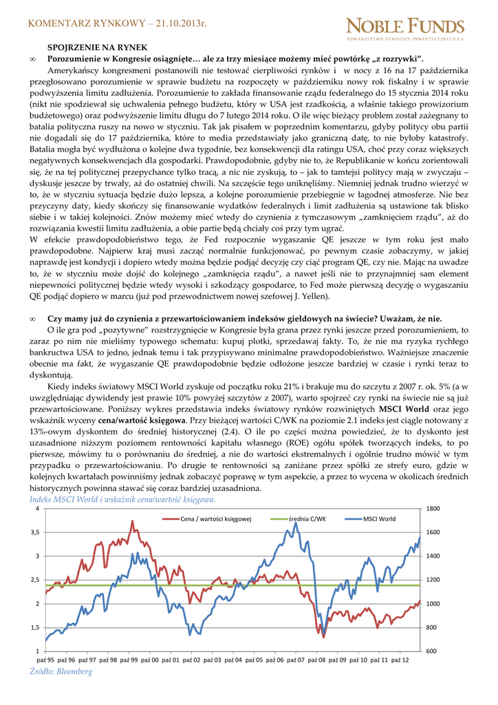 KOMENTARZ RYNKOWY – 21.10.2013r. SPOJRZENIE NA RYNEK Porozumienie w Kongresie osiągnięte… ale za trzy miesiące możemy mieć powtórkę „z rozrywki”. Amerykańscy kongresmeni postanowili nie testować cierpliwości rynków i w nocy z 16 na 17 października przegłosowano porozumienie w sprawie budżetu na rozpoczęty w październiku nowy rok fiskalny i w sprawie podwyższenia limitu zadłużenia. Porozumienie to zakłada finansowanie rządu federalnego do 15 stycznia 2014 roku (nikt nie spodziewał się uchwalenia pełnego budżetu, który w USA jest rzadkością, a właśnie takiego prowizorium budżetowego) oraz podwyższenie limitu długu do 7 lutego 2014 roku. O ile więc bieżący problem został zażegnany to batalia polityczna ruszy na nowo w styczniu. Tak jak pisałem w poprzednim komentarzu, gdyby politycy obu partii nie dogadali się do 17 października, które to media przedstawiały jako graniczną datę, to nie byłoby katastrofy. Batalia mogła być wydłużona o kolejne dwa tygodnie, bez konsekwencji dla ratingu USA, choć przy coraz większych negatywnych konsekwencjach dla gospodarki. Prawdopodobnie, gdyby nie to, że Republikanie w końcu zorientowali się, że na tej politycznej przepychance tylko tracą, a nic nie zyskują, to – jak to tamtejsi politycy mają w zwyczaju – dyskusje jeszcze by trwały, aż do ostatniej chwili. Na szczęście tego uniknęliśmy. Niemniej jednak trudno wierzyć w to, że w styczniu sytuacja będzie dużo lepsza, a kolejne porozumienie przebiegnie w łagodnej atmosferze. Nie bez przyczyny daty, kiedy skończy się finansowanie wydatków federalnych i limit zadłużenia są ustawione tak blisko siebie i w takiej kolejności. Znów możemy mieć wtedy do czynienia z tymczasowym „zamknięciem rządu”, aż do rozwiązania kwestii limitu zadłużenia, a obie partie będą chciały coś przy tym ugrać. W efekcie prawdopodobieństwo tego, że Fed rozpocznie wygaszanie QE jeszcze w tym roku jest mało prawdopodobne. Najpierw kraj musi zacząć normalnie funkcjonować, po pewnym czasie zobaczymy, w jakiej naprawdę jest kondycji i dopiero wtedy można będzie podjąć decyzję czy ciąć program QE, czy nie. Mając na uwadze to, że w styczniu może dojść do kolejnego „zamknięcia rządu”, a nawet jeśli nie to przynajmniej sam element niepewności politycznej będzie wtedy wysoki i szkodzący gospodarce, to Fed może pierwszą decyzję o wygaszaniu QE podjąć dopiero w marcu (już pod przewodnictwem nowej szefowej J. Yellen). • • Czy mamy już do czynienia z przewartościowaniem indeksów giełdowych na świecie? Uważam, że nie. O ile gra pod „pozytywne” rozstrzygnięcie w Kongresie była grana przez rynki jeszcze przed porozumieniem, to zaraz po nim nie mieliśmy typowego schematu: kupuj plotki, sprzedawaj fakty. To, że nie ma ryzyka rychłego bankructwa USA to jedno, jednak temu i tak przypisywano minimalne prawdopodobieństwo. Ważniejsze znaczenie obecnie ma fakt, że wygaszanie QE prawdopodobnie będzie odłożone jeszcze bardziej w czasie i rynki teraz to dyskontują. Kiedy indeks światowy MSCI World zyskuje od początku roku 21% i brakuje mu do szczytu z 2007 r. ok. 5% (a w uwzględniając dywidendy jest prawie 10% powyżej szczytów z 2007), warto spojrzeć czy rynki na świecie nie są już przewartościowane. Poniższy wykres przedstawia indeks światowy rynków rozwiniętych MSCI World oraz jego wskaźnik wyceny cena/wartość księgowa. Przy bieżącej wartości C/WK na poziomie 2.1 indeks jest ciągle notowany z 13%-owym dyskontem do średniej historycznej (2.4). O ile po części można powiedzieć, że to dyskonto jest uzasadnione niższym poziomem rentowności kapitału własnego (ROE) ogółu spółek tworzących indeks, to po pierwsze, mówimy tu o porównaniu do średniej, a nie do wartości ekstremalnych i ogólnie trudno mówić w tym przypadku o przewartościowaniu. Po drugie te rentowności są zaniżane przez spółki ze strefy euro, gdzie w kolejnych kwartałach powinniśmy jednak zobaczyć poprawę w tym aspekcie, a przez to wycena w okolicach średnich historycznych powinna stawać się coraz bardziej uzasadniona. Indeks MSCI World i wskaźnik cena/wartość księgowa. 4 1800 Cena / wartości księgowej średnia C/WK MSCI World 3,5 1600 3 1400 2,5 1200 2 1000 1,5 1 paź 95 paź 96 paź 97 paź 98 paź 99 paź 00 paź 01 paź 02 paź 03 paź 04 paź 05 paź 06 paź 07 paź 08 paź 09 paź 10 paź 11 paź 12 Źródło: Bloomberg 800 600 KOMENTARZ RYNKOWY – 21.10.2013r. W tabeli poniżej przedstawione są bieżące wartości wskaźnika cena/wartość księgowa dla poszczególnych indeksów MSCI oraz GPW (stan na 14 października) oraz porównanie ich do średniej historycznej (średnia dla MSCI sięga danych dostępnych od 1995 r., a dla indeksów GPW od 2002 r.). W zdecydowanej większości przypadków mamy poziomy C/WK poniżej średnich historycznych. Szczególnie jest to widoczne na peryferiach Europy, ale to też po części odzwierciedla ich niską rentowność na kapitale własnym (ROE). Jeśli wraz z ożywieniem we Włoszech czy Hiszpanii będziemy widzieć istotne odbicie na wskaźnikach rentowności, to tak wysokie dyskonto do średniej powinno być stopniowo zmniejszane. Kilkanaście procent poniżej średnich wycen C/WK są także indeksy z GPW. Więc pod tym względem także trudno mówić o szerokim przewartościowaniu naszego rynku.. Cena / wartości księgowej Cena / wartości księgowej Odchylenie od średniej – data bieżąca – średnia historyczna Indeksy akcyjne MSCI/GPW MSCI Niemcy 1,7 1,5 MSCI EM (rynki wschodzące) 1,6 1,6 2,8% MSCI Brazylia 1,5 1,6 -2,3% MSCI World (rynki rozwinięte) 2,1 2,4 -13,5% mWIG40 1,6 1,9 -15,2% WIG 1,4 1,7 -16,6% MSCI Chiny 1,5 1,9 -16,7% MSCI USA 2,5 3,1 -17,0% WIG20 1,4 1,7 -17,9% MSCI Turcja 1,7 2,1 -20,4% MSCI Wielka Brytania 1,9 2,4 -21,6% MSCI Francja 1,5 2,0 -25,2% MSCI Hiszpania 1,3 2,1 -34,8% MSCI Włochy 0,9 1,8 -46,9% 