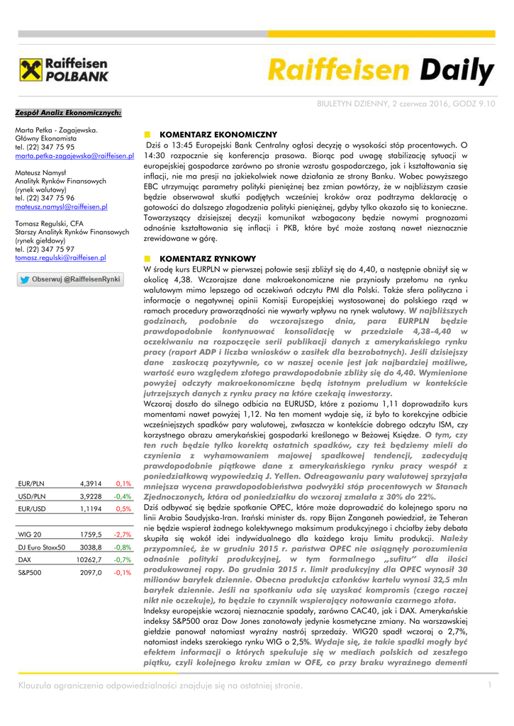 BIULETYN DZIENNY, 2 czerwca 2016, GODZ 9.10 Zespół Analiz Ekonomicznych: Marta Petka - Zagajewska. Główny Ekonomista tel. (22) 347 75 95 [email protected] Mateusz Namysł Analityk Rynków Finansowych (rynek walutowy) tel. (22) 347 75 96 [email protected] Tomasz Regulski, CFA Starszy Analityk Rynków Finansowych (rynek giełdowy) tel. (22) 347 75 97 [email protected] EUR/PLN 4,3914 0,1% USD/PLN 3,9228 -0,4% EUR/USD 1,1194 0,5% WIG 20 1759,5 -2,7% DJ Euro Stoxx50 3038,8 -0,8% 10262,7 -0,7% 2097,0 -0,1% DAX S&P500 KOMENTARZ EKONOMICZNY Dziś o 13:45 Europejski Bank Centralny ogłosi decyzję o wysokości stóp procentowych. O 14:30 rozpocznie się konferencja prasowa. Biorąc pod uwagę stabilizację sytuacji w europejskiej gospodarce zarówno po stronie wzrostu gospodarczego, jak i kształtowania się inflacji, nie ma presji na jakiekolwiek nowe działania ze strony Banku. Wobec powyższego EBC utrzymując parametry polityki pieniężnej bez zmian powtórzy, że w najbliższym czasie będzie obserwował skutki podjętych wcześniej kroków oraz podtrzyma deklarację o gotowości do dalszego złagodzenia polityki pieniężnej, gdyby tylko okazało się to konieczne. Towarzyszący dzisiejszej decyzji komunikat wzbogacony będzie nowymi prognozami odnośnie kształtowania się inflacji i PKB, które być może zostaną nawet nieznacznie zrewidowane w górę. KOMENTARZ RYNKOWY W środę kurs EURPLN w pierwszej połowie sesji zbliżył się do 4,40, a następnie obniżył się w okolicę 4,38. Wczorajsze dane makroekonomiczne nie przyniosły przełomu na rynku walutowym mimo lepszego od oczekiwań odczytu PMI dla Polski. Także sfera polityczna i informacje o negatywnej opinii Komisji Europejskiej wystosowanej do polskiego rząd w ramach procedury praworządności nie wywarły wpływu na rynek walutowy. W najbliższych godzinach, podobnie do wczorajszego dnia, para EURPLN będzie prawdopodobnie kontynuować konsolidację w przedziale 4,38-4,40 w oczekiwaniu na rozpoczęcie serii publikacji danych z amerykańskiego rynku pracy (raport ADP i liczba wniosków o zasiłek dla bezrobotnych). Jeśli dzisiejszy dane zaskoczą pozytywnie, co w naszej ocenie jest jak najbardziej możliwe, wartość euro względem złotego prawdopodobnie zbliży się do 4,40. Wymienione powyżej odczyty makroekonomiczne będą istotnym preludium w kontekście jutrzejszych danych z rynku pracy na które czekają inwestorzy. Wczoraj doszło do silnego odbicia na EURUSD, które z poziomu 1,11 doprowadziło kurs momentami nawet powyżej 1,12. Na ten moment wydaje się, iż było to korekcyjne odbicie wcześniejszych spadków pary walutowej, zwłaszcza w kontekście dobrego odczytu ISM, czy korzystnego obrazu amerykańskiej gospodarki kreślonego w Beżowej Księdze. O tym, czy ten ruch będzie tylko korektą ostatnich spadków, czy też będziemy mieli do czynienia z wyhamowaniem majowej spadkowej tendencji, zadecydują prawdopodobnie piątkowe dane z amerykańskiego rynku pracy wespół z poniedziałkową wypowiedzią J. Yellen. Odreagowaniu pary walutowej sprzyjała mniejsza wycena prawdopodobieństwa podwyżki stóp procentowych w Stanach Zjednoczonych, która od poniedziałku do wczoraj zmalała z 30% do 22%. Dziś odbywać się będzie spotkanie OPEC, które może doprowadzić do kolejnego sporu na linii Arabia Saudyjska-Iran. Irański minister ds. ropy Bijan Zanganeh powiedział, że Teheran nie będzie wspierał żadnego kolektywnego maksimum produkcyjnego i chciałby żeby debata skupiła się wokół idei indywidualnego dla każdego kraju limitu produkcji. Należy przypomnieć, że w grudniu 2015 r. państwa OPEC nie osiągnęły porozumienia odnośnie polityki produkcyjnej, w tym formalnego „sufitu” dla ilości produkowanej ropy. Do grudnia 2015 r. limit produkcyjny dla OPEC wynosił 30 milionów baryłek dziennie. Obecna produkcja członków kartelu wynosi 32,5 mln baryłek dziennie. Jeśli na spotkaniu uda się uzyskać kompromis (czego raczej nikt nie oczekuje), to będzie to czynnik wspierający notowania czarnego złota. Indeksy europejskie wczoraj nieznacznie spadały, zarówno CAC40, jak i DAX. Amerykańskie indeksy S&P500 oraz Dow Jones zanotowały jedynie kosmetyczne zmiany. Na warszawskiej giełdzie panował natomiast wyraźny nastrój sprzedaży. WIG20 spadł wczoraj o 2,7%, natomiast indeks szerokiego rynku WIG o 2,5%. Wydaje się, że takie spadki mogły być efektem informacji o których spekuluje się w mediach polskich od zeszłego piątku, czyli kolejnego kroku zmian w OFE, co przy braku wyraźnego dementi Klauzula ograniczenia odpowiedzialności znajduje się na ostatniej stronie. 1 BIULETYN DZIENNY, 2 czerwca 2016, GODZ 9.10 jest negatywnym sygnałem dla warszawskiego parkietu. Informacja o spekulacjach odnośnie zmian w systemie emerytalnym pojawiła się na globalnych serwisach i to inwestorzy zagraniczni mogą być odpowiedzialni za wyraźną przecenę. 2 Klauzula ograniczenia odpowiedzialności znajduje się na ostatniej stronie. BIULETYN DZIENNY, 2 czerwca 2016, GODZ 9.10 Stan na początek dnia Waluty EUR/PLN Zamkn. 4,3914 Zmiana % 5 sesji Zmiana % 4,3895 0,11% -0,42% -0,74% USD/PLN 3,9228 3,9219 -0,43% Wyniki sesji: Polska Zamkn. Zmiana % WIG 44700,7 -2,49% -3,40% 715 187,88 WIG 20 1759,5 -2,70% -3,91% 543 985,06 Zmiana % 5 sesji obroty (w tys PLN) CHF/PLN 3,9697 3,9673 0,10% -0,48% WIG 30 1953,9 -2,62% -3,91% 586 593,09 EUR/USD 1,1194 1,1188 0,50% 0,30% mWIG40 3403,8 -2,31% -3,02% 129 747,71 GBP/PLN 5,6622 5,6528 -0,95% -2,63% sWIG80 13343,1 -2,38% -2,24% 48 211,37 WIG Banki 5667,6 -2,96% -4,14% 135 630,98 WIG Telkom 716,9 -1,19% -3,17% 40 749,90 WIG Budow 2721,9 -3,70% -2,53% 35 759,22 WIG Paliwa 4572,8 -1,24% -1,70% 121 155,97 Wyniki sesji: Świat Indeks *Zamkniecie z poprzedniego dnia z godziny 22:00 FIXINGI Data 3M Euribor Wartość 2016-06-01 3M Libor CHF Zmiana (pb) - -0,261% 2016-05-31 (0,0020) -0,735% FIXINGI Wartość Zmiana (pb) 1,60% 0,01 3M Wibor fixing 1,68% - Czechy PX