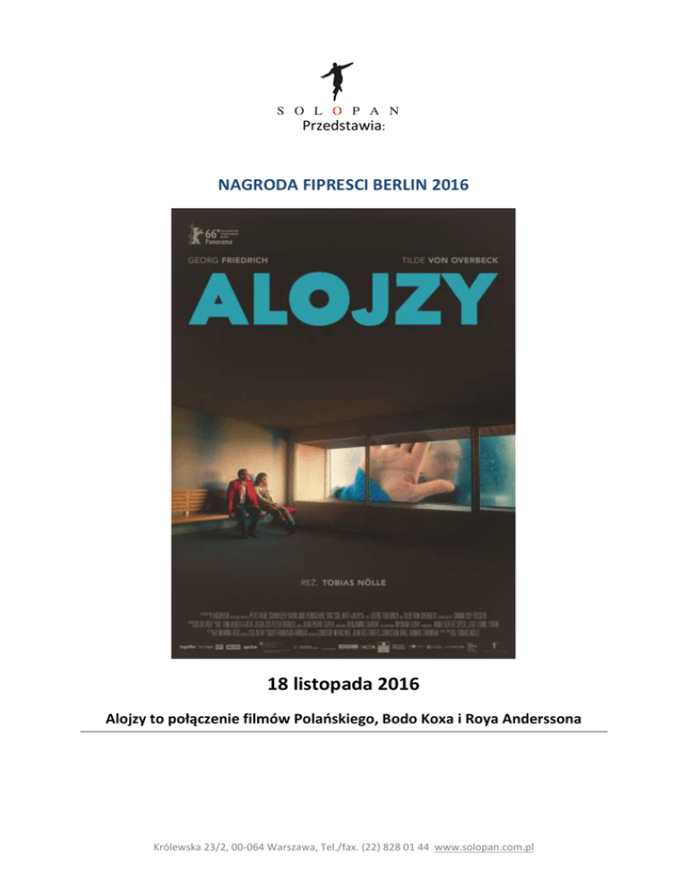 Przedstawia: NAGRODA FIPRESCI BERLIN 2016 18 listopada 2016 Alojzy to połączenie filmów Polańskiego, Bodo Koxa i Roya Anderssona Królewska 23/2, 00-064 Warszawa, Tel./fax. (22) 828 01 44 www.solopan.com.pl SYNOPSIS Alojzy Adorn jest prywatnym detektywem, człowiekiem na pierwszy rzut oka niepozornym, nierzucającym się w oczy. Obserwuje życie z bezpiecznej odległości, wszystko nagrywając kamerą 24 godziny na dobę. Kiedy umiera jego ojciec, Alojzy zostaje sam, a jego bezpieczne do tej pory życie zaczyna się rozpadać na kawałki. Po nocy ciężkiego picia, budzi się w autobusie i odkrywa, że jego aparat fotograficzny oraz cenne taśmy wideo zostały skradzione. Wkrótce po tym zdarzeniu pojawia się tajemnicza kobieta, która zaczyna go szantażować. Oferuje mu zwrot skradzionych taśm pod warunkiem, że przyłączy się do niej grając w japońską grę pt. „telefoniczna wędrówka“, używając do tego tylko swojej wyobraźni jako jedynego połączenia. Detektyw wciąga się w jej grę coraz głębiej aż zakochuje się w głosie po drugiej stronie słuchawki. Kobieta otwiera przed nim nowy świat. Nölle zgrabnie lawiruje pomiędzy dramatem psychologicznym a absurdalnym dowcipem i dynamicznie odwracającymi się rolami bohaterów. „Alojzy” to po części intrygujące stadium samotności i żałoby, a po części film o przełamywaniu ograniczeń i lęków. W filmie odnajdziemy również zaskakujący romans, w którym wydarzyć się może wszystko np. szalona impreza w czerwonych garniturach. Królewska 23/2, 00-064 Warszawa, Tel./fax. (22) 828 01 44 www.solopan.com.pl BIO REŻYSERA Tobias Nölle, urodzony w 1976 w Zürichu, studiował film w School of Visual Arts w Nowym Jorku. Jego film René z 2008 roku był pokazywany na wielu festiwalach na całym świecie i zdobył kilka nagród, takich jak Golden Leopard w Locarno za najlepszy krótki film szwajcarski. Nölle jest jednym z reżyserów filmu Wonderland, który miał swoją premierę na Festiwalu w Locarno w 2015 roku. Alojzy jest jego pierwszym filmem, do którego napisał scenariusz oraz który wyreżyserował. Został on zaprezentowany na Festiwalu Filmowym Torino Lab oraz na festiwalach: Rotterdam Cinémart i Berlinale. FILMOGRAFIA 2016 Alojzy 2015 Heimatland 2007 René 2006 Mes vacances 2006 Kuckuck 2004 Bernd 2003 Davis WYWIAD Z REŻYSEREM Jakie były twoje inspiracje do stworzenia filmu "Alojzy"? Człowiek obserwujący życie za pomocą kamery, człowiek, który jest niewidoczny dla świata do momentu, gdy ktoś włączy kamerę i skieruje ją w jego kierunku. Postrzegam tą cechę charakteru jako bardzo współczesną: dziś każdy dąży do tego aby być widocznym. Bycie widocznym i bycie „lubianym” znajduje się w centrum potrzeb pokolenia cyfrowego. U Alojza jest odwrotnie - on tylko obserwuje. A to, że jest przez to odizolowany sprawia, ze polubiłem tą postać od razu. Jest jak niewidzialny duch, prawie nie istnieje. Ale wszyscy potrzebujemy innych ludzi, którzy są dla nas jak lustro, aby czuć że żyjemy. Wszyscy otrzebujemy informacji zwrotnych, a więc Alojzy też. Do stworzenia tego filmu zainspirowało mnie również zjawisko izolowania się w mieście - ten paranoiczny lęk, że coś mogłoby zachwiać naszym bezpiecznym „rajem”. Podobnie jak Alojzy, który trzyma się zasad określonych przez jego przodków i izoluje się od życia. On żyje w swoim starym, zakurzonym balonie bezpieczeństwa, obserwując świat za pomocą kamery. Utraciłby znaczną część swojego człowieczeństwa, gdyby nie pojawił się w tym świecie intruz (Vera). Podążając za tym tokiem myślenia, bardzo inspirującą dla mnie postacią był Harry Caul z filmu „Rozmowa” Francisa Forda Coppoli. Zawsze wyobrażałem Królewska 23/2, 00-064 Warszawa, Tel./fax. (22) 828 01 44 www.solopan.com.pl sobie, że Alojzy jest jego synem. Ojca Alojzego nazwałem Harry, ale ponieważ nie mogłem umieścić Gene’a Hackmana w tej roli, poprosiłem o to prawdziwego ojca Georga Friedricha. To było bardzo emocjonalne mieć ich obu w tym filmie. Innym kluczowym elementem było zjawisko „telefonicznej wędrówki”, które mają swój początek w Japonii. Miałem swój udział w długich związkach na odległość, w tym również walk seks przez telefon i wszystkie inne dziwne rzeczy. Można być bardzo blisko ze sobą słysząc się tylko z drugą osobą, można wyznawać miłość i czuć się kochanym pomimo, że dwie osoby są w rzeczywistości oddalone o tysiące mil. Spotkanie się w tej przestrzeni, w naszych głowach - znalazłem fascynującą przestrzeń do spotkań i chciałem opowiedzieć o tym w kinie. Mam obsesję na punkcie tego, że wszechświat w naszych głowach jest więc znacznie większy niż ten, który fizycznie zamieszkujemy. W relacji projekcja często jest dużo lepsza niż rzeczywistość, a pomiędzy dwiema osobami toczy się ciągła walka. Życie bez wyobraźni byłoby puste i martwe. Rozwijanie swojej wyobraźni to napełnianie się nadzieją. I to wszystko, co powinniśmy robić aby sprawy przybrały właściwy obrót. Gra aktorska Georga Friedricha jest kluczem do filmu. Jak ważne było to, aby pracować z tym konkretnym aktorem? Jestem bardzo zaszczycony, że dano mi szansę pracy z aktorem takiego kalibru. Georg Friedrich jest jednym z najlepszych europejskich aktorów swojego pokolenia. Jest w nim coś naprawdę magicznego, jego aura, jego kamienna twarz w połączeniu z jego głębokim, niskim głosem. On jest bardzo silny na zewnątrz i niezwykle delikatny w środku. W jednej chwili może zagrać surowego oficera Stasi a w następnej jest delikatny jak kot. Kocham to w nim. Jest jak prezent dla każdej kamery, po prostu chce się go filmować. Wypełnia powietrze swoją obecnością i instynktem przetrwania. Najlepsze w nim jest to, że nie jest jednym z tych egocentrycznych aktorów, którzy wykonują swoją pracę, tylko po to aby wszyscy ich podziwiali. Pod tym względe