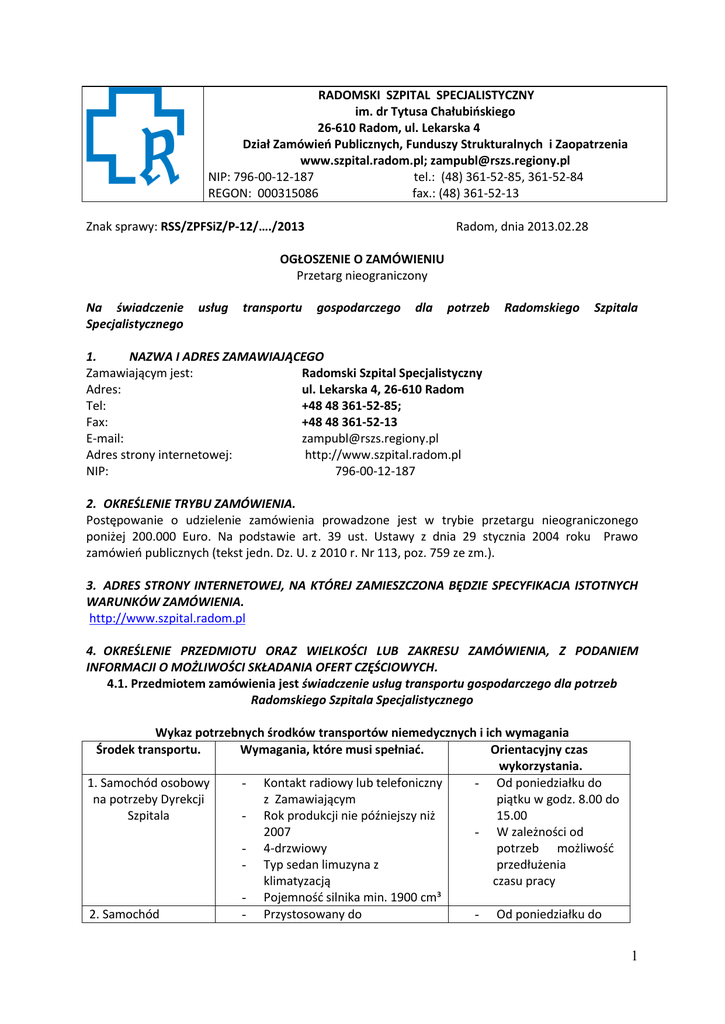 RADOMSKI SZPITAL SPECJALISTYCZNY im. dr Tytusa Chałubińskiego 26-610 Radom, ul. Lekarska 4 Dział Zamówień Publicznych, Funduszy Strukturalnych i Zaopatrzenia www.szpital.radom.pl; [email protected] NIP: 796-00-12-187 tel.: (48) 361-52-85, 361-52-84 REGON: 000315086 fax.: (48) 361-52-13 Znak sprawy: RSS/ZPFSiZ/P-12/…./2013 Radom, dnia 2013.02.28 OGŁOSZENIE O ZAMÓWIENIU Przetarg nieograniczony Na świadczenie Specjalistycznego usług transportu gospodarczego dla potrzeb Radomskiego Szpitala 1. NAZWA I ADRES ZAMAWIAJĄCEGO Zamawiającym jest: Radomski Szpital Specjalistyczny Adres: ul. Lekarska 4, 26-610 Radom Tel: +48 48 361-52-85; Fax: +48 48 361-52-13 E-mail: [email protected] Adres strony internetowej: http://www.szpital.radom.pl NIP: 796-00-12-187 2. OKREŚLENIE TRYBU ZAMÓWIENIA. Postępowanie o udzielenie zamówienia prowadzone jest w trybie przetargu nieograniczonego poniżej 200.000 Euro. Na podstawie art. 39 ust. Ustawy z dnia 29 stycznia 2004 roku Prawo zamówień publicznych (tekst jedn. Dz. U. z 2010 r. Nr 113, poz. 759 ze zm.). 3. ADRES STRONY INTERNETOWEJ, NA KTÓREJ ZAMIESZCZONA BĘDZIE SPECYFIKACJA ISTOTNYCH WARUNKÓW ZAMÓWIENIA. http://www.szpital.radom.pl 4. OKREŚLENIE PRZEDMIOTU ORAZ WIELKOŚCI LUB ZAKRESU ZAMÓWIENIA, Z PODANIEM INFORMACJI O MOŻLIWOŚCI SKŁADANIA OFERT CZĘŚCIOWYCH. 4.1. Przedmiotem zamówienia jest świadczenie usług transportu gospodarczego dla potrzeb Radomskiego Szpitala Specjalistycznego Wykaz potrzebnych środków transportów niemedycznych i ich wymagania Środek transportu. Wymagania, które musi spełniać. Orientacyjny czas wykorzystania. 1. Samochód osobowy - Kontakt radiowy lub telefoniczny - Od poniedziałku do na potrzeby Dyrekcji z Zamawiającym piątku w godz. 8.00 do Szpitala - Rok produkcji nie późniejszy niż 15.00 2007 - W zależności od - 4-drzwiowy potrzeb możliwość - Typ sedan limuzyna z przedłużenia klimatyzacją czasu pracy - Pojemność silnika min. 1900 cm³ 2. Samochód - Przystosowany do - Od poniedziałku do 1 dostawczy na potrzeby Działu Żywienia - 3. Samochód dostawczy na potrzeby Działu AdministracyjnoGospodarczego i Działu Technicznego oraz Działu Zamówień Publicznych i Zaopatrzenia - - przewożenia artykułów spożywczych Ładowność 500-700kg Samochód dostawczy o ładowności minimum 1 tona z przestrzenią ładunkową pokrytą plandeką, o wymiarach nie mniej niż: 3,20 m długość, 2,00 m szerokość, 1,80 m wysokość Przystosowany do przewożenia minimum 2 osób + kierowca Przystosowany do przewożenia towarów niebezpiecznych tj. spirytus, podchloryn sodu, gazy medyczne. - - piątku w godz. 7.00 do 15.30 We wszystkie dni wolne od pracy i święta w godz. 7.00 do 14.30 Wtorek i piątek w godzinach : od 8.00 do godziny 14.00 UWAGA ! - Istnieje możliwość dodatkowego zamówienia z poz. 3 transportu o tych samych parametrach w inne dni po wcześniejszym uzgodnieniu (zamówieniu). W uzasadnionych przypadkach dopuszcza się czas krótszy lub dłuższy. 4.2. Zamawiający nie dopuszcza możliwości składania ofert częściowych. 4.3. Główny przedmiot zamówienia wg Wspólnego Słownika Zamówień Publicznych: kod CPV: 60170000-0 – Wynajem pojazdów przeznaczonych do transportu osób wraz z kierowcą; 60180000-3 – Wynajem pojazdów do transportu towarów wraz z kierowcą 5. INFORMACJE O MOŻLIWOŚCI ZŁOŻENIA OFERT WARIANTOWYCH. Zamawiający nie dopuszcza możliwości składania ofert wariantowych. 6. TERMIN WYKONANIA ZAMÓWIENIA. 24 m-ce od daty zawarcia umowy lub do wyczerpania wartości umowy. 7. WARUNKI UDZIAŁU W POSTĘPOWANIU ORAZ OPIS SPOSOBU DOKONYWANIA OCENY SPEŁNIENIA TYCH WARUNKÓW. Zamawiający dokonuje opisu sposobu dokonywania oceny spełniania warunków w zakresie dla niego niezbędnym: 7.1. O udzielenie zamówienia mogą się ubiegać wykonawcy, którzy spełniają warunki dotyczące: a) Warunki podmiotowe: 1. Potencjał techniczny: Opis sposobu dokonywania oceny spełniania tego warunku: Wykonawca wykaże, że dysponuje minimum 3 samochodami (po 1 z każdego rodzaju samochodów, określonych w przedmiocie zamówienia ) niezbędnymi do wykonania usługi. Wykonawcy wspólnie ubiegający się o udzielenie zamówienia powinni wykazać, że warunek określony powyżej spełniają łącznie. 2. Osoby zdolne do wykonania zamówienia: Wykonawca wykaże, że dysponuje osobami zdolnymi do wykonania zamówienia, t.j. kierujący pojazdami powinni posiadać prawo jazdy kategorii B. Wykonawcy wspólnie ubiegający się o udzielenie zamówienia powinni wykazać, że warunek określony powyżej spełniają łącznie 2 3. Nie podlegają wykluczeniu z postępowania o udzielenie zamówienia w związku z brakiem podstaw do wykluczenia z powodu niespełniania warunków, o których mowa w art. 24 ust. 1 ustawy prawo zamówień publicznych. W przypadku Wykonawców wspólnie ubiegających się o zamówienie w/w dokument składa każdy z Wykonawców oddzielnie. b. Warunki przedmiotowe: 1. Samochód dostawczy na potrzeby Działu Żywienia jest dopuszczony do przewożenia artykułów spożywczych - zgodnie z art. 61 ustawy z dnia 25.08.2006r. o bezpieczeństwie żywności i żywienia t.j. /D.U. z 2010r., nr 136, poz. 914 ze zm./. Wykonawcy wspólnie ubiegający się o udzielenie zamówienia powinni wykazać, że warunek określony powyżej spełniają łącznie. Ocena spełniania warunków wymaganych od Wykonawców zostanie dokonana wg formuły „spełnia - nie spełnia” na podstawie załączonych do oferty oświadczeń i dokumentów. 8.WYKAZ OŚWIADCZEŃ I DOKUMENTÓW, JAKIE MUSZĄ DOSTARCZYĆ WYKONAWCY W CELU POTWIERDZENIA SPEŁNIENIA WARUNKÓW UDZIAŁU W POSTĘPOWANIU. 8.1. oświadczenie o spełnieniu warunków udziału w postępowaniu – według wzoru załączonego do SIWZ. W przypadku Wykonawców wspólnie ubiegających się o zamówienie dokument składa przynajmniej jeden z Wykonawców lub składają łącznie. 8.2. wykaz narzędzi, wyposażenia zakładu i urządzeń technicz