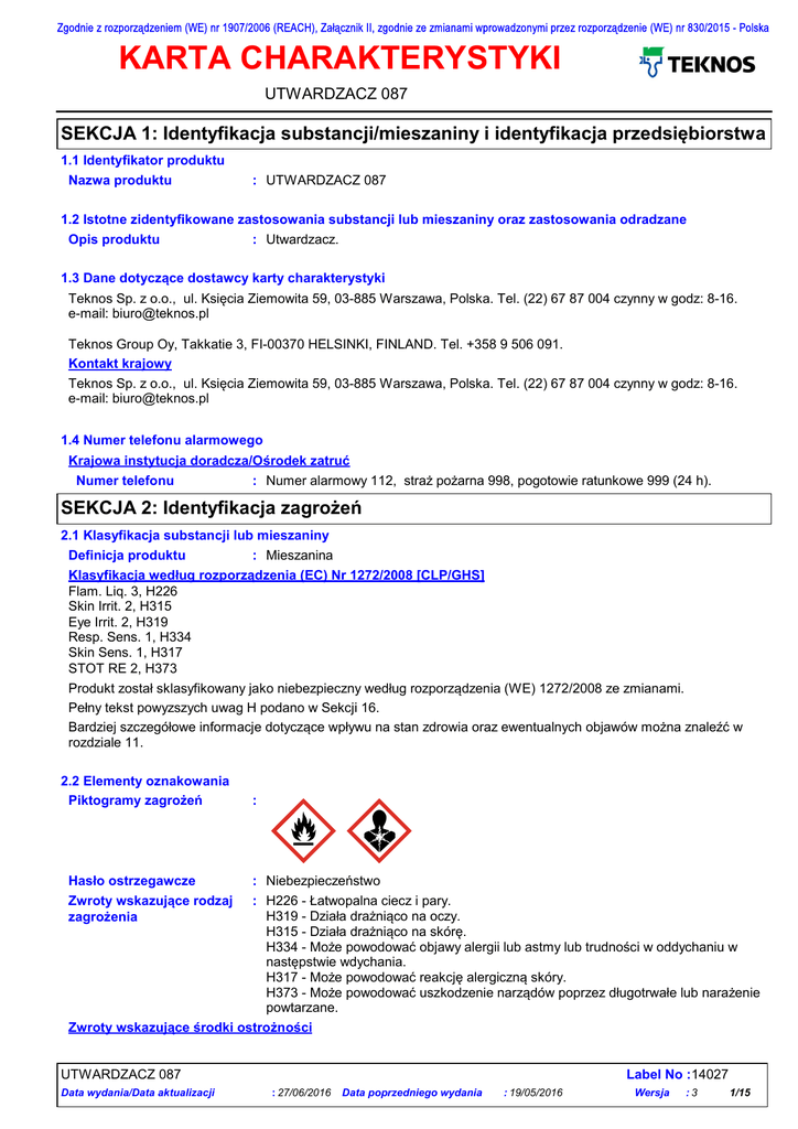 Zgodnie z rozporządzeniem (WE) nr 1907/2006 (REACH), Załącznik II, zgodnie ze zmianami wprowadzonymi przez rozporządzenie (WE) nr 830/2015 - Polska KARTA CHARAKTERYSTYKI UTWARDZACZ 087 SEKCJA 1: Identyfikacja substancji/mieszaniny i identyfikacja przedsiębiorstwa 1.1 Identyfikator produktu Nazwa produktu : UTWARDZACZ 087 1.2 Istotne zidentyfikowane zastosowania substancji lub mieszaniny oraz zastosowania odradzane Opis produktu : Utwardzacz. 1.3 Dane dotyczące dostawcy karty charakterystyki Teknos Sp. z o.o., ul. Księcia Ziemowita 59, 03-885 Warszawa, Polska. Tel. (22) 67 87 004 czynny w godz: 8-16. e-mail: [email protected] Teknos Group Oy, Takkatie 3, FI-00370 HELSINKI, FINLAND. Tel. +358 9 506 091. Kontakt krajowy Teknos Sp. z o.o., ul. Księcia Ziemowita 59, 03-885 Warszawa, Polska. Tel. (22) 67 87 004 czynny w godz: 8-16. e-mail: [email protected] 1.4 Numer telefonu alarmowego Krajowa instytucja doradcza/Ośrodek zatruć Numer telefonu : Numer alarmowy 112, straż pożarna 998, pogotowie ratunkowe 999 (24 h). SEKCJA 2: Identyfikacja zagrożeń 2.1 Klasyfikacja substancji lub mieszaniny Definicja produktu : Mieszanina Klasyfikacja według rozporządzenia (EC) Nr 1272/2008 [CLP/GHS] Flam. Liq. 3, H226 Skin Irrit. 2, H315 Eye Irrit. 2, H319 Resp. Sens. 1, H334 Skin Sens. 1, H317 STOT RE 2, H373 Produkt został sklasyfikowany jako niebezpieczny według rozporządzenia (WE) 1272/2008 ze zmianami. Pełny tekst powyzszych uwag H podano w Sekcji 16. Bardziej szczegółowe informacje dotyczące wpływu na stan zdrowia oraz ewentualnych objawów można znaleźć w rozdziale 11. 2.2 Elementy oznakowania Piktogramy zagrożeń Hasło ostrzegawcze : : Niebezpieczeństwo Zwroty wskazujące rodzaj zagrożenia : H226 - Łatwopalna ciecz i pary. H319 - Działa drażniąco na oczy. H315 - Działa drażniąco na skórę. H334 - Może powodować objawy alergii lub astmy lub trudności w oddychaniu w następstwie wdychania. H317 - Może powodować reakcję alergiczną skóry. H373 - Może powodować uszkodzenie narządów poprzez długotrwałe lub narażenie powtarzane. Zwroty wskazujące środki ostrożności UTWARDZACZ 087 Data wydania/Data aktualizacji Label No :14027 : 27/06/2016 Data poprzedniego wydania : 19/05/2016 Wersja :3 1/15 SEKCJA 2: Identyfikacja zagrożeń Zapobieganie Reagowanie Przechowywanie Usuwanie Niebezpieczne składniki Uzupełniające elementy etykiety Ograniczenia dotyczące produkcji, wprowadzania do obrotu i stosowania niektórych niebezpiecznych substancji, preparatów i wyrobów : P280 - Stosować rękawice ochronne. Nosić okulary ochronne lub ochronę twarzy. P210 - Przechowywać z dala od źródeł ciepła, gorących powierzchni, źródeł iskrzenia, otwartego ognia i innych źródeł zapłonu. Nie palić. : P342 + P311 - W przypadku wystąpienia objawów ze strony układu oddechowego: Skontaktować się z OŚRODKIEM ZATRUĆ lub wezwać lekarza. P303 + P353 - W PRZYPADKU KONTAKTU ZE SKÓRĄ (lub z włosami): Spłukać skórę wodą albo pod prysznicem. : P403 - Przechowywać w dobrze wentylowanym miejscu. : P501 - Zawartość pojemnika jak i pojemnik utylizować zgodnie z lokalnymi, regionalnymi, narodowymi oraz międzynarodowymi przepisami. : Ksylen 1,2-diaminoetan : Nie dotyczy. : 2.3 Inne zagrożenia Inne zagrożenia nie odzwierciedlone w klasyfikacji : Nie znane. SEKCJA 3: Skład/informacja o składnikach 3.2 Mieszaniny : Mieszanina Klasyfikacja Nazwa produktu/składnika Identyfikatory % Rozporządzenie (WE) Nr 1272/2008 [CLP] Typ Ksylen REACH #: 01-2119488216-32 ≥10 - <20 WE: 215-535-7 CAS: 1330-20-7 Indeks: 601-022-00-9 Flam. Liq. 3, H226 Acute Tox. 4, H312 Acute Tox. 4, H332 Skin Irrit. 2, H315 Eye Irrit. 2, H319 STOT SE 3, H335 STOT RE 2, H373 (doustnie) Asp. Tox. 1, H304 [1] [2] etylobenzen REACH #: 01-2119489370-35 ≥3 - <5 WE: 202-849-4 CAS: 100-41-4 Indeks: 601-023-00-4 Flam. Liq. 2, H225 Acute Tox. 4, H332 STOT RE 2, H373 (narząd słuchu) Asp. Tox. 1, H304 [1] [2] 1,2-diaminoetan REACH #: 01-2119480383-37 ≥1 - <3 WE: 203-468-6 CAS: 107-15-3 Indeks: 612-006-00-6 Flam. Liq. 3, H226 Acute Tox. 4, H302 Acute Tox. 4, H312 Skin Corr. 1B, H314 Eye Dam. 1, H318 Resp. Sens. 1, H334 Skin Sens. 1, H317 Pełny tekst powyzszych uwag H podano w Sekcji 16. [1] [2] UTWARDZACZ 087 Data wydania/Data aktualizacji Label No :14027 : 27/06/2016 Data poprzedniego wydania : 19/05/2016 Wersja :3 2/15 SEKCJA 3: Skład/informacja o składnikach Nie zawiera dodatkowych składników, które w świetle obecnej wiedzy dostawcy oraz w danym stężeniu są klasyfikowane jako niebezpieczne dla zdrowia lub otoczenia, lub klasyfikowane są jako PBT lub vPvB bądź jako substancje wywołujące równorzędne obawy, lub które mogą występować w środowisku pracy jedynie w ograniczonym zakresie, w związku z czym muszą zostać wymienione w niniejszym ustępie. Typ [1] Substancja sklasyfikowana jako szkodliwa dla zdrowia lub środowiska [2] Substancja, dla której wyznaczono dopuszczalne stężenie w środowisku pracy [3] Substancja spełnia kryteria dla jej zaklasyfikowania jako PBT zgodnie z Rozporządzeniem (WE) Nr 1907/2006, Aneks XIII [4] Substancja spełnia kryteria dla jej zaklasyfikowania jako vPvB zgodnie z Rozporządzeniem (WE) Nr 1907/2006, Aneks XIII [5] Substancja wywołująca równorzędne obawy Najwyższe dopuszczalne stężenia, jeśli są dostępne, wymienione są w sekcji 8. SEKCJA 4: Środki pierwszej pomocy 4.1 Opis środków pierwszej pomocy Kontakt z okiem Wdychanie Kontakt ze skórą Spożycie Ochrona osób udzielających pierwszej pomocy : Natychmiast przepłukać oczy dużą ilością wody, od czasu do czasu podnosząc górna i dolna powiekę. Usunąć szkła kontaktowe jeżeli są. Należy kontynuować płukanie przez co najmniej 10 minut. Zasięgnąć porady medycznej. : Wyprowadzić lub wynieść poszkodowanego na świeże powietrze i zapewnić warunki do odpoczynku w pozycji umożliwiającej swobodne oddychanie. Jeśli podejrzewa się, że opary wciąż s