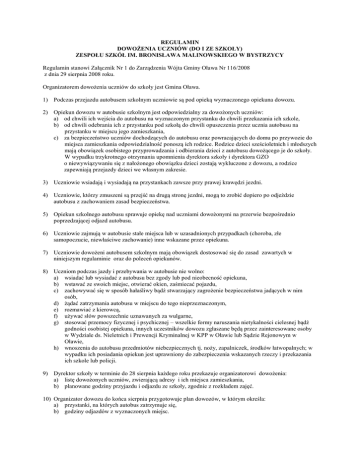 REGULAMIN DOWOŻENIA UCZNIÓW (DO I ZE SZKOŁY) ZESPOŁU SZKÓŁ IM. BRONISŁAWA MALINOWSKIEGO W BYSTRZYCY Regulamin stanowi Załącznik Nr 1 do Zarządzenia Wójta Gminy Oława Nr 116/2008 z dnia 29 sierpnia 2008 roku. Organizatorem dowożenia uczniów do szkoły jest Gmina Oława. 1) Podczas przejazdu autobusem szkolnym uczniowie są pod opieką wyznaczonego opiekuna dowozu. 2) Opiekun dowozu w autobusie szkolnym jest odpowiedzialny za dowożonych uczniów: a) od chwili ich wejścia do autobusu na wyznaczonym przystanku do chwili przekazania ich szkole, b) od chwili odebrania ich z przystanku pod szkołą do chwili opuszczenia przez ucznia autobusu na przystanku w miejscu jego zamieszkania, c) za bezpieczeństwo uczniów dochodzących do autobusu oraz powracających do domu po przywozie do miejsca zamieszkania odpowiedzialność ponoszą ich rodzice. Rodzice dzieci sześcioletnich i młodszych mają obowiązek osobistego przyprowadzania i odbierania dzieci z autobusu dowożącego je do szkoły. W wypadku trzykrotnego otrzymania upomnienia dyrektora szkoły i dyrektora GZO o niewywiązywaniu się z nałożonego obowiązku dzieci zostają wykluczone z dowozu, a rodzice zapewniają przejazdy dzieci we własnym zakresie. 3) Uczniowie wsiadają i wysiadają na przystankach zawsze przy prawej krawędzi jezdni. 4) Uczniowie, którzy zmuszeni są przejść na drugą stronę jezdni, mogą to zrobić dopiero po odjeździe autobusu z zachowaniem zasad bezpieczeństwa. 5) Opiekun szkolnego autobusu sprawuje opiekę nad uczniami dowożonymi na przerwie bezpośrednio poprzedzającej odjazd autobusu. 6) Uczniowie zajmują w autobusie stałe miejsca lub w uzasadnionych przypadkach (choroba, złe samopoczucie, niewłaściwe zachowanie) inne wskazane przez opiekuna. 7) Uczniowie dowożeni autobusem szkolnym mają obowiązek dostosować się do zasad zawartych w niniejszym regulaminie oraz do poleceń opiekunów. 8) Uczniom podczas jazdy i przebywania w autobusie nie wolno: a) wsiadać lub wysiadać z autobusu bez zgody lub pod nieobecność opiekuna, b) wstawać ze swoich miejsc, otwierać okien, zaśmiecać pojazdu, c) zachowywać się w sposób hałaśliwy bądź stwarzający zagrożenie bezpieczeństwa jadących w nim osób, d) żądać zatrzymania autobusu w miejscu do tego nieprzeznaczonym, e) rozmawiać z kierowcą, f) używać słów powszechnie uznawanych za wulgarne, g) stosować przemocy fizycznej i psychicznej – wszelkie formy naruszania nietykalności cielesnej bądź godności osobistej opiekuna, innych uczestników dowozu zgłaszane będą przez zainteresowane osoby w Wydziale ds. Nieletnich i Prewencji Kryminalnej w KPP w Oławie lub Sądzie Rejonowym w Oławie, h) wnoszenia do autobusu przedmiotów niebezpiecznych tj. noży, zapalniczek, środków łatwopalnych; w wypadku ich posiadania opiekun jest uprawniony do zabezpieczenia wskazanych rzeczy i przekazania ich szkole lub policji. 9) Dyrektor szkoły w terminie do 28 sierpnia każdego roku przekazuje organizatorowi dowożenia: a) listę dowożonych uczniów, zwierającą adresy i ich miejsca zamieszkania, b) planowane godziny przyjazdu i odjazdu ze szkoły, zgodnie z rozkładem zajęć. 10) Organizator dowozu do końca sierpnia przygotowuje plan dowozów, w którym określa: a) przystanki, na których autobus zatrzymuje się, b) godziny odjazdów z wyznaczonych miejsc. 11) Ewentualne zmiany będą podawane do wiadomości uczniom i rodzicom. 12) Autobus szkolny odjeżdża z przystanku o godzinie ustalonej w planie dowozów po stwierdzeniu przez opiekuna autobusu obecności wszystkich uczniów, którzy mają obowiązek stawienia się w wyznaczonym miejscu pięć minut przed odjazdem. 13) Uczniowie wsiadają do autobusu szkolnego i wysiadają z niego tyko w ustalonym przez organizatora miejscu. 14) Organizator współpracuje z dyrektorem szkoły w celu zapewnienia uczniom bezpieczeństwa oraz wyeliminowania ucieczek ze szkoły. 15) Zgłoszenia opiekunów dowozu sprawujących opiekę nad dowożonymi uczniami, dotyczącymi negatywnych zachowań uczniów obowiązują następujące zasady: Pisemne poinformowanie szkoły o zdarzeniu przez opiekuna Rozmowa z wychowawcą i odnotowanie zdarzenia w kategoriach ocen z zachowania Upomnienie dyrektora szkoły i poinformowanie rodziców Upomnienie dyrektora GZO w Oławie w obecności dyrektora szkoły, pedagoga, ucznia i jego rodziców. W sytuacji wyczerpania powyższych środków i braku zmiany postawy ucznia dyrektor GZO w Oławie informuje o tym fakcie rodziców oraz przekazuje wiadomość o wykluczeniu ucznia z dowozu i zapewnieniu dojazdu dziecka do szkoły i ze szkoły przez rodziców we własnym zakresie i na ich własny koszt. W przypadku uczniów zamieszkałych w obwodzie szkoły zwrot koszt nastąpi zgodnie z art. 17, ust. 3 ustawy o systemie oświaty po przedłożeniu wykorzystanych biletów autobusowych. 16) Za uszkodzenia wyposażenia w autobusie odpowiedzialność ponoszą rodzice dzieci i zobowiązani są do pokrycia kosztów naprawy. 17) Dyrektor szkoły z co najmniej 2-dniowym wyprzedzeniem informuje organizatora o planowanych zmianach w terminach dowozów uczniów związanych ze zmianą organizacji nauki w szkole. Wszelkie zmiany powinny być przed zgłoszeniem uzgodnione z dyrektorami innych szkół, których uczniowie dowożeni są szkolnym autobusem. Uczniowie niezapisani na listę uczniów dowożonych lub inne osoby mogą być przewożone szkolnym autobusem tylko za zgodą opiekuna, pod warunkiem posiadania wolnych miejsc. Uczeń dowożony może wrócić do domu innym kursem autobusu tylko za zgodą rodziców i poinformowaniu wychowawcy, pedagoga lub dyrektora szkoły i zgodnie z Regulaminem Opieki nad Uczniami Zespołu Szkół im. B. Malinowskiego w Bystrzycy. 18) Niniejszy regulamin przedstawiony jest wszystkim uczniom dowożonym oraz ich rodzicom przez wychowawców klas w dniu rozpoczęcia roku szkolnego (najpóźniej w miesiącu wrześniu). 19) W sprawach nieuregulowanych n
