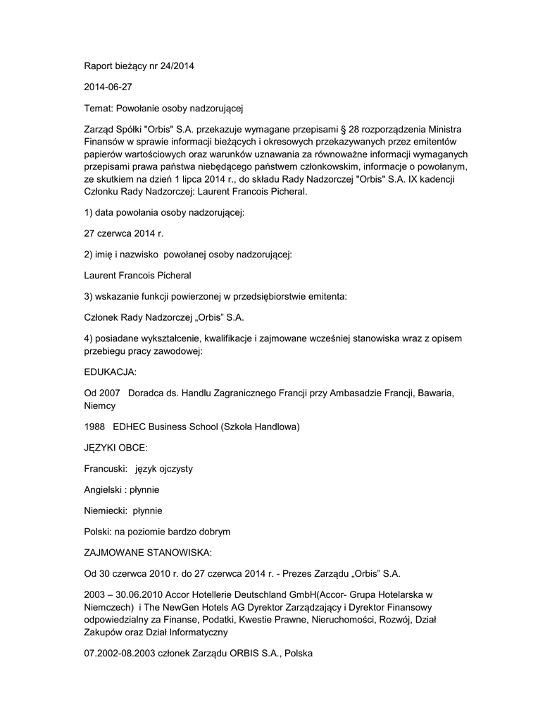 Raport bieżący nr 24/2014 2014-06-27 Temat: Powołanie osoby nadzorującej Zarząd Spółki "Orbis" S.A. przekazuje wymagane przepisami § 28 rozporządzenia Ministra Finansów w sprawie informacji bieżących i okresowych przekazywanych przez emitentów papierów wartościowych oraz warunków uznawania za równoważne informacji wymaganych przepisami prawa państwa niebędącego państwem członkowskim, informacje o powołanym, ze skutkiem na dzień 1 lipca 2014 r., do składu Rady Nadzorczej "Orbis" S.A. IX kadencji Członku Rady Nadzorczej: Laurent Francois Picheral. 1) data powołania osoby nadzorującej: 27 czerwca 2014 r. 2) imię i nazwisko powołanej osoby nadzorującej: Laurent Francois Picheral 3) wskazanie funkcji powierzonej w przedsiębiorstwie emitenta: Członek Rady Nadzorczej „Orbis” S.A. 4) posiadane wykształcenie, kwalifikacje i zajmowane wcześniej stanowiska wraz z opisem przebiegu pracy zawodowej: EDUKACJA: Od 2007 Doradca ds. Handlu Zagranicznego Francji przy Ambasadzie Francji, Bawaria, Niemcy 1988 EDHEC Business School (Szkoła Handlowa) JĘZYKI OBCE: Francuski: język ojczysty Angielski : płynnie Niemiecki: płynnie Polski: na poziomie bardzo dobrym ZAJMOWANE STANOWISKA: Od 30 czerwca 2010 r. do 27 czerwca 2014 r. - Prezes Zarządu „Orbis” S.A. 2003 – 30.06.2010 Accor Hotellerie Deutschland GmbH(Accor- Grupa Hotelarska w Niemczech) i The NewGen Hotels AG Dyrektor Zarządzający i Dyrektor Finansowy odpowiedzialny za Finanse, Podatki, Kwestie Prawne, Nieruchomości, Rozwój, Dział Zakupów oraz Dział Informatyczny 07.2002-08.2003 członek Zarządu ORBIS S.A., Polska 1997 – 2002 Accor SA, Paryż, Biuro Zarządu, Dyrektor Departamentu Audytu Wewnętrznego Grupy Accor na cały świat 1995 – 1997 Salustro Reydel Paris, Starszy Dyrektor Zarządzający we Francji i Starszy Dyrektor Operacyjny odpowiedzialny za biura rozwoju w Europie Centralnej 1993 – 1995 KPMG Audit ,Paryż, Dyrektor Departamentu Audytu i Finansów Korporacyjnych 1991 – 1993 KPMG Polska, Starszy Kierownik Nadzorujący w Departamencie Audytu i Finansów Korporacyjnych 1989 – 1991 KPMG Paris, Audytor Finansowy 5) wskazanie innej działalności wykonywanej poza przedsiębiorstwem emitenta, z oceną, czy jest w stosunku do niej konkurencyjna, oraz wskazaniem, czy osoba ta uczestniczy w spółce konkurencyjnej jako wspólnik spółki cywilnej, spółki osobowej lub jako członek organu spółki kapitałowej bądź uczestniczy w innej konkurencyjnej osobie prawnej jako członek jej organu: Pan Laurent Picheral wchodzi w skład Komitetu Wykonawczego Accor S.A. z siedzibą w Paryżu, pełniąc funkcję Dyrektora Wykonawczego odpowiedzialnego za region Europy Centralnej oraz pełni funkcję Prezesa Zarządu Accor Polska sp. z o.o. Nie jest to działalność konkurencyjna. Pan Laurent Picheral nie wykonuje innej działalności poza przedsiębiorstwem Emitenta, która byłaby w stosunku do niej konkurencyjna. Nie uczestniczy w spółce konkurencyjnej, jako wspólnik spółki cywilnej, spółki osobowej lub jako członek organu spółki kapitałowej. Nie uczestniczy w innej konkurencyjnej osobie prawnej jako członek jej organu. 6) informacje o wpisie powołanej osoby nadzorującej, zamieszczonym w Rejestrze Dłużników Niewypłacalnych, prowadzonym na podstawie ustawy o KRS: Nie dotyczy __________________________________________________________________________ ”Orbis" S.A. ul. Bracka 16, 00-028 Warszawa, zarejestrowana w Sądzie Rejonowym dla m.st. Warszawy XII Wydział Gospodarczy, KRS Rejestr Przedsiębiorców 0000022622, wysokość kapitału zakładowego: 92.154.016 zł (wpłacony w całości), NIP 526-025-04-69