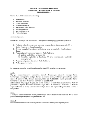 PROTOKÓŁ Z ZEBRANIA RADY RODZICÓW PRZEDSZKOLA „TĘCZOWY ŚWIAT” W POZNANIU Z DNIA 28.11.2013 r. W dniu 28.11.2013r. na zebraniu stawili się: 1. 2. 3. 4. 5. 6. 7. 8. Białka Hanna Andrzejak Grzegorz Kubiak Magdalena Kuczma Magdalena Dumkiewicz – Sikorska Anna Kaletka Magdalena Martinek Katarzyna Piechurska Agata co stanowi quorum. Posiedzenie otworzyła Pani Hanna Białka i zaproponowała następujący porządek spotkania: 1. Podjęcie uchwały w sprawie otwarcia nowego konta bankowego dla RR w Banku Pocztowym - Rada Rodziców; 2. Zmiana wyglądu i funkcjonalności strony www przedszkola - Paulina JamryGajda; 3. Prace nad preliminarzem wydatków - Rada Rodziców: a) podział wydatków z funduszu RR; b) hierarhia wydatków z funduszu RR oraz wyznaczenie wydatków strategicznych 4. Prezenty świąteczne dla dzieci - Rada Rodziców; 5. Wolne głosy i wnioski. Po przyjęciu porządku obrad Rada Rodziców (dalej RR) ustaliła, co następuje: Ad. 1. RR, po przeanalizowaniu wszystkich danych dotyczących otwarcia nowego konta bankowego, jednogłośnie podjęła decyzję o zmianie banku, w którym prowadzony będzie rachunek bankowy RR. Nowym bankiem, który od 01.12.2013r. będzie prowadził konto bankowe RR jest Bank Pocztowy – uchwała nr 4/2013-2014. Jednocześnie RR podjęła decyzję, że konto bankowe w dotychczasowym banku PKO BP prowadzone będzie do kooca miesiąca lutego 2014. Za zamknięcie rachunku w PKO BP odpowiedzialne są osoby upoważnione w tym banku do reprezentacji: Czubała Monika i Skręta Eliza. Ad. 2. Z uwagi na nieobecnośd Pani Pauliny Jamry-Gajda temat zmiany funkcjonalności strony www postanowiono przełożyd na kolejne zebranie RR. Ad. 3. a) Powrócono do tematu struktury wydatków z funduszu RR na poszczególne grupy. RR ustaliła, że po akceptacji przez RR kosztów, w porozumieniu z Dyrektor przedszkola, zorganizowane zostanie w nowym roku kalendarzowym wyjście do teatru na przedstawienie teatralne dedykowane dzieciom z I grupy. Za zebranie ofert i przedstawienie kosztów RR odpowiedzialna jest Pani Hanna Białka. Ad. 3. b) RR, po sugestii Pani Dyrektor, postanowiła nie ustalad hierarchii wydatków oraz wydatków strategicznych. W zamian za to członkowie RR zobowiązali się propagowad, wśród rodziców reprezentowanych przez siebie grup, informację o konieczności regularnego wpłacania składek na fundusz RR. Ad. 5. RR ustaliła, na poczet prezentów gwiazdkowych, jednolitą wartośd prezentów wraz z opakowaniem dla wszystkich dzieci w kwocie 30 zł/dziecko. Ponadto RR ustaliła, że rodzaj prezentu zostanie ustalony przez Rodziców w poszczególnych grupach i prezenty będą kupowane przez reprezentantów grup. Ad. 6. 1. Hanna Białka przedstawiła dwie propozycje: 1.1. Zorganizowanie przez rodziców przedstawienia – niespodzianki dla dzieci, w której rodzice będą odgrywad główne role. RR przyjęła pomysł i postanowiła wdrożyd do realizacji. Przedstawienie powinno się odbyd w dzieo powszedni dla wszystkich dzieci, aktorami będą wszyscy chętni do wzięcia udziału w przedsięwzięciu rodzice. Członkowie RR zobowiązali się przekazad informację na ten temat w swoich grupach. Osobą koordynującą całośd przedsięwzięcia jest Pani Hanna Białka; 1.2. Z okazji Dnia Dziecka zorganizowanie, dla całego przedszkola wraz z rodzicami, festynu na terenie ogródka przedszkolnego. Osobą koordynującą całośd przedsięwzięcia jest Pani Hanna Białka. 2. Magdalena Kubiak przedstawiła propozycję założenia fundacji przy przedszkolu, dzięki której możliwe byłoby pozyskiwanie dodatkowych środków finansowych (np. 1% podatku dochodowego). RR przyjęła pomysł i postanowiła rozpoznad temat. Osobą odpowiedzialną za przedstawienie na kolejnym zebraniu RR szczegółów dotyczących założenia fundacji oraz dokonanie stosownych ustaleo z Dyrektor przedszkola jest Pani Magdalena Kubiak Nie ustalono termin kolejnego zebrania RR, gdyż to uzależnione jest od tego czy dojdzie do spotkania z Radą Pedagogiczną przedszkola. Na tym zebranie zakooczono. Protokół sporządziła: ________________________________ Hanna Białka /Przewodnicząca RR/ UCHWAŁA NR 4/2013-2014 Rady Rodziców Przedszkola „Tęczowy Świat” w Poznaniu z dnia 28.11.2013r. w sprawie: zmiany banku w którym przechowywane są środki pieniężne funduszu Rady Rodziców. § 1. Rada Rodziców jednogłośnie uchwala zmianę banku, w którym przechowywane są środki pieniężne funduszu Rady Rodziców. § 2. Nowym bankiem, począwszy od 01.12.2013r. będzie: Bank Pocztowy, nr rachunku 85 1320 1351 2227 0597 2000 0001. §3. Wykonanie Uchwały, tym samym nadzór nad podpisaniem umowy z Bankiem oraz poinformowanie wszystkich Rodziców o dokonanej zmianie powierza się przewodniczącemu Rady Rodziców. § 4. Uchwała wchodzi w życie z dniem 28 listopada 2013r. Przewodniczący Rady Rodziców Hanna Białka
