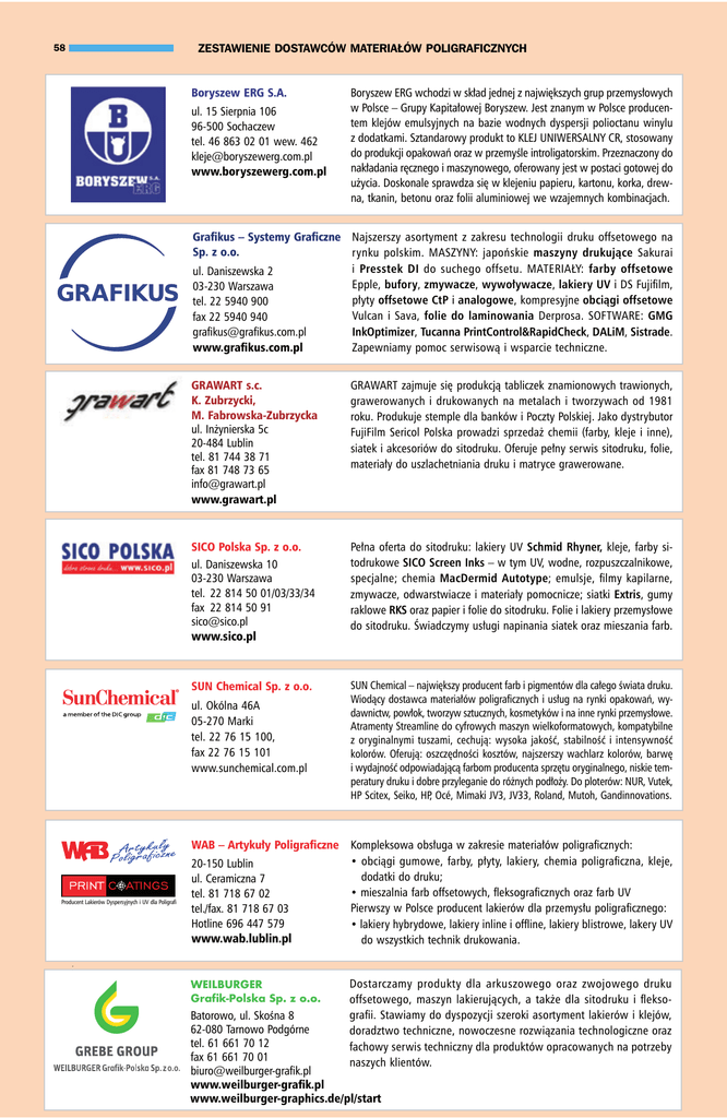 ZESTAWIENIE DOSTAWCÓW MATERIAŁÓW POLIGRAFICZNYCH 58 Boryszew ERG S.A. ul.15Sierpnia106 96-500Sochaczew tel.46 8630201wew.462 [email protected] www.boryszewerg.com.pl BoryszewERGwchodziwskładjednejznajwiększychgrupprzemysłowych wPolsce–GrupyKapitałowejBoryszew.Jestznanymw Polsceproducentemklejówemulsyjnychnabaziewodnychdyspersjipolioctanuwinylu z dodatkami.SztandarowyprodukttoKLEJUNIWERSALNYCR,stosowany doprodukcjiopakowańorazwprzemyśleintroligatorskim.Przeznaczonydo nakładaniaręcznegoimaszynowego,oferowanyjestw postacigotowejdo użycia.Doskonalesprawdzasięwklejeniupapieru,kartonu,korka,drewna,tkanin,betonuorazfoliialuminiowejwewzajemnychkombinacjach. Grafikus – Systemy Graficzne Najszerszy asortyment z zakresu technologii druku offsetowego na Sp. z o.o. rynku polskim. MASZYNY: japońskie maszyny drukujące Sakurai i Presstek DI do suchego offsetu. MATERIAŁY: farby offsetowe ul.Daniszewska2 Epple,bufory,zmywacze,wywoływacze,lakiery UViDSFujifilm, 03-230Warszawa płytyoffsetowe CtPianalogowe,kompresyjneobciągi offsetowe tel.225940900 Vulcan i Sava, folie do laminowania Derprosa. SOFTWARE: GMG fax225940940 InkOptimizer,Tucanna PrintControl&RapidCheck,DALiM,Sistrade. [email protected] www.grafikus.com.pl Zapewniamypomocserwisowąiwsparcietechniczne. GRAWART s.c. K. Zubrzycki, M. Fabrowska-Zubrzycka ul.Inżynierska5c 20-484Lublin tel.817443871 fax817487365 [email protected] www.grawart.pl GRAWARTzajmujesięprodukcjątabliczekznamionowychtrawionych, grawerowanych i drukowanych na metalach i tworzywach od 1981 roku.ProdukujestempledlabankówiPocztyPolskiej.Jakodystrybutor FujiFilm Sericol Polska prowadzi sprzedaż chemii (farby, kleje i inne), siatekiakcesoriówdositodruku.Oferujepełnyserwissitodruku,folie, materiałydouszlachetnianiadrukuimatrycegrawerowane. SICO Polska Sp. z o.o. ul.Daniszewska10 03-230Warszawa tel. 22 8145001/03/33/34 fax 22 8145091 [email protected] www.sico.pl Pełna oferta do sitodruku: lakiery UV Schmid Rhyner, kleje, farby sitodrukoweSICO Screen Inks–wtymUV,wodne,rozpuszczalnikowe, specjalne; chemia MacDermid Autotype; emulsje, filmy kapilarne, zmywacze,odwarstwiaczeimateriałypomocnicze;siatki Extris,gumy rakloweRKSorazpapierifoliedositodruku.Folieilakieryprzemysłowe dositodruku.Świadczymyusługinapinaniasiatekorazmieszaniafarb. SUN Chemical Sp. z o.o. SUNChemical–największyproducentfarbipigmentówdlacałegoświatadruku. Wiodącydostawcamateriałówpoligraficznychiusługnarynkiopakowań,wydawnictw,powłok,tworzywsztucznych,kosmetykówinainnerynkiprzemysłowe. AtramentyStreamlinedocyfrowychmaszynwielkoformatowych,kompatybilne z oryginalnymi tuszami, cechują: wysoka jakość, stabilność i intensywność kolorów.Oferują:oszczędnościkosztów,najszerszywachlarzkolorów,barwę i wydajnośćodpowiadającąfarbomproducentasprzętuoryginalnego,niskietemperaturydrukuidobreprzyleganiedoróżnychpodłoży.Doploterów:NUR,Vutek, HPScitex,Seiko,HP,Océ,MimakiJV3,JV33,Roland,Mutoh,Gandinnovations. ul.Okólna46A 05-270Marki tel.227615100, fax227615101 www.sunchemical.com.pl Producent Lakierów Dyspersyjnych i UV dla Poligrafi ś W I A T D R U K U WAB – Artykuły Poligraficzne Kompleksowaobsługawzakresiemateriałówpoligraficznych: • obciągi gumowe, farby, płyty, lakiery, chemia poligraficzna, kleje, 20-150Lublin dodatkidodruku; ul.Ceramiczna7 • mieszalniafarboffsetowych,fleksograficznychorazfarbUV tel.817186702 PierwszywPolsceproducentlakierówdlaprzemysłupoligraficznego: tel./fax.817186703 Hotline696447579 •lakieryhybrydowe,lakieryinlineioffline,lakieryblistrowe,lakeryUV www.wab.lublin.pl dowszystkichtechnikdrukowania. ZESTAWIENIE DOSTAWCÓW MATERIAŁÓW POLIGRAFICZNYCH 59 12/2 0 1 3 Dostarczamy produkty dla arkuszowego oraz zwojowego druku WEILBURGER Grafik-Polska Sp. z o.o. offsetowego, maszyn lakierujących, a także dla sitodruku i fleksografii.Stawiamydodyspozycjiszerokiasortymentlakierówiklejów, Batorowo,ul.Skośna8 62-080TarnowoPodgórne doradztwotechniczne,nowoczesnerozwiązaniatechnologiczneoraz tel.616617012 fachowyserwistechnicznydlaproduktówopracowanychnapotrzeby fax616617001 naszychklientów. [email protected] www.weilburger-grafik.pl www.weilburger-graphics.de/pl/start