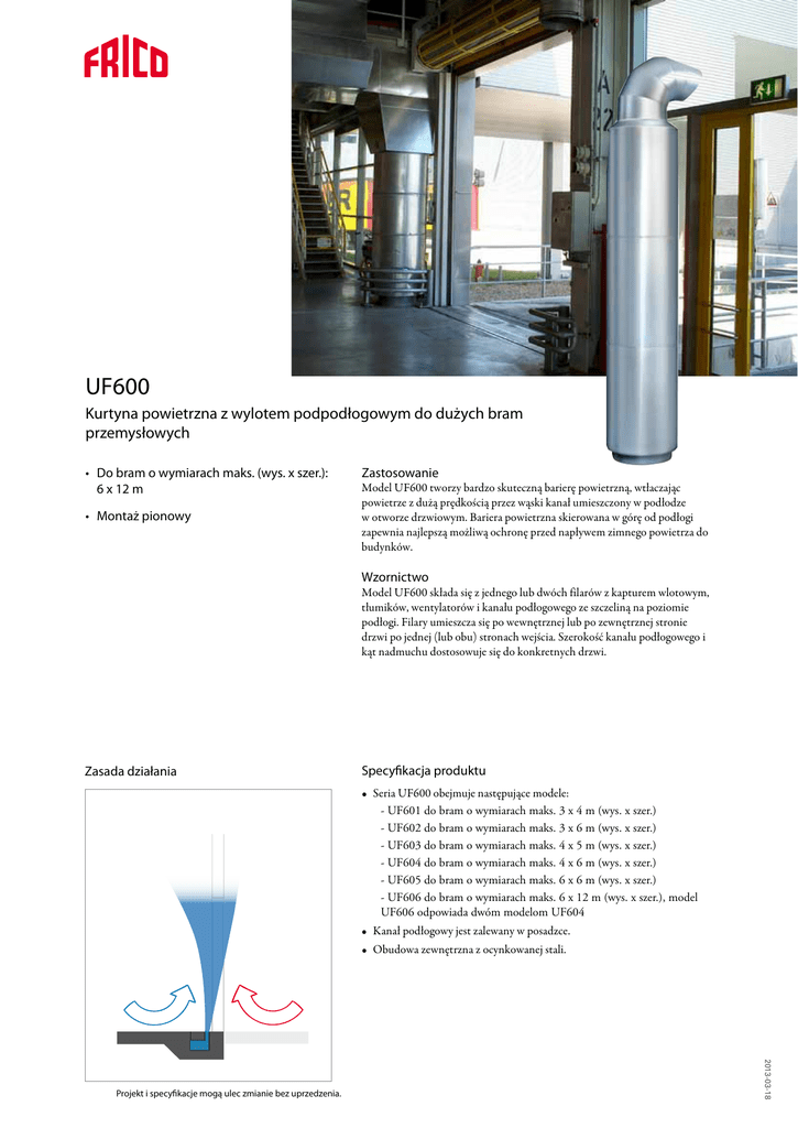 UF600 UF600 Kurtyna powietrzna z wylotem podpodłogowym do dużych bram przemysłowych • Do bram o wymiarach maks. (wys. x szer.): 6 x 12 m • Montaż pionowy Zastosowanie Model UF600 tworzy bardzo skuteczną barierę powietrzną, wtłaczając powietrze z dużą prędkością przez wąski kanał umieszczony w podłodze w otworze drzwiowym. Bariera powietrzna skierowana w górę od podłogi zapewnia najlepszą możliwą ochronę przed napływem zimnego powietrza do budynków. Wzornictwo Model UF600 składa się z jednego lub dwóch filarów z kapturem wlotowym, tłumików, wentylatorów i kanału podłogowego ze szczeliną na poziomie podłogi. Filary umieszcza się po wewnętrznej lub po zewnętrznej stronie drzwi po jednej (lub obu) stronach wejścia. Szerokość kanału podłogowego i kąt nadmuchu dostosowuje się do konkretnych drzwi. Zasada działania Specyfikacja produktu • Seria UF600 obejmuje następujące modele: - UF601 do bram o wymiarach maks. 3 x 4 m (wys. x szer.) - UF602 do bram o wymiarach maks. 3 x 6 m (wys. x szer.) - UF603 do bram o wymiarach maks. 4 x 5 m (wys. x szer.) - UF604 do bram o wymiarach maks. 4 x 6 m (wys. x szer.) - UF605 do bram o wymiarach maks. 6 x 6 m (wys. x szer.) - UF606 do bram o wymiarach maks. 6 x 12 m (wys. x szer.), model UF606 odpowiada dwóm modelom UF604 • Kanał podłogowy jest zalewany w posadzce. • Obudowa zewnętrzna z ocynkowanej stali. 2013-03-18 Projekt i specyfikacje mogą ulec zmianie bez uprzedzenia. UF600 Dane techniczne 1 Bez ogrzewania - UF600 Typ Moc silnika [kW] Wydajność powietrza [m3/h] Napięcie [V] [A] [mm] [mm] UF601 8 (2x4) 10500 400V3~ 16,0 3900 700 3x4 UF602 11 (2x5,5) 12000 400V3~ 22,4 3900 700 3x6 Natężenie Długość Średnica Max. wymiary bramy HxW [m] UF603 15 (2x7,5) 15000 400V3~ 28,2 4145 900 4x5 UF604 22 (2x11) 18000 400V3~ 42,0 4145 900 4x6 UF605 30 (2x15) 23000 400V3~ 56,8 4145 900 6x6 UF606* 2x22 (4x11) 36000 400V3~ 2x42,0 4145 900 6 x 12 *) Model UF606 odpowiada dwóm modelom UF604. Stopień ochrony: IPX4. Certyfikat CE. Wymiary D C B W przypadku montażu w pomieszczeniu, wlot powietrza powinien znajdować się nad otworem drzwiowym, co wymaga niekiedy przedłużenia kolumny. Przedłużenie kolumny w dowolnej długości można zamówić w firmie Frico. 150 A C E A [mm] B [mm] C [mm] D [mm] E [mm] UF601-UF602 3750 700 500 830 600x600 UF603-UF605 3995 900 630 945 750x750 Model UF606 odpowiada dwóm modelom UF604. UF600 Montaż i podłączenie Kolumna wentylatora Kolumnę wentylatora można umieścić po dowolnej stronie wejścia. W przypadku dużych wejść często wymagane są dwie kolumny, które należy ustawić po obu stronach. W przypadku ustawienia dwóch urządzeń po obu stronach wejścia, kanał podłogowy należy przedzielić na środku ścianką stalową, aby wentylatory nie kolidowały ze sobą. Kanał podłogowy Kanał podłogowy to konstrukcja stalowa zalewana w posadzce betonowej. Otwór wylotowy znajduje się na poziomie podłogi, jak najbliżej otworu podłogowego. Długość kanału oraz kąt i szerokość kolumny określa się na etapie projektowania. Zazwyczaj nie trzeba wykonywać odpływu. W razie ryzyka gromadzenia się dużych ilości wody w kanale podłogowym, do istniejącego przyłącza 1” (gwint wewnętrzny) należy podłączyć rurę odpływową. Szczelina kurtyny powietrznej Aby zniwelować skierowaną do wewnątrz siłę ciśnienia, szczelina kurtyny powietrznej jest skierowana na zewnątrz pod kątem około 15°. Szczelina kurtyny powietrznej powinna być co najmniej o 200 mm szersza, niż otwór drzwiowy. Jeśli odległość między szczeliną kurtyny powietrznej i drzwiami przekracza 150 mm, obok drzwi należy zamontować wewnętrzne osłony drzwiowe (patrz rysunek). Ścianka stalowa Rozmieszczenie kolumn. Skrzynka rozdzielcza Skrzynka kanału podłogowego Właz rewizyjny Wszystkie rzuty i wymiarowanie należy konsultować z firmą Frico! Kanał podłogowy dla jednej kolumny. Skrzynka kanału podłogowego Beton 100 600 250 Szczelina kurtyny powietrznej 600 800 Przekrój poprzeczny kanału podłogowego dla modeli UF601-602. min 100 Osłona drzwiowa Szczelina kurtyny powietrznej <150 min 100 Otwór drzwiowy Szczelina kurtyny powietrznej UF600 Wymiarowanie 8 Wysokość drzwi [m] Kurtynę powietrzną można wybrać za pomocą zamieszczonego na tej stronie wykresu. Wykres dotyczy obliczonego podciśnienia 8 Pa i zewnętrznego kąta 15° dla szczeliny kurtyny powietrznej. Wyróżnione pole przedstawia standardowy obszar roboczy. 7 UF605 6 UF604 5 UF603 4 UF602 UF601 3 2 1 0 0 1 2 3 4 5 6 7 8 Szerokość drzwi [m] 0 2 4 6 8 10 12 14 16 Model UF606 odpowiada dwóm modelom UF604. Szerokość drzwi [m] Wydajność Szacunkowa wydajność energetyczna wynosi około 75%. Oznacza to możliwość ograniczenia strat ciepła do 25% w stosunku do drzwi niezabezpieczonych. Wykresy przedstawiają wahania temperatury w czasie wewnątrz otwartych drzwi oraz w różnych odległościach w pomieszczeniu (4 i 20 metrów) i na różnych wysokościach nad podłogą. Warunki: Drzwi Budynki Temperatura zewnętrzna Podciśnienie 4x4m 2000 m² 0 °C 4 Pa Z kurtyną UF600 Drzwi niezabezpieczone 4 m wewnątrz budynków 20 m wewnątrz budynków 10 cm nad podłogą 10 cm nad podłogą [°C] 20 [°C] 20 18 18 16 16 14 14 12 12 10 10 8 6 8 0 1 2 3 4 5 6 7 8 9 10 [min] [min] 6 0 150 cm nad podłogą 2 3 4 5 6 7 8 9 10 2 3 4 5 6 7 8 9 10 150 cm nad podłogą [°C] 20 [°C] 20 18 18 16 16 14 14 12 12 10 10 8 6 1 8 0 1 2 3 4 5 6 7 8 9 10 [min] 6 0 1 [min] UF600 Opcje sterowania Kurtyna powietrzna UF600 jest wyposażona w zestaw rozruchowy UFC600. W kurtynach powietrznych UF601 stosuje się zestaw rozruchowy UFC601, w kurtynach UF602 stosuje się zestaw UFC602 itd. Model UF606 odpowiada dwóm modelom UF604 i musi być sterowany przez cztery zestawy UFC604. Sterowanie i akcesoria UFC600 AGB304 UFC601/602, zestaw rozruchowy AGB304, czujnik krańcowy Opóźnienie czasowe między silnikami przy rozruchu. Mo